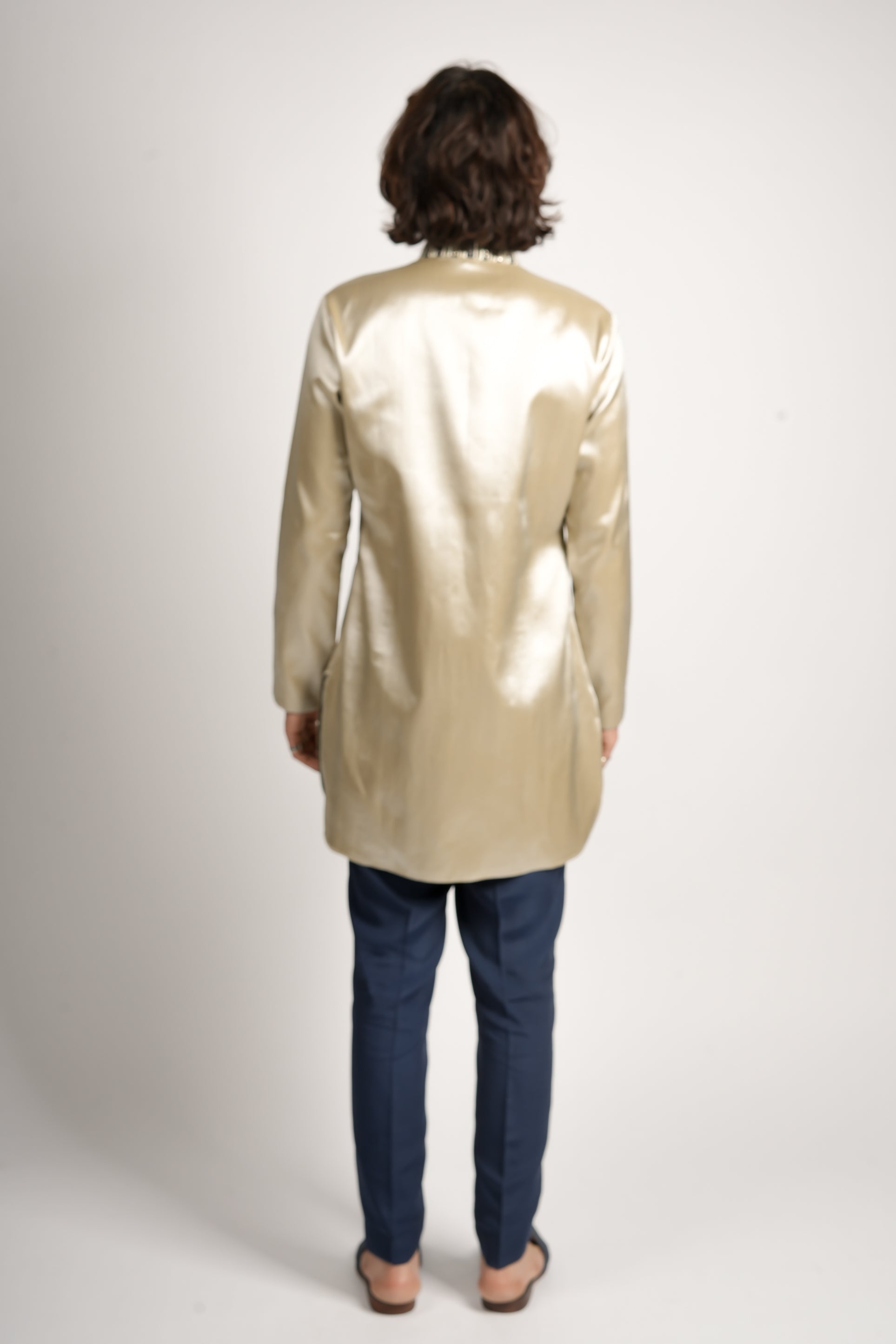 This is a refined contrast look featuring a long-sleeved, straight kurta in a metallic fabric. The kurta's band collar is accented with white contrast embroidery on blue. It is paired elegantly with deep navy blue tailored trousers, creating a sophisticated and modern evening ensemble.
