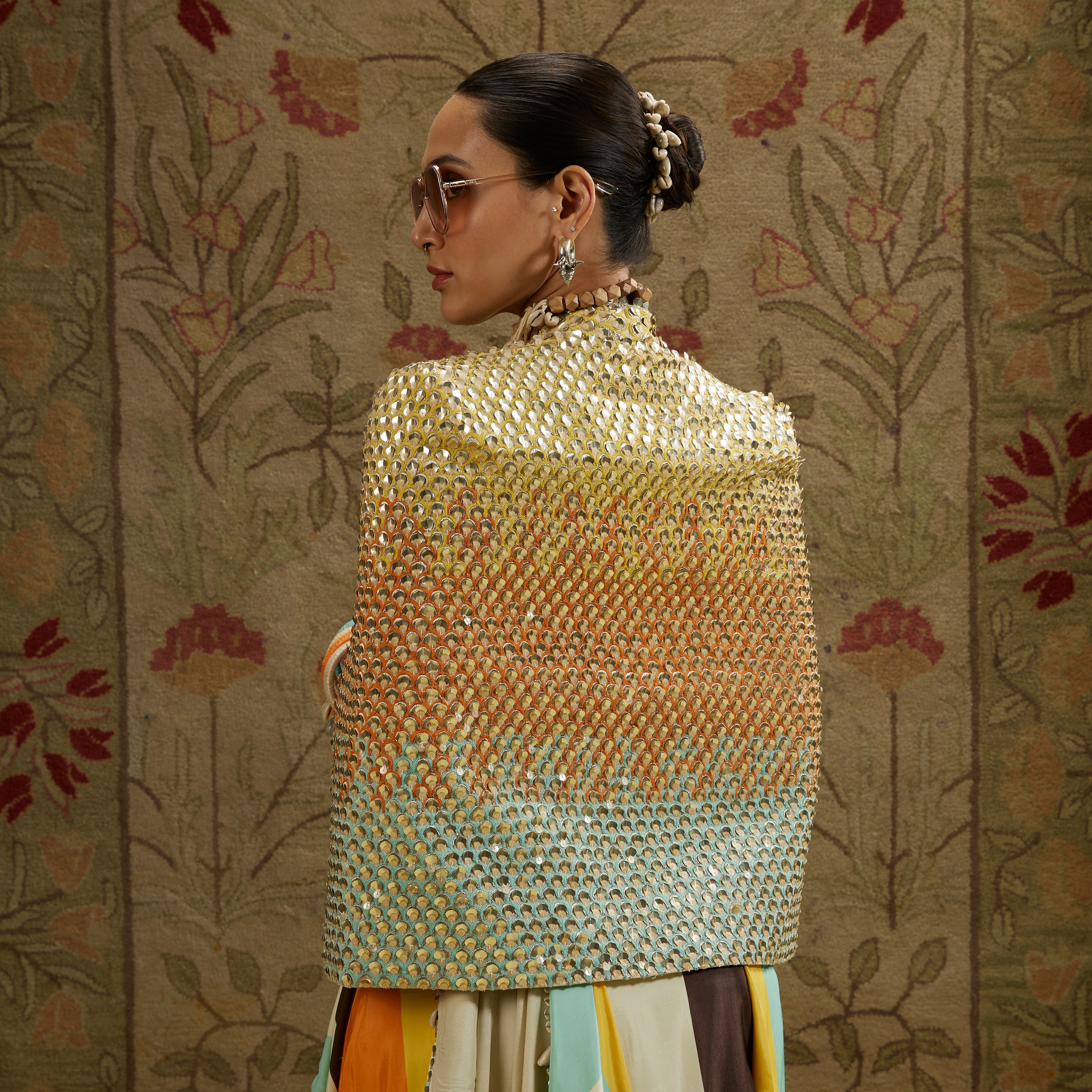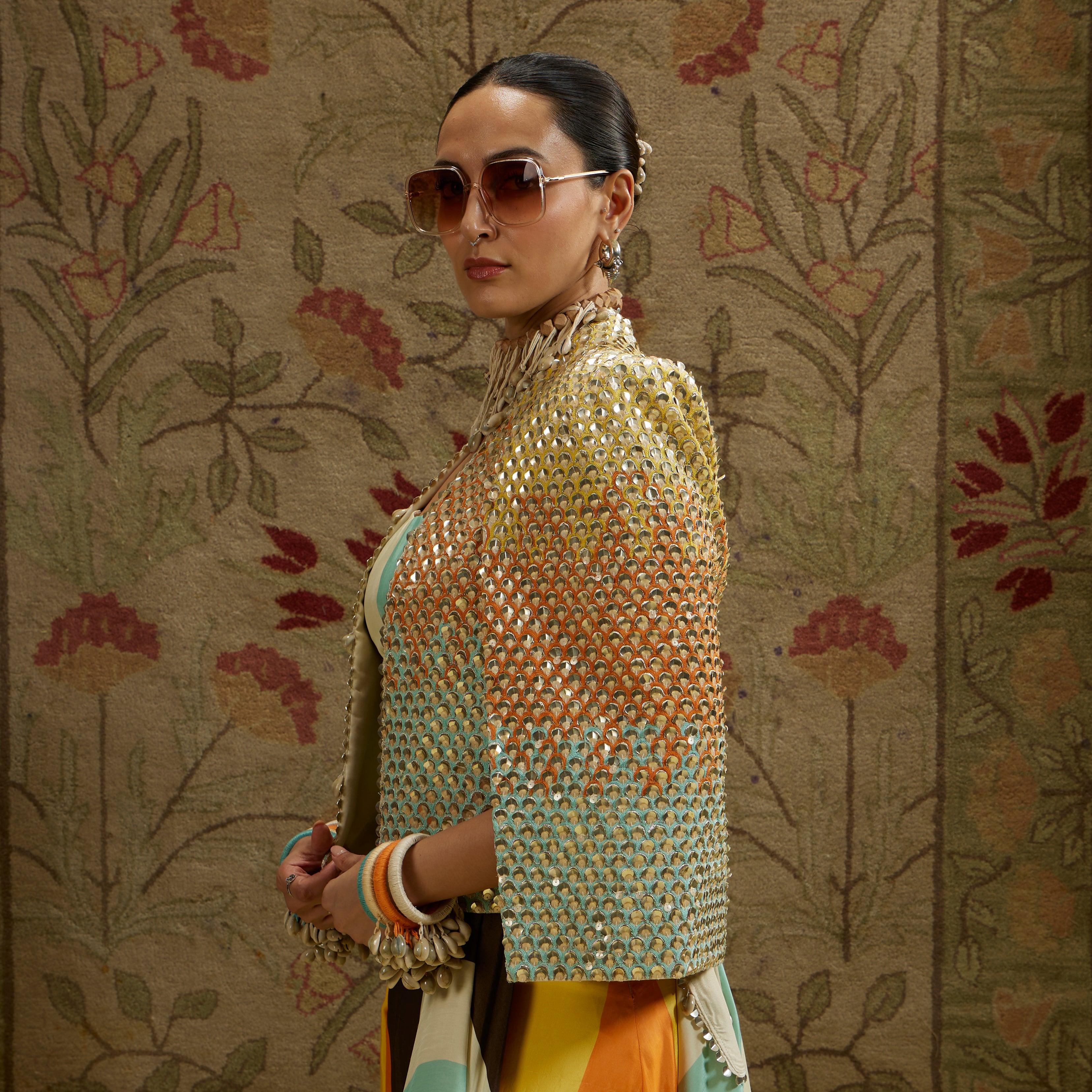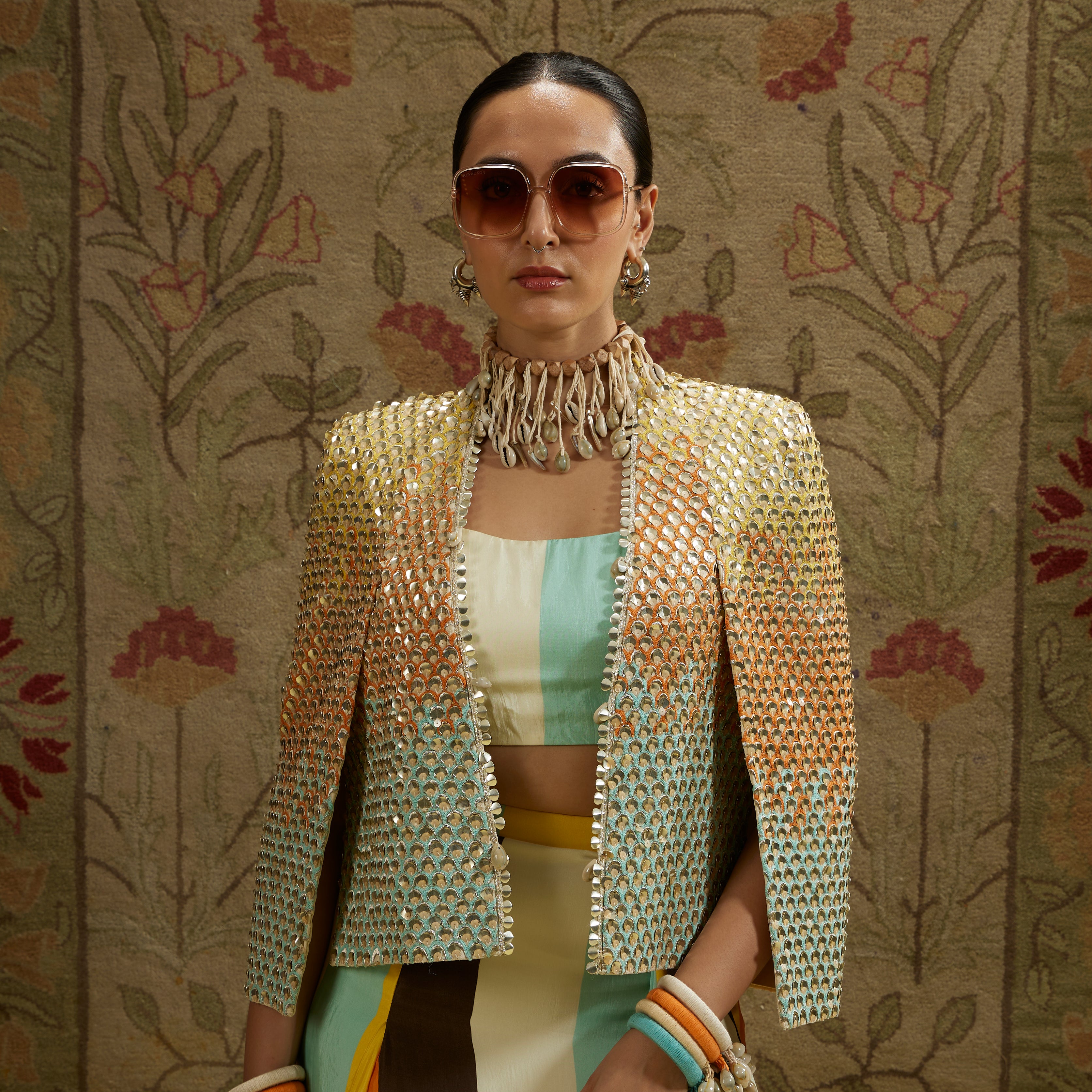 MULTI COLORED METALLIC NOOR JACKET PAIRED WITH STRIPE PRINTED BUSTIER AND SKIRT