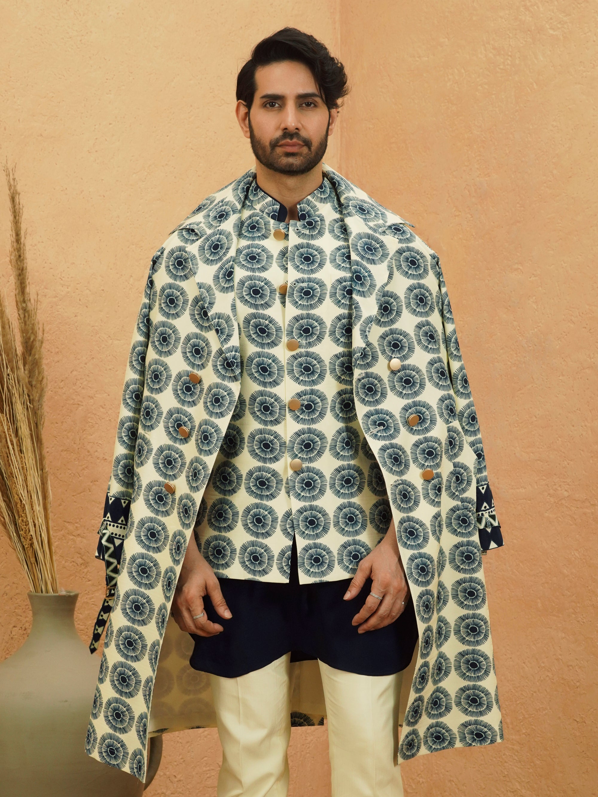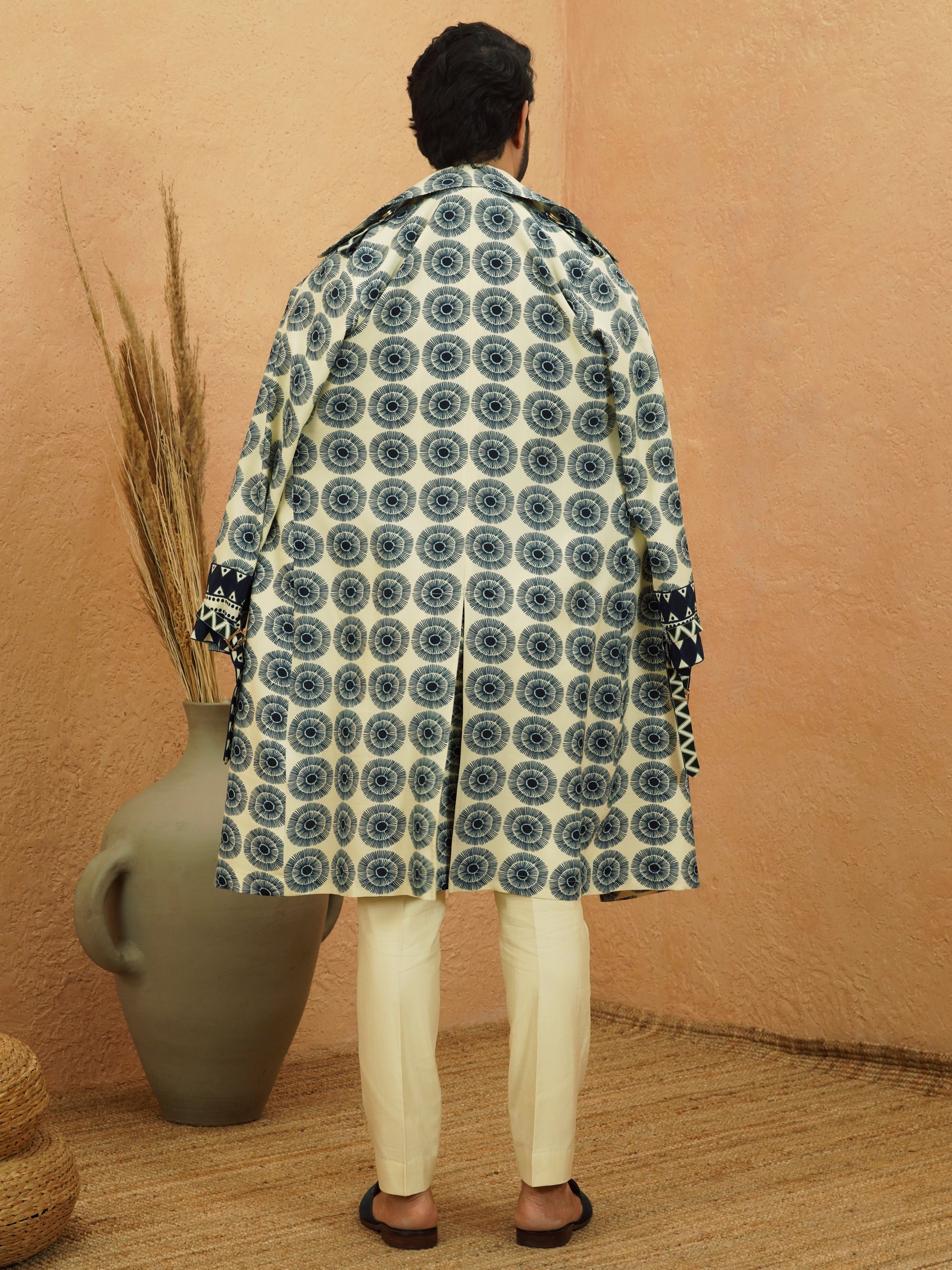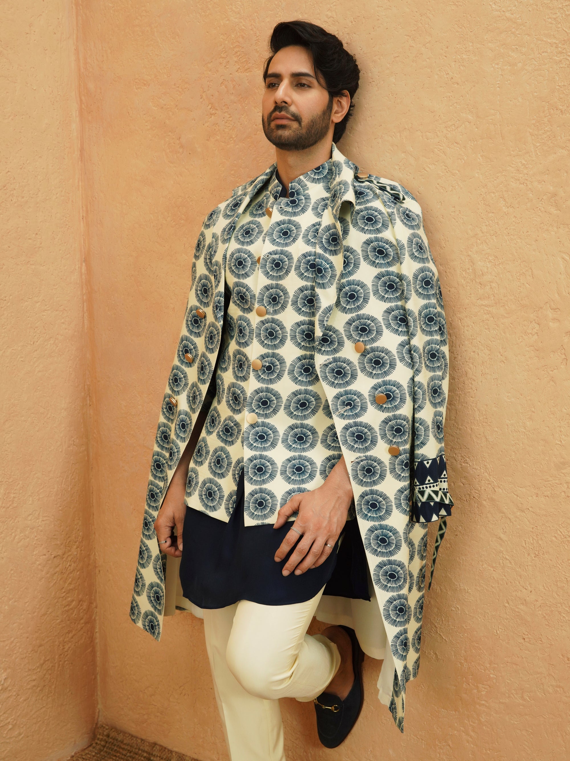 This statement trench coat features bold, protea navy motifs on a crisp ivory base. Its structured silhouette and subtle detailing bring together classic elegance and modern flair, making it a standout piece for festive or formal occasions.