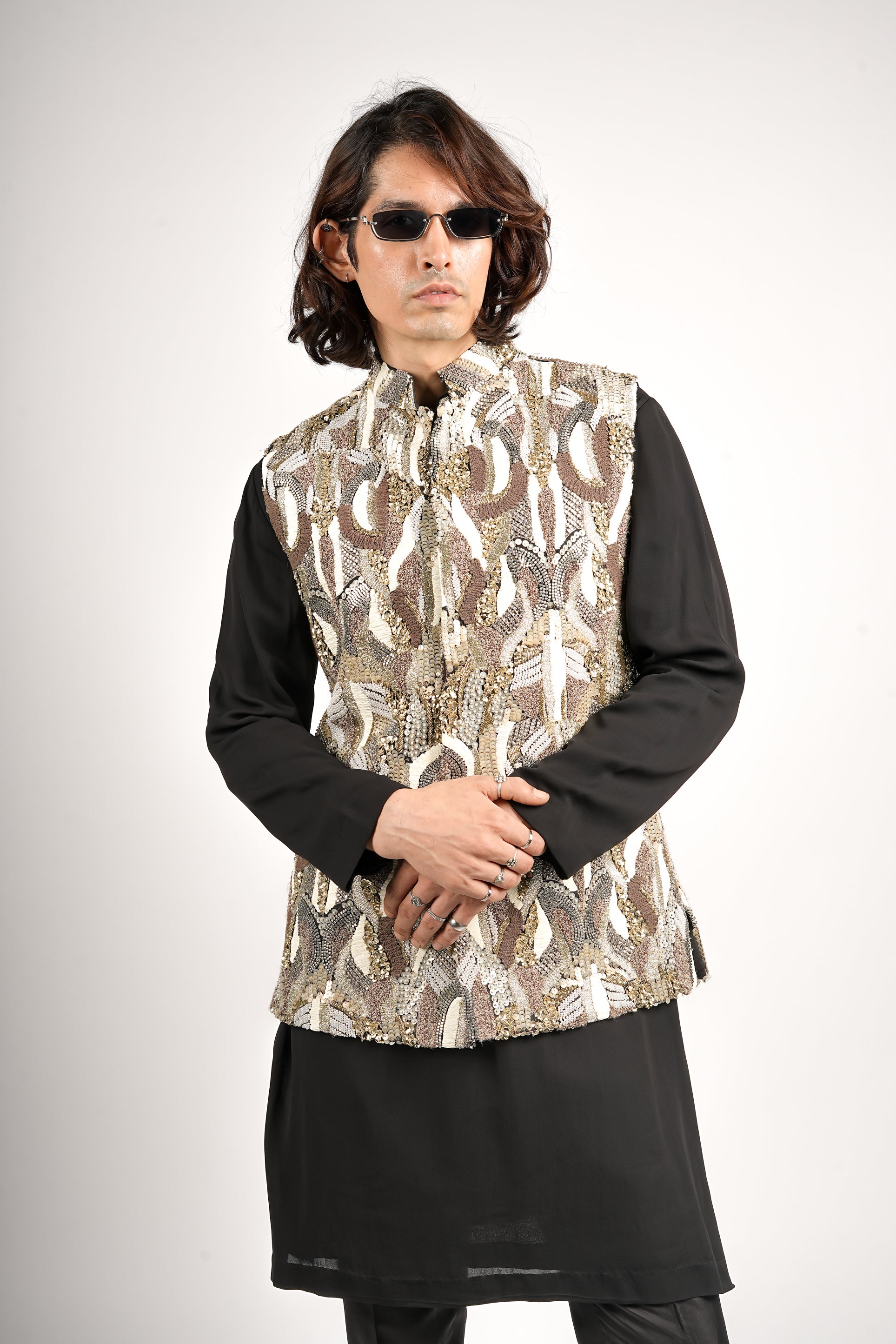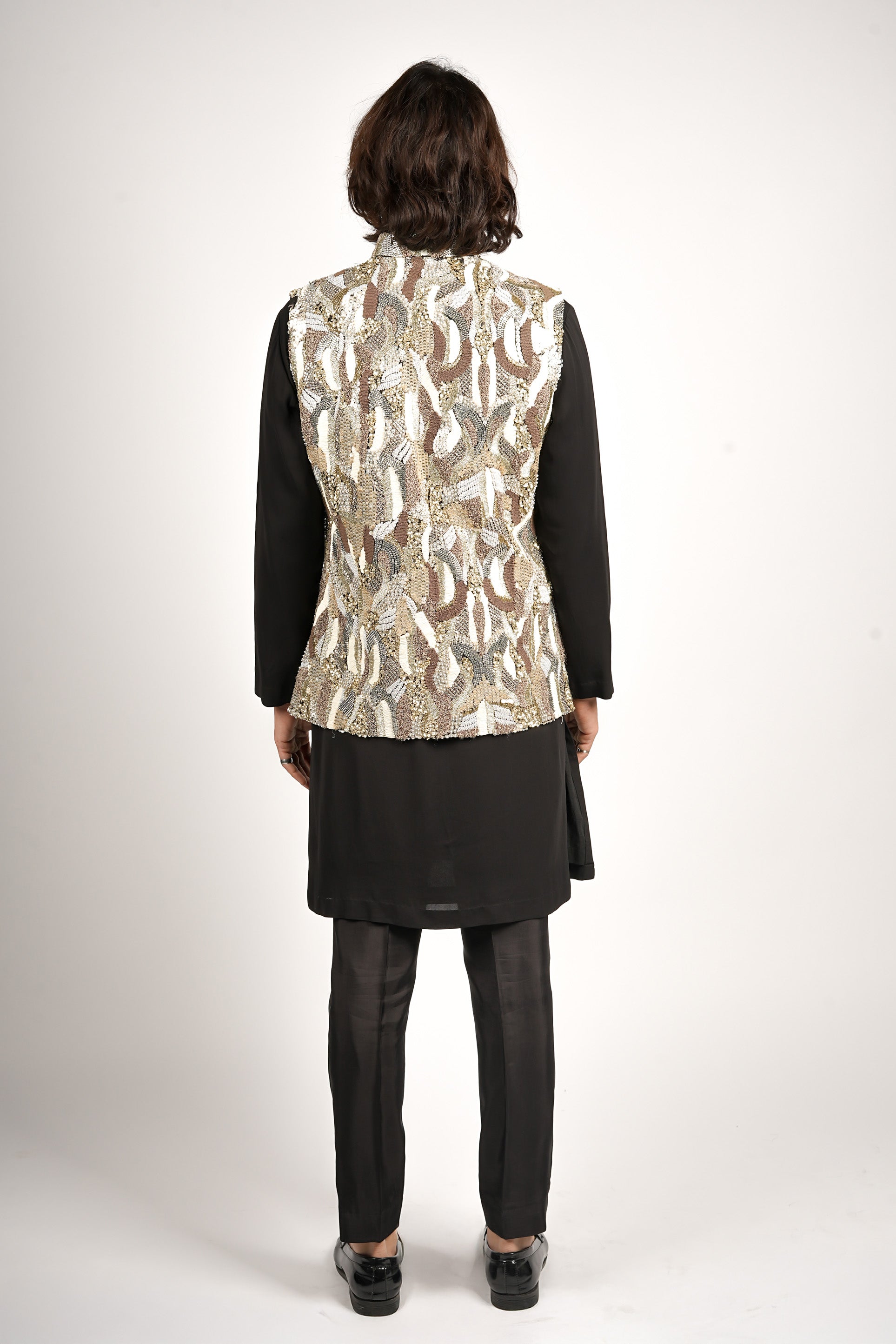 An abstract embellished textured bundi with metallic accents and intricate threadwork, paired with sleek black kurta pants. A modern, luminous look that blends subtle structure with festive elegance.