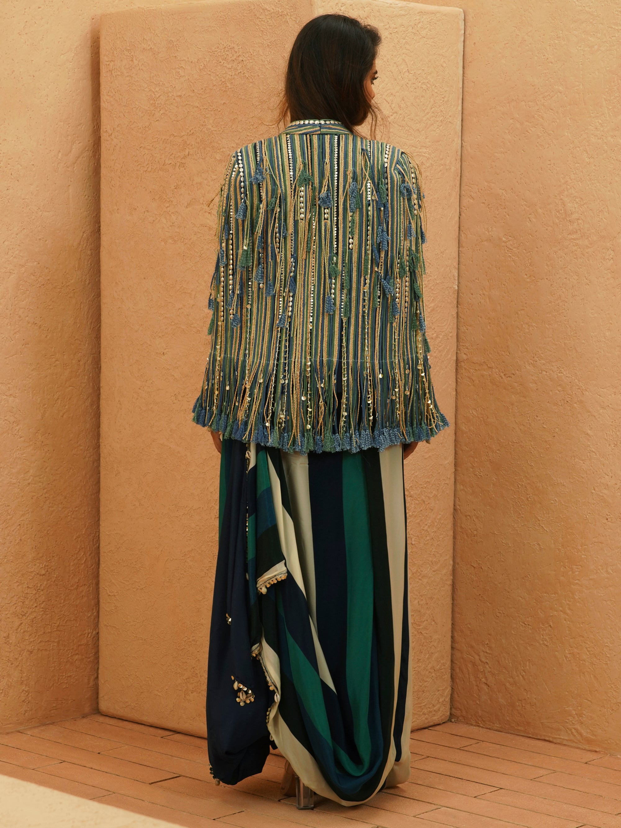 NIA FRINGES CAPE JACKET WITH PRINTED DRAPE SKIRT AND BUSTIER