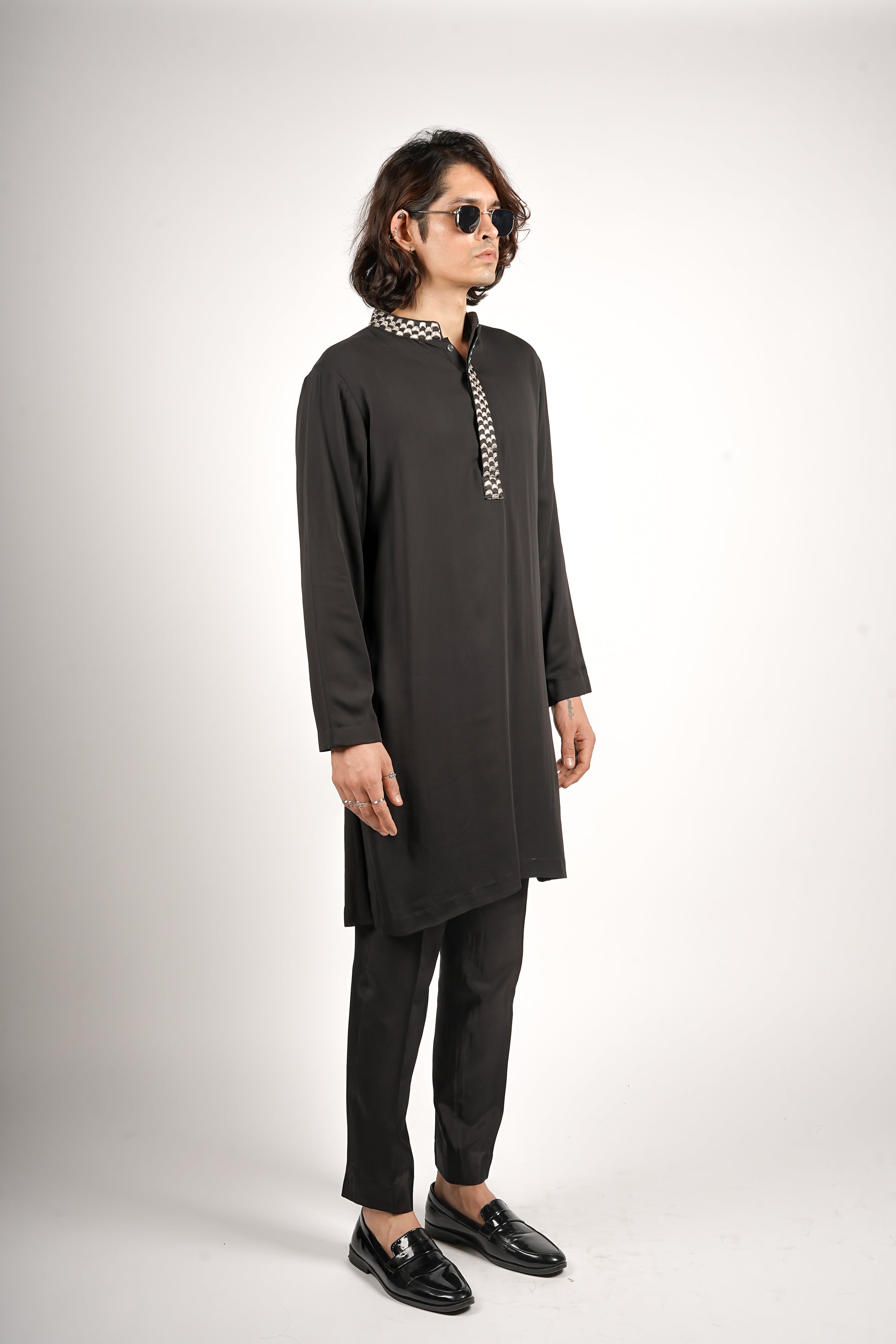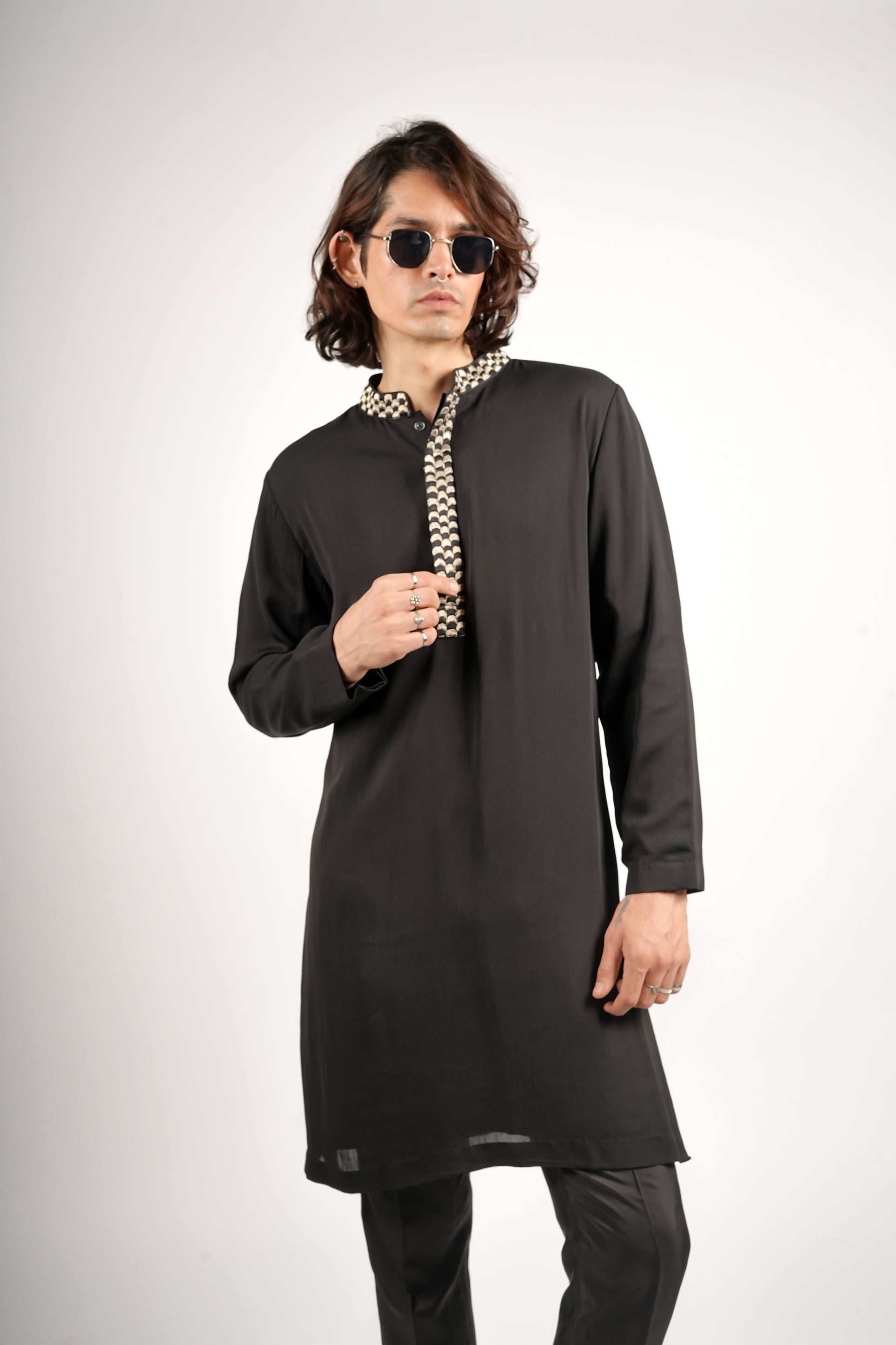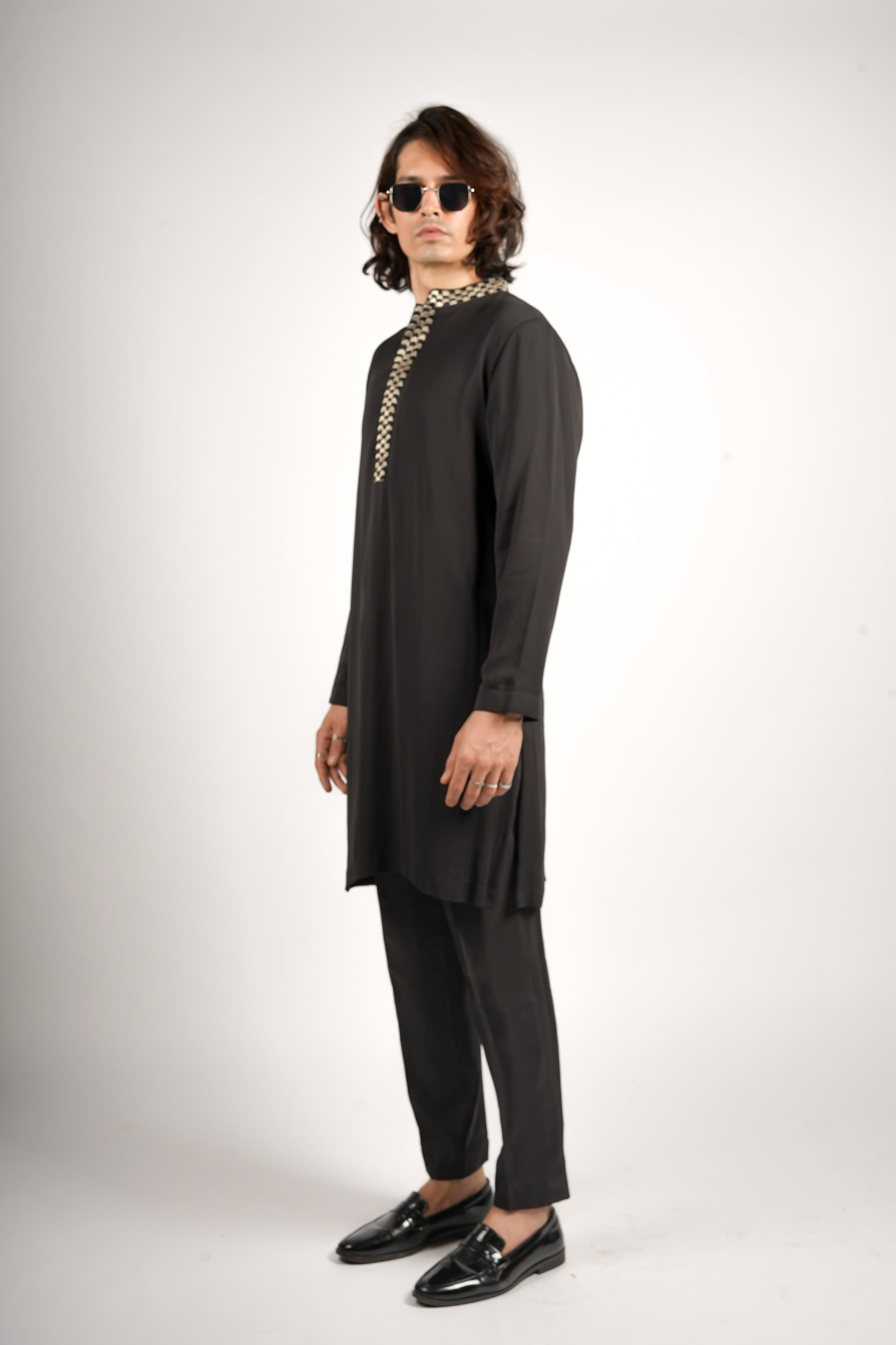 A sleek black kurta set elevated with a geometric embellished placket, paired with pants. Minimal, modern, and effortlessly refined perfect for contemporary festive dressing.