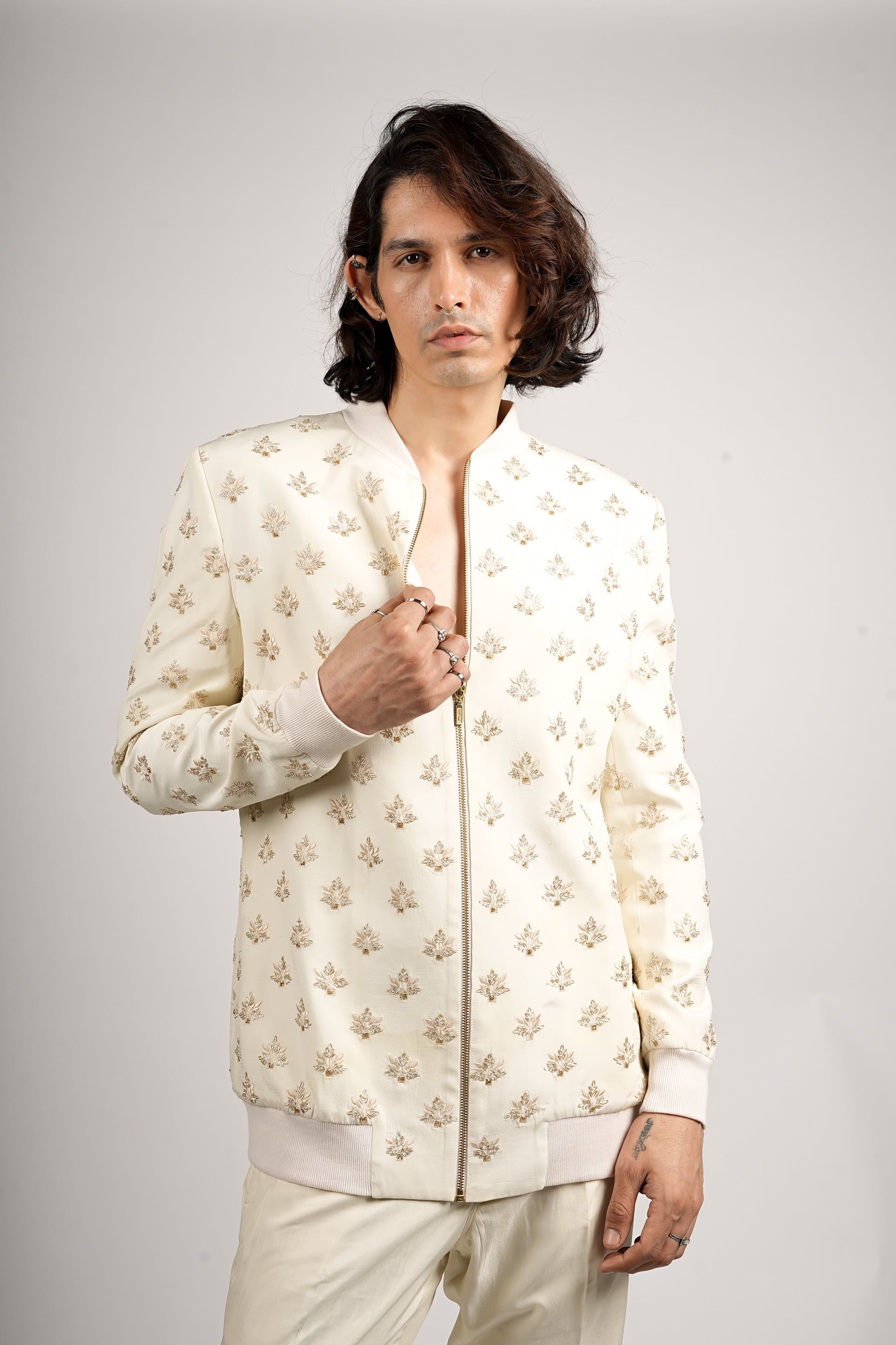 An ivory bomber jacket adorned with delicate gold motifs, paired with sleek trousers for a clean, sophisticated festive look.