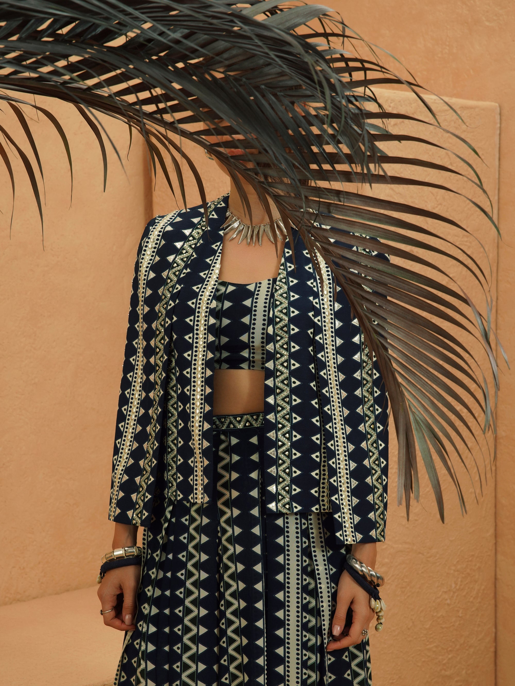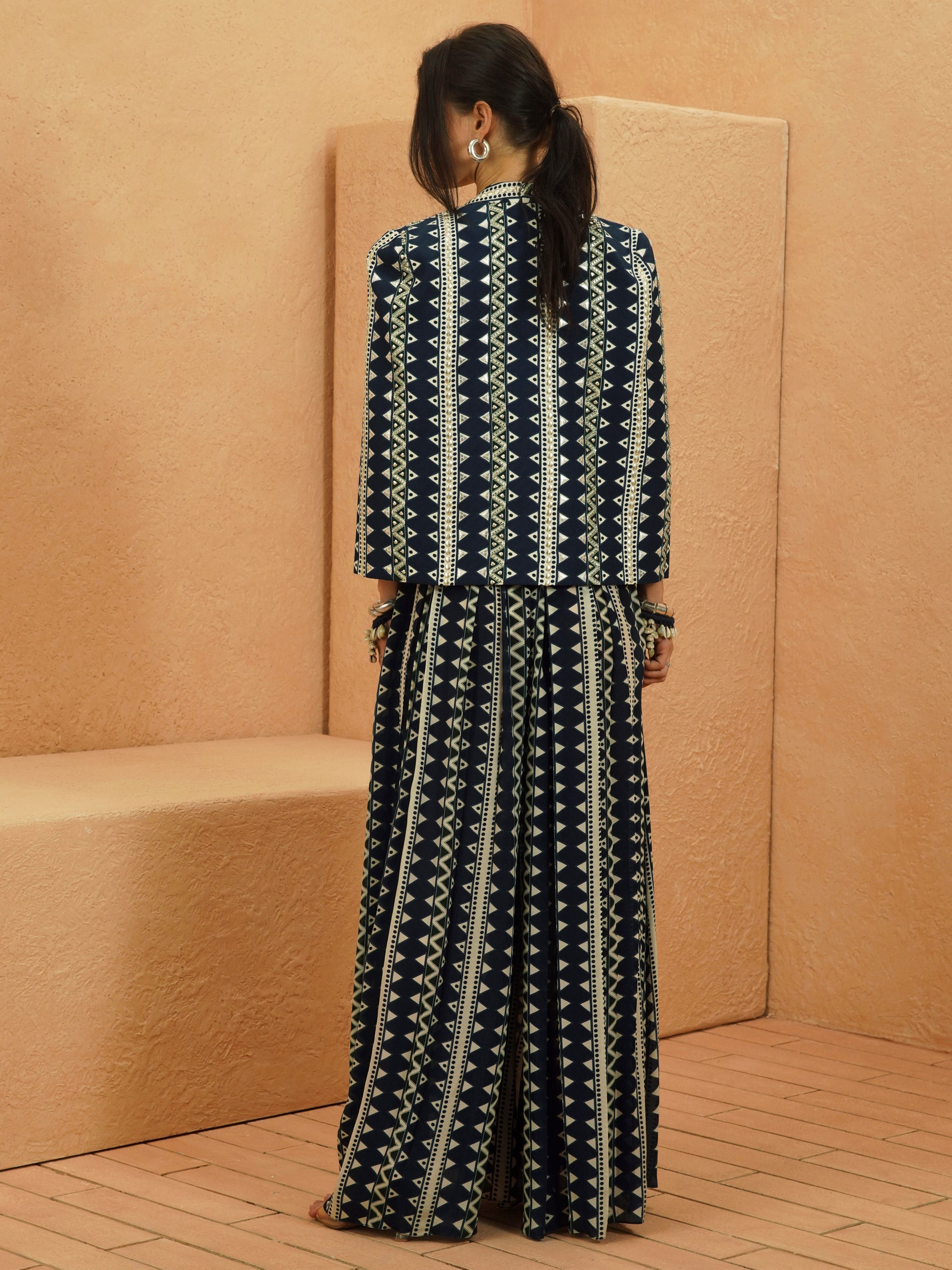 A geometric-printed cape jacket, creating a coordinated yet effortless ensemble. The structured silhouette is balanced with intricate tribal-inspired patterns, exuding a modern bohemian charm.
