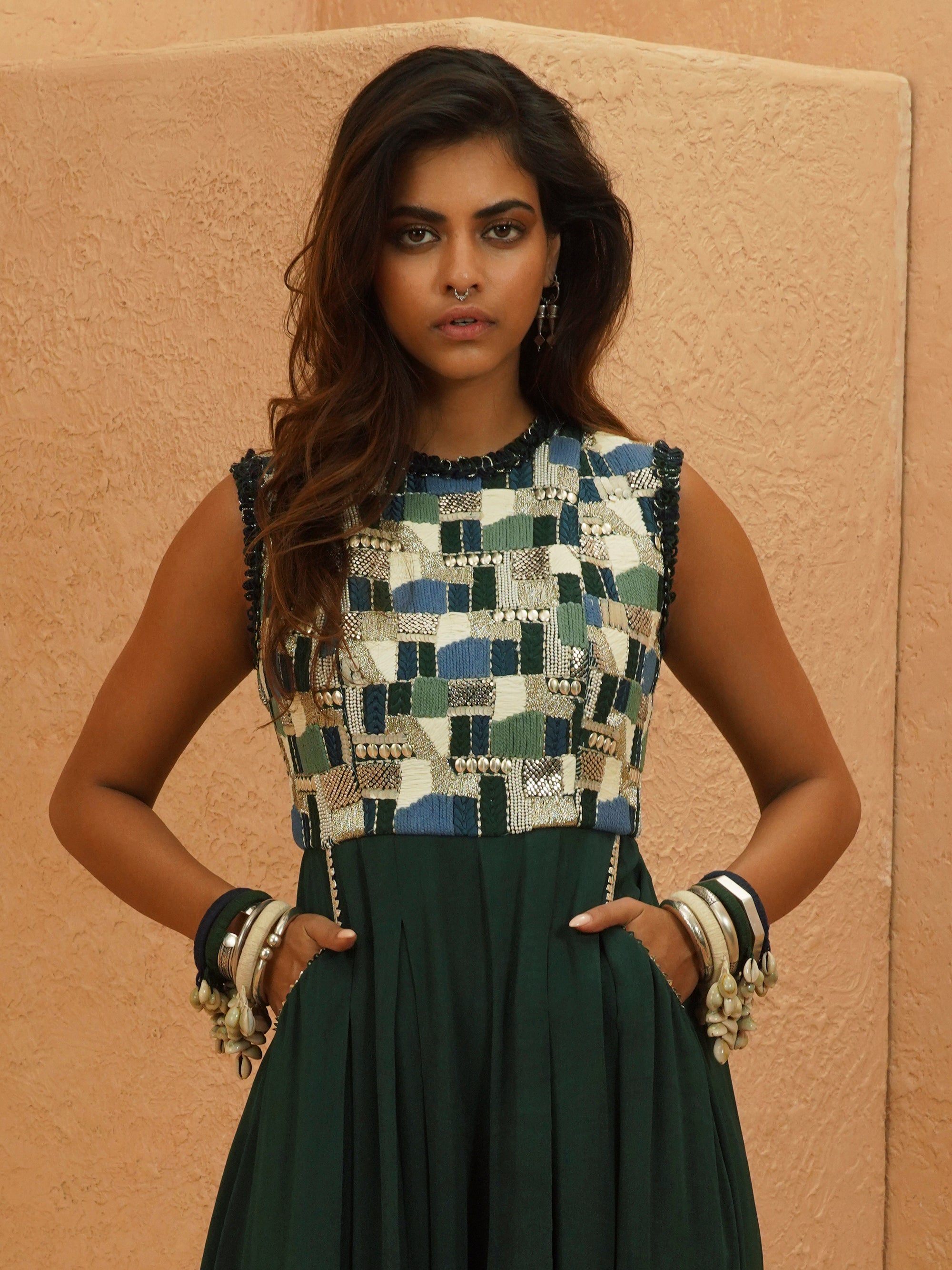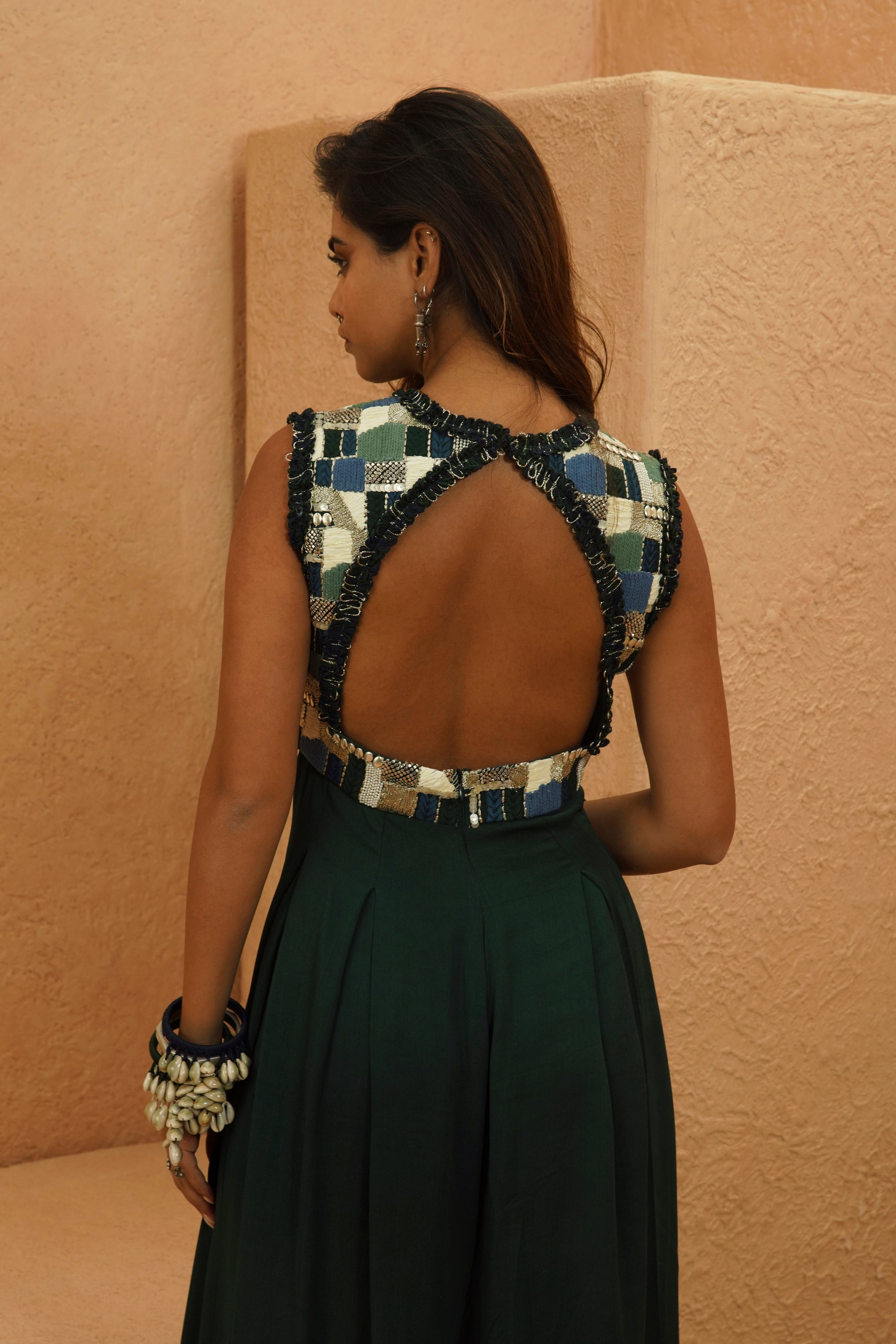 A statement jumpsuit featuring a hand-embroidered bodice and flowing emerald green pants, blending modern elegance with artisanal craftsmanship.