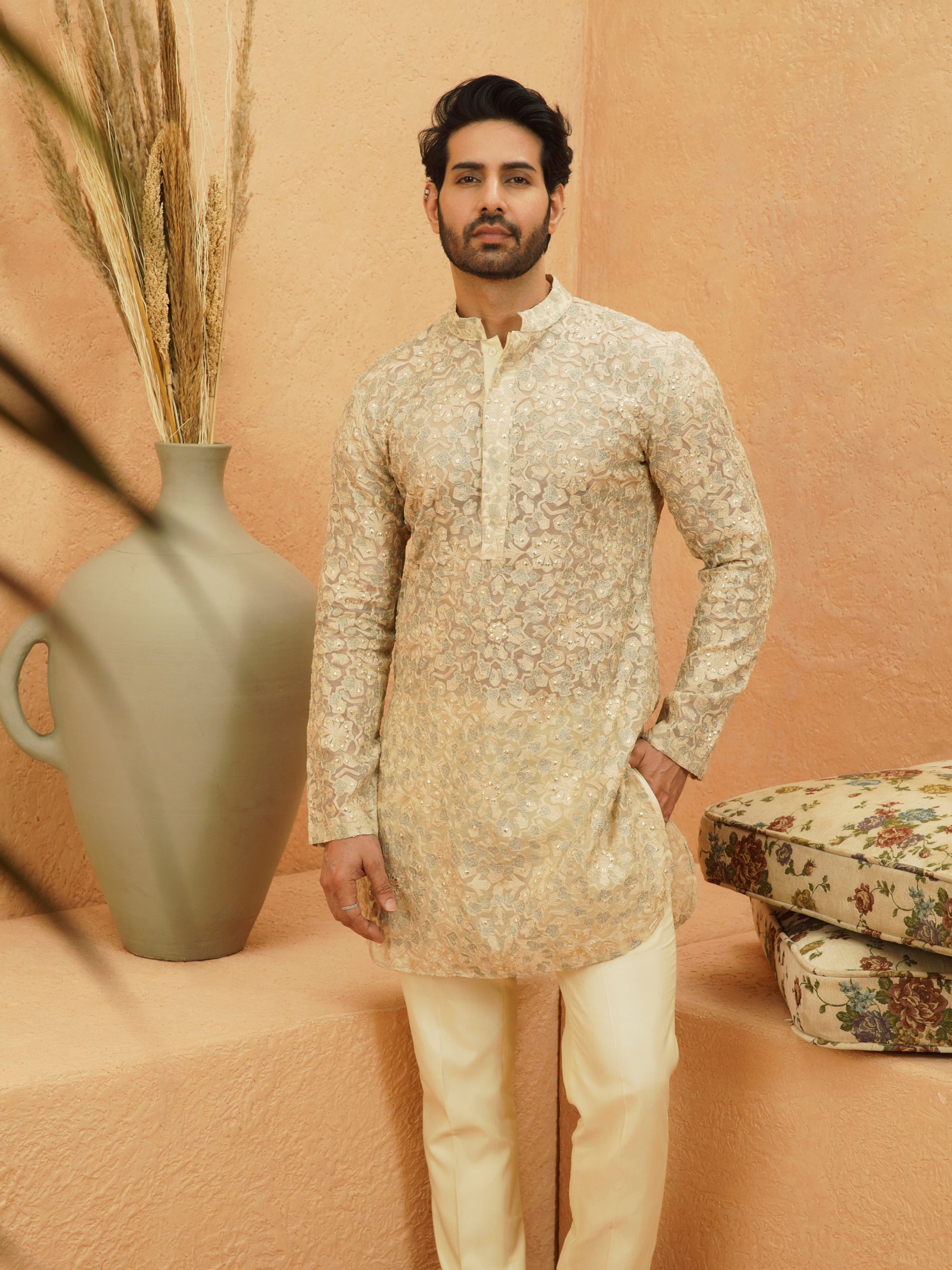 This sheer kurta set exudes understated luxury with its intricate tonal embroidery on a soft, neutral base. The classic straight-cut kurta features delicate threadwork, adding a touch of elegance, while the crisp ivory trouser provide a sophisticated contrast. Perfect for festive celebrations and intimate gatherings, this ensemble is a timeless blend of tradition and modern refinement.