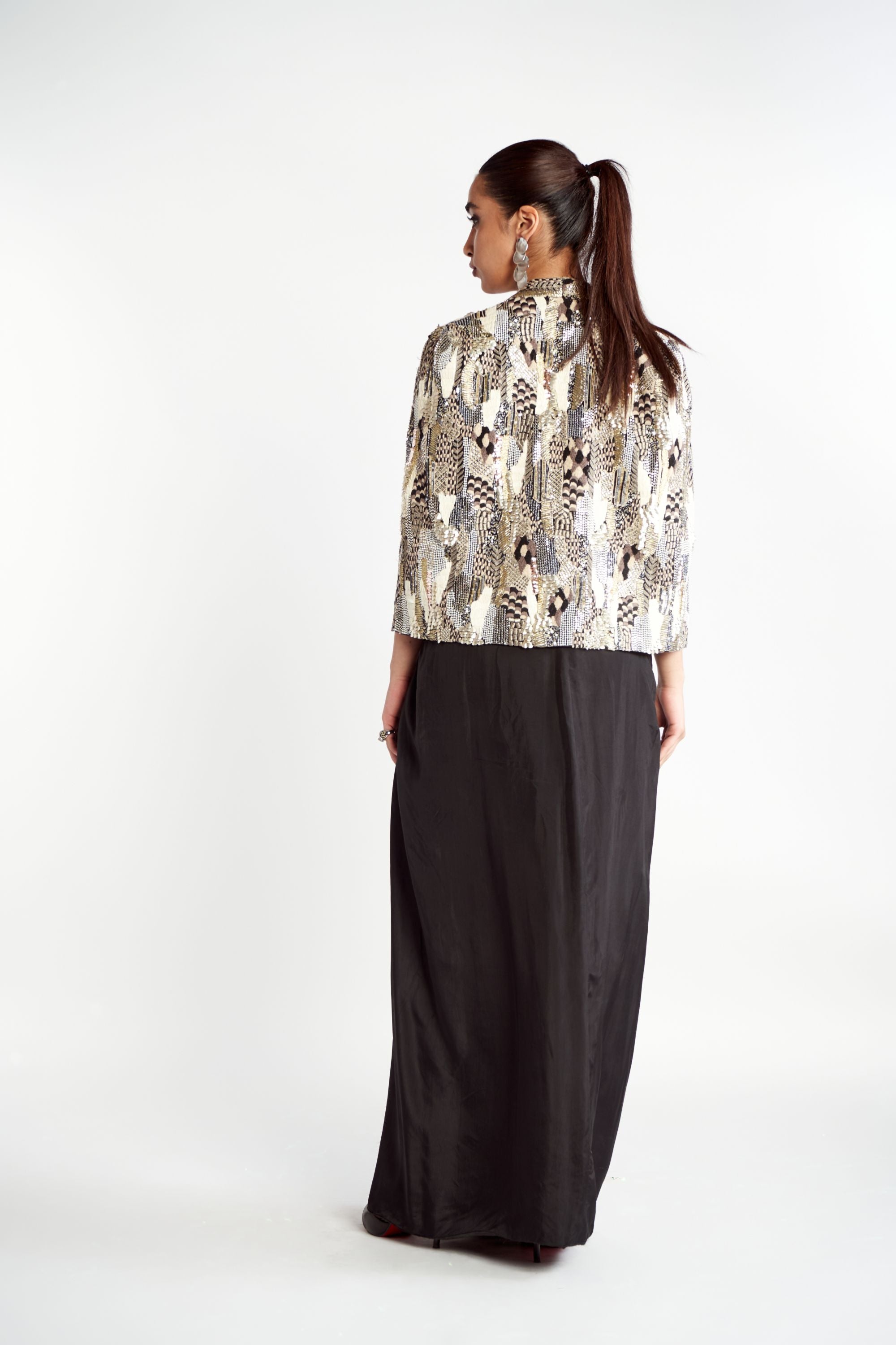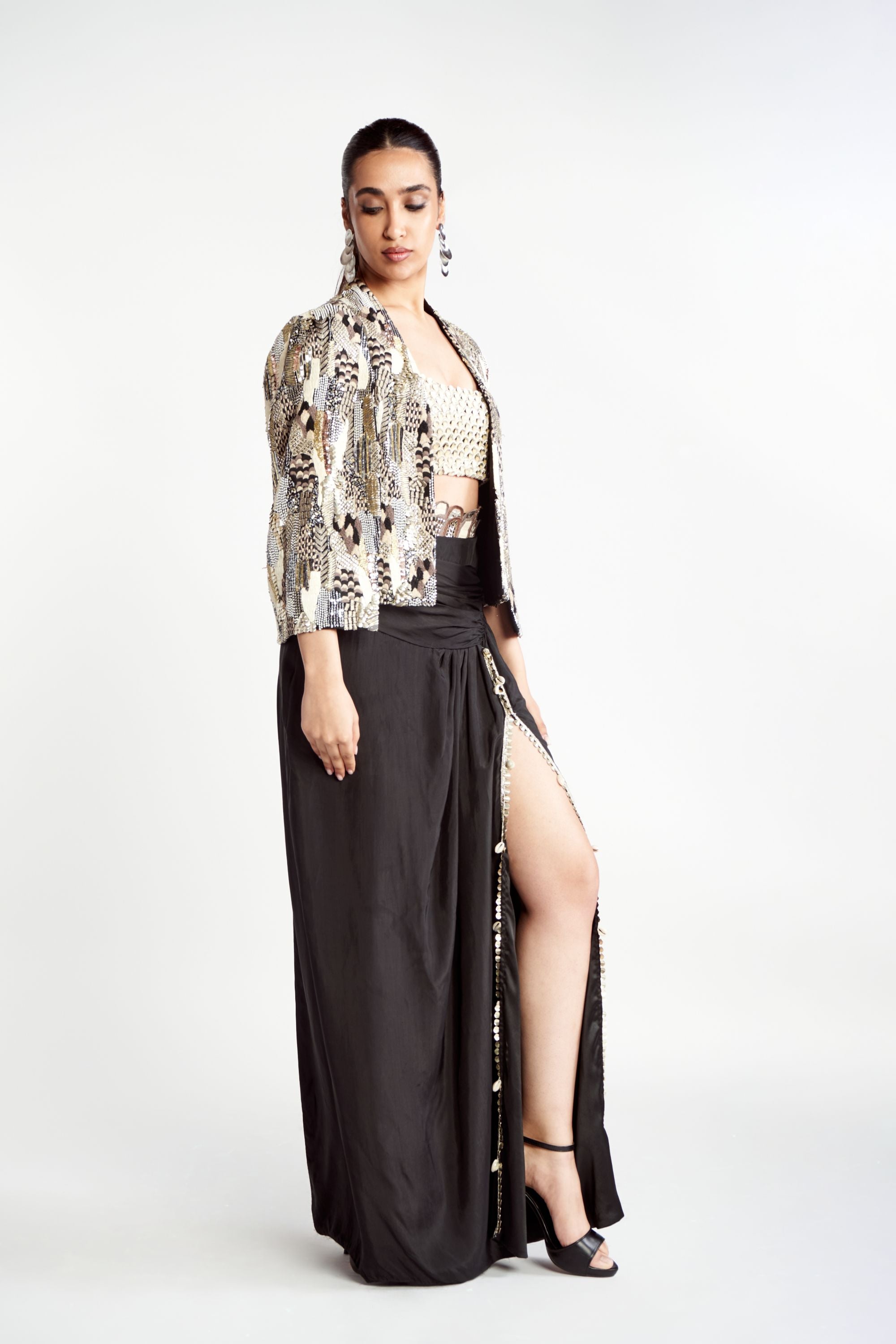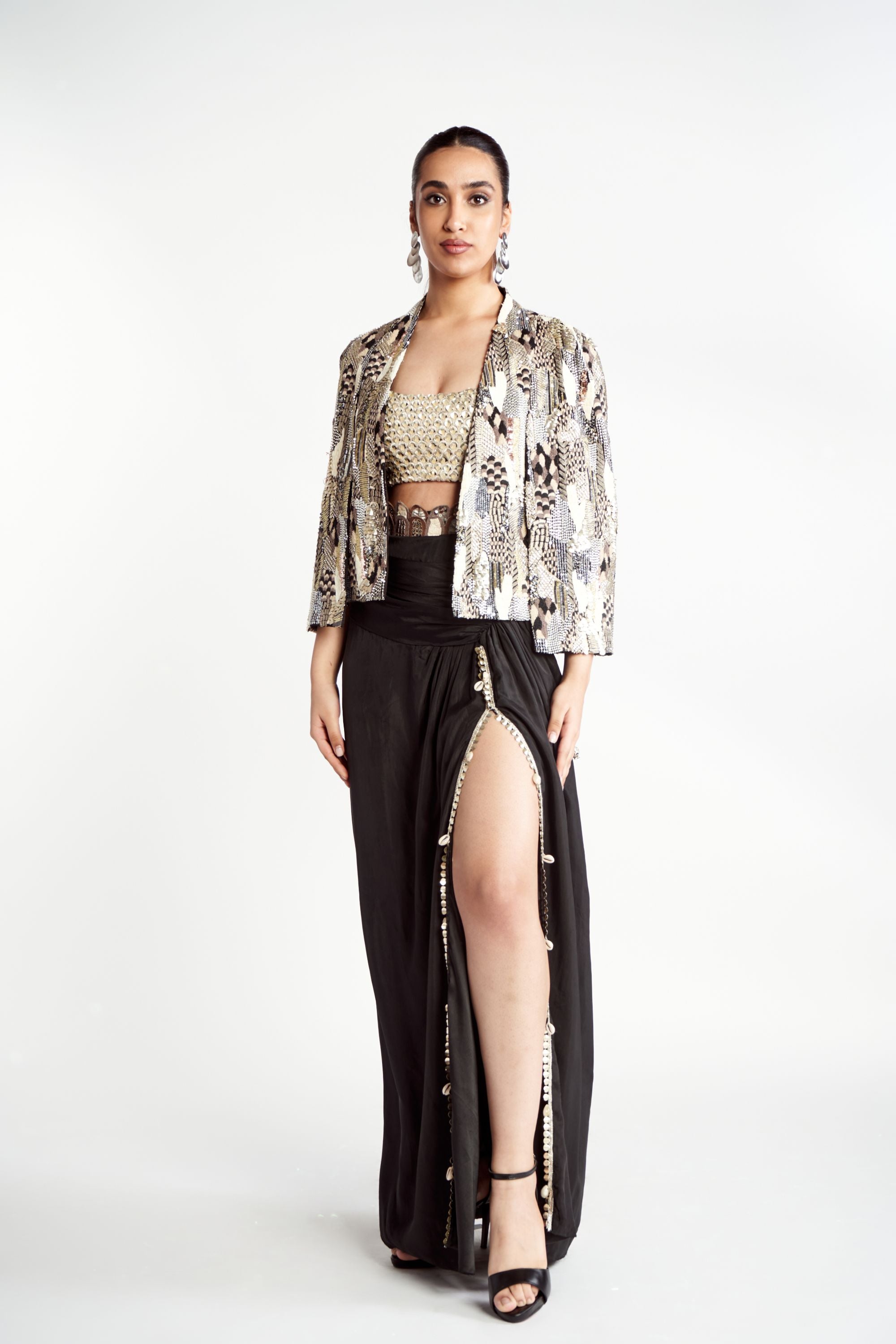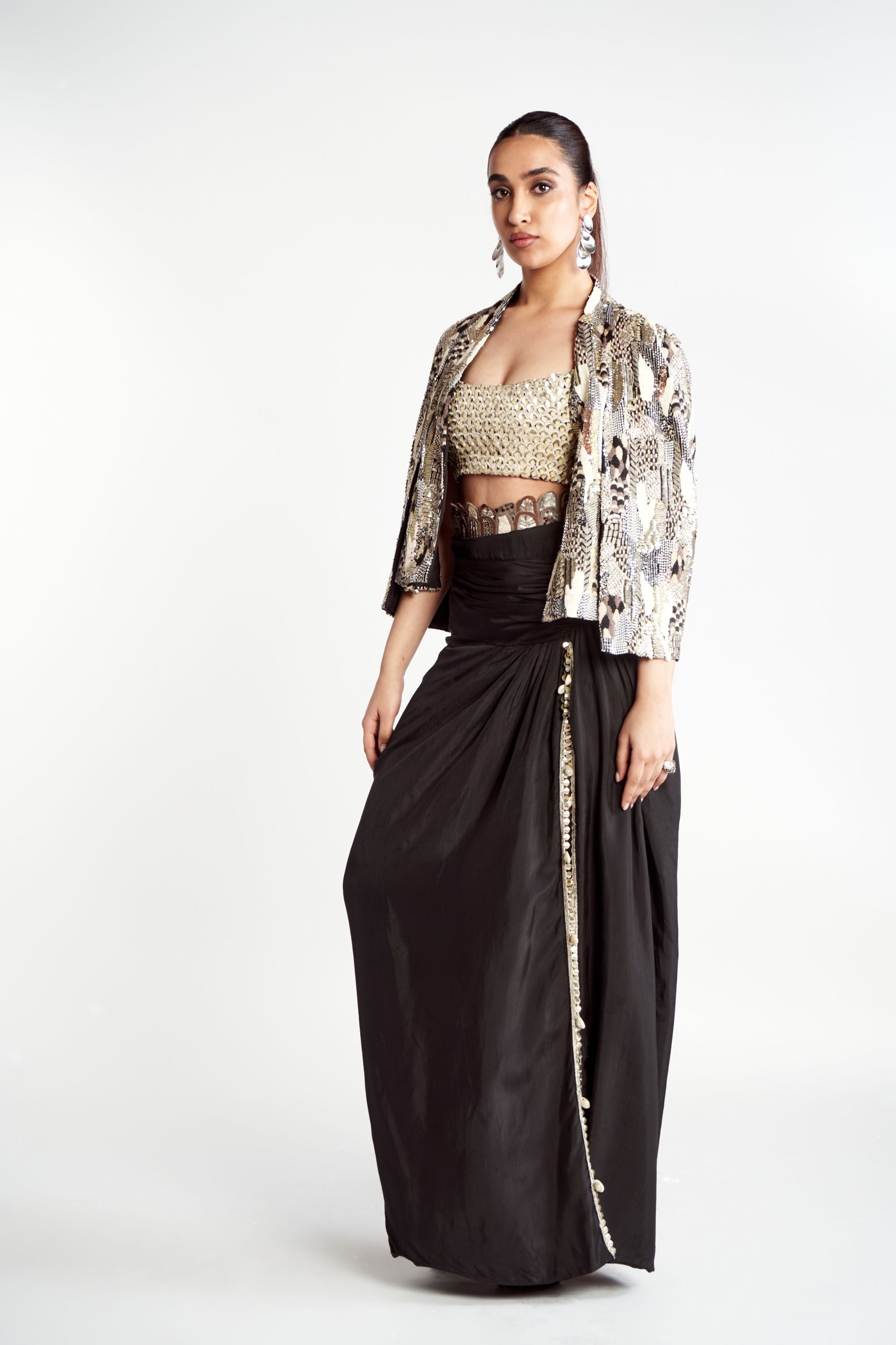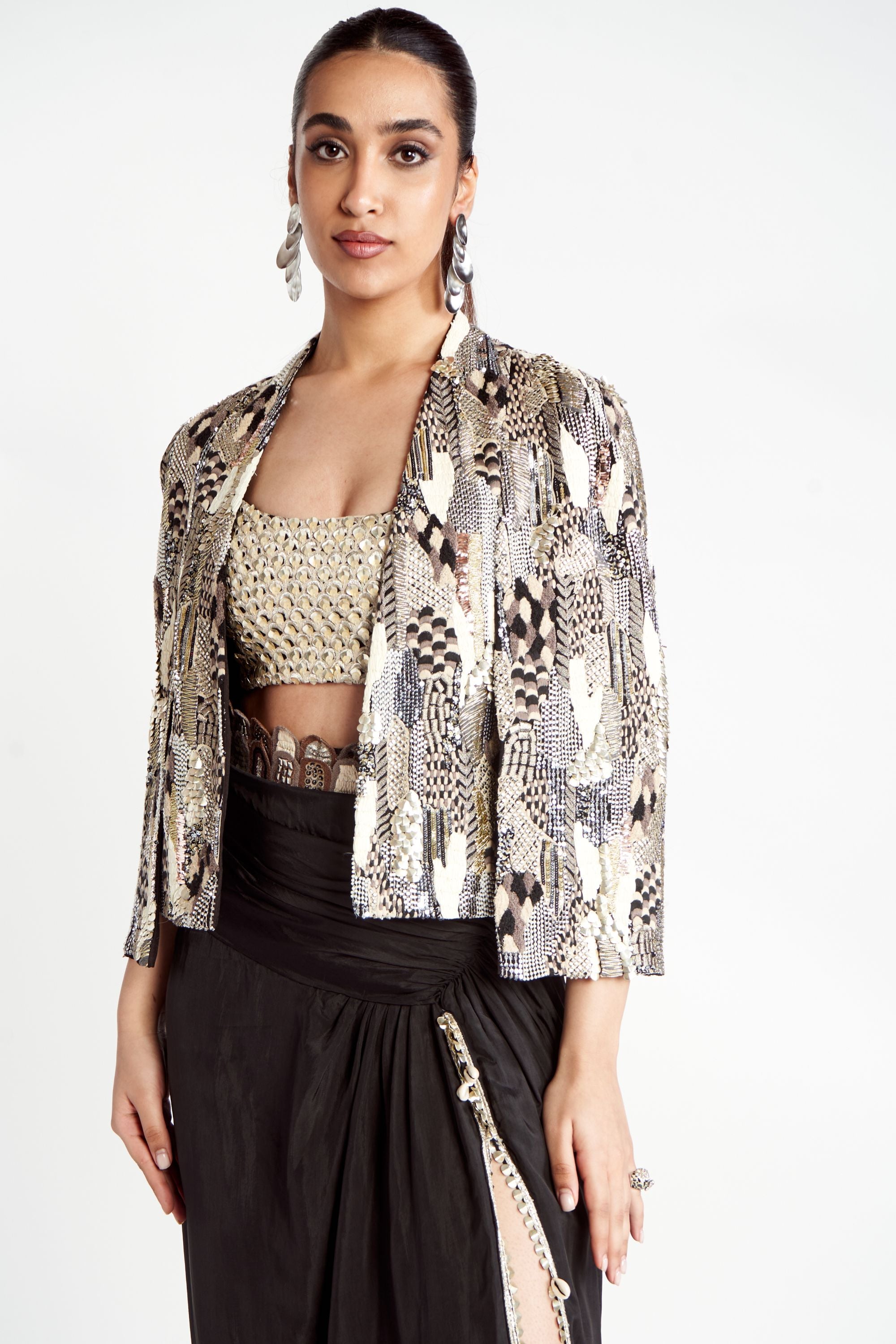Elevate your wardrobe with this stunning Abstract Embroidered Noor Jacket Set, a true testament to the brand's artistry and signature style. The jacket features an exquisite blend of abstract and intricate embroideries, reimagined for a modern yet timeless aesthetic. Paired with a Scalloped Embroidered Bustier, which adds texture and elegance, and a beautifully Draped Skirt for a flowing, graceful silhouette, this ensemble exudes sophistication and charm.