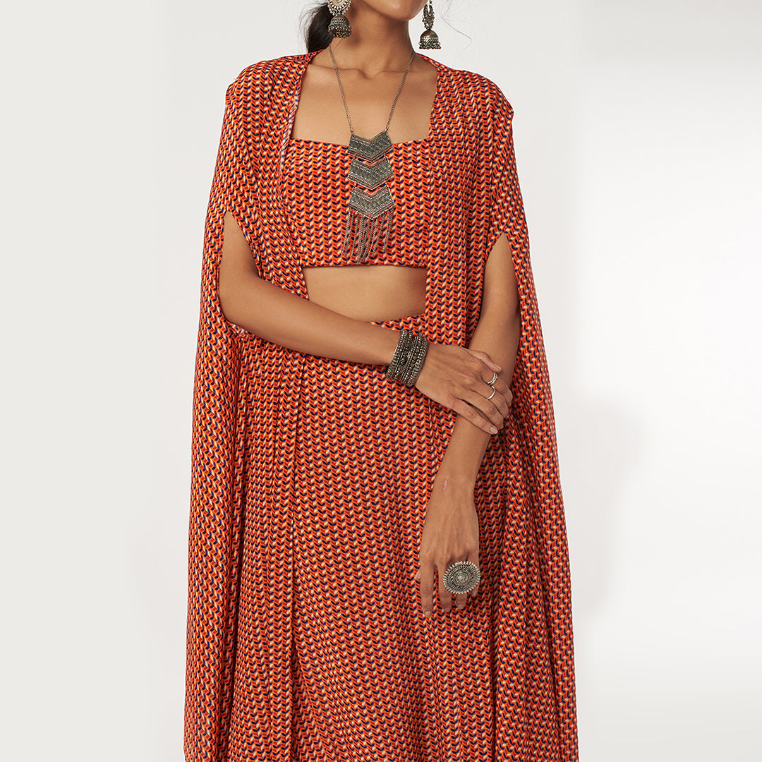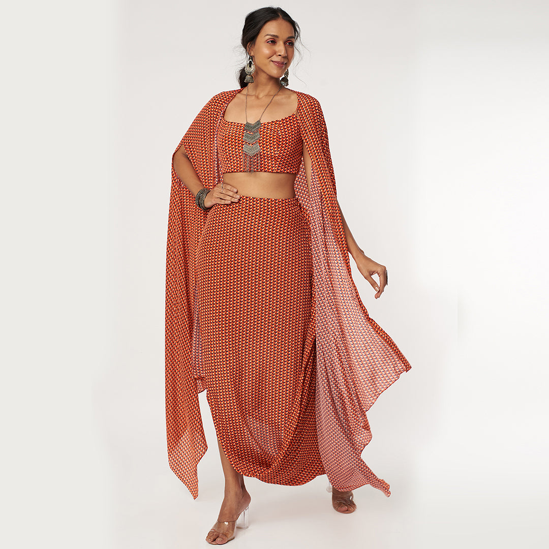 ORANGE LEAF PRINT DRAPE SKIRT WITH ARYA BUSTIER AND CAPE