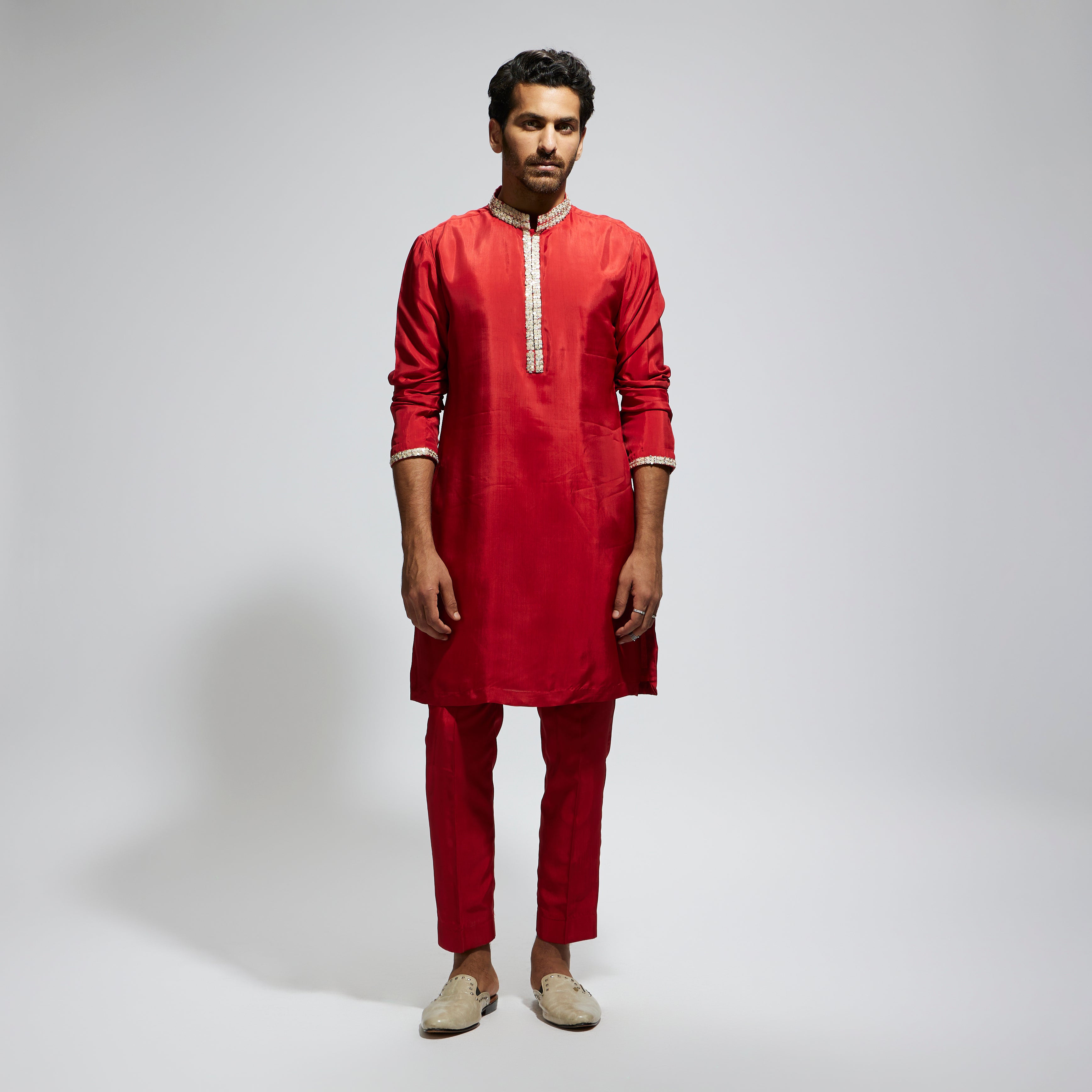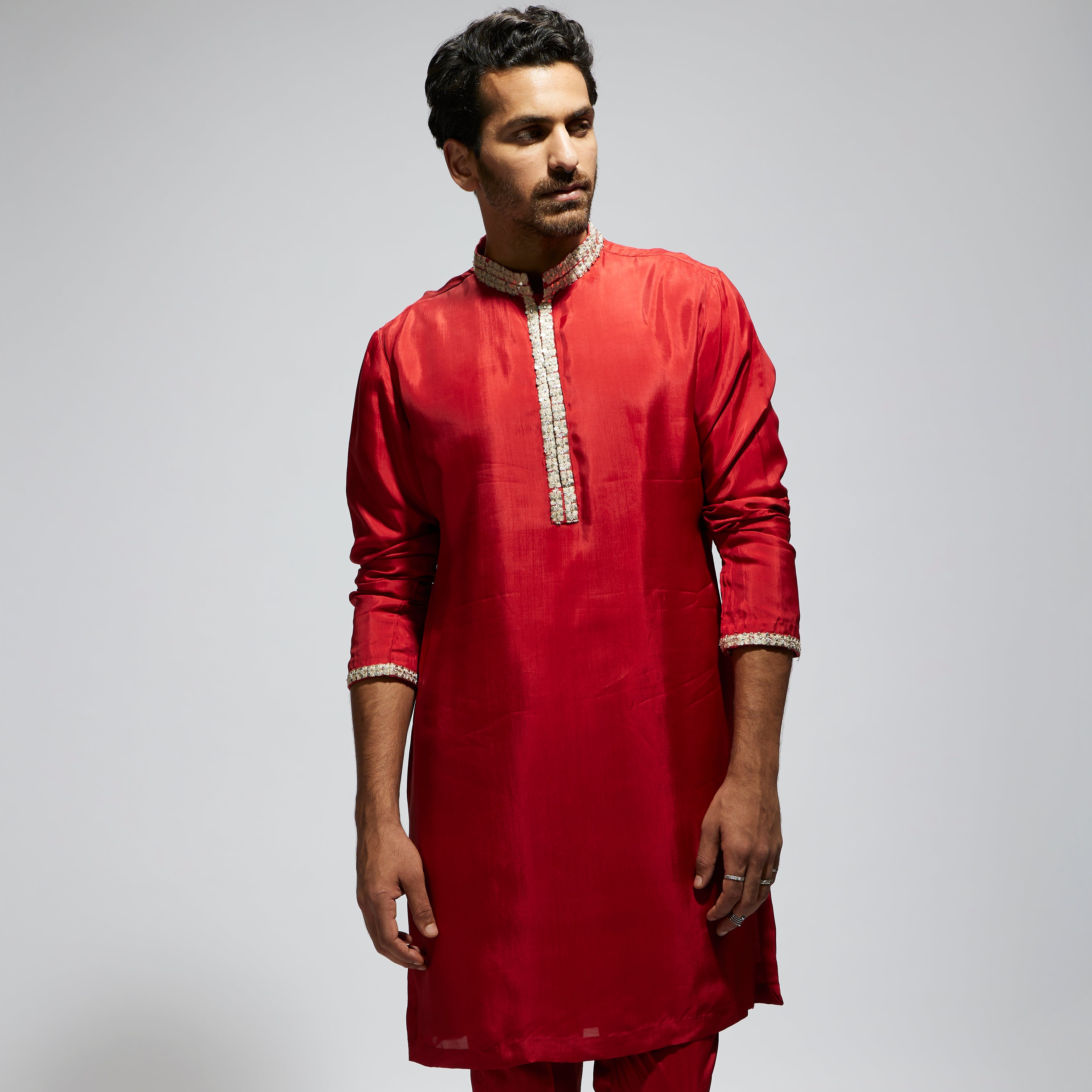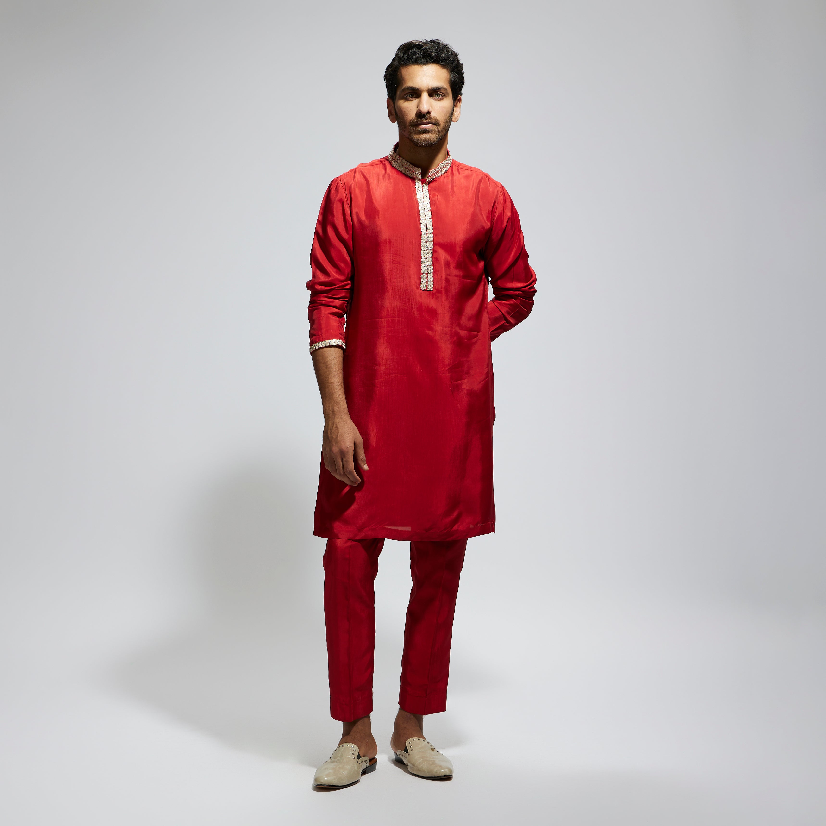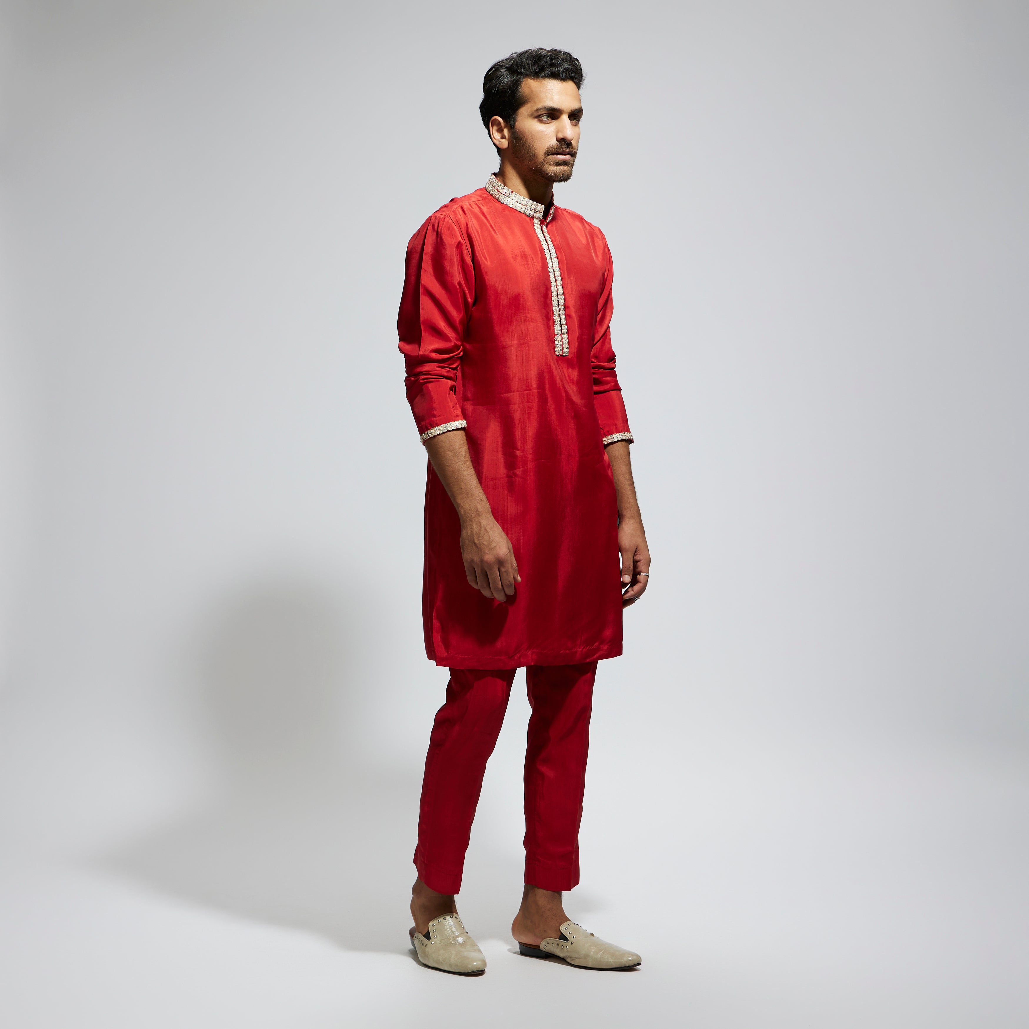 Featuring a orange solid kurta with embellished collar and pant, fabric habutai, and Component 2.