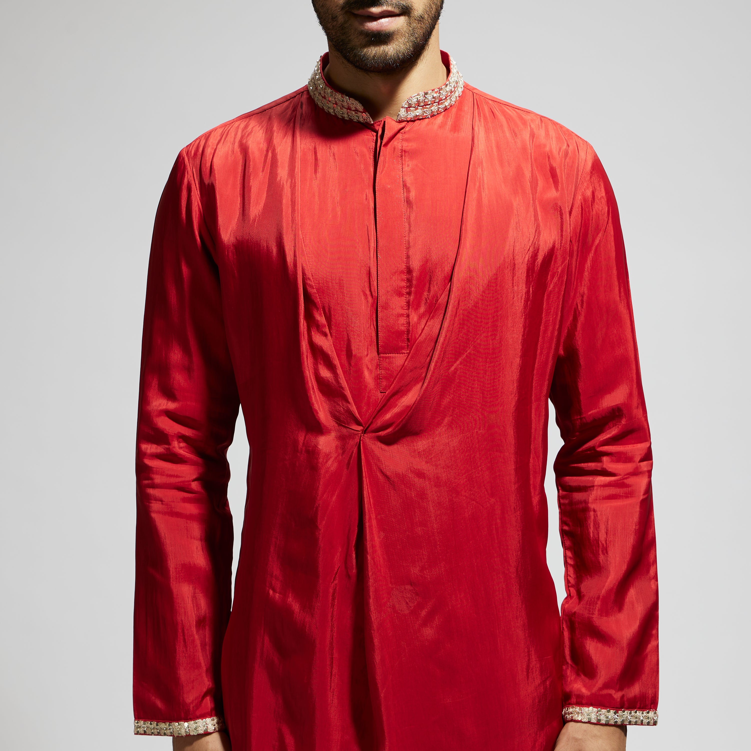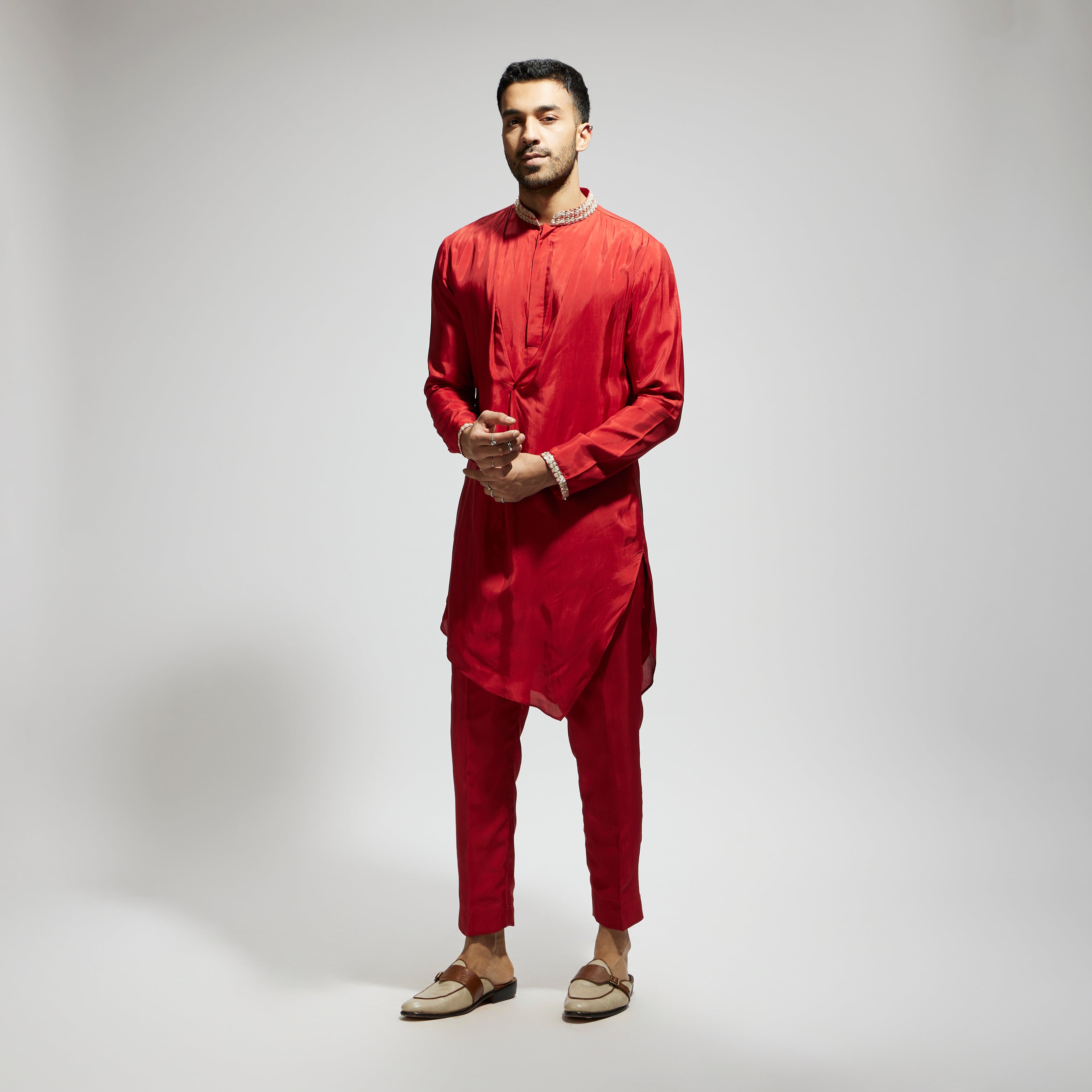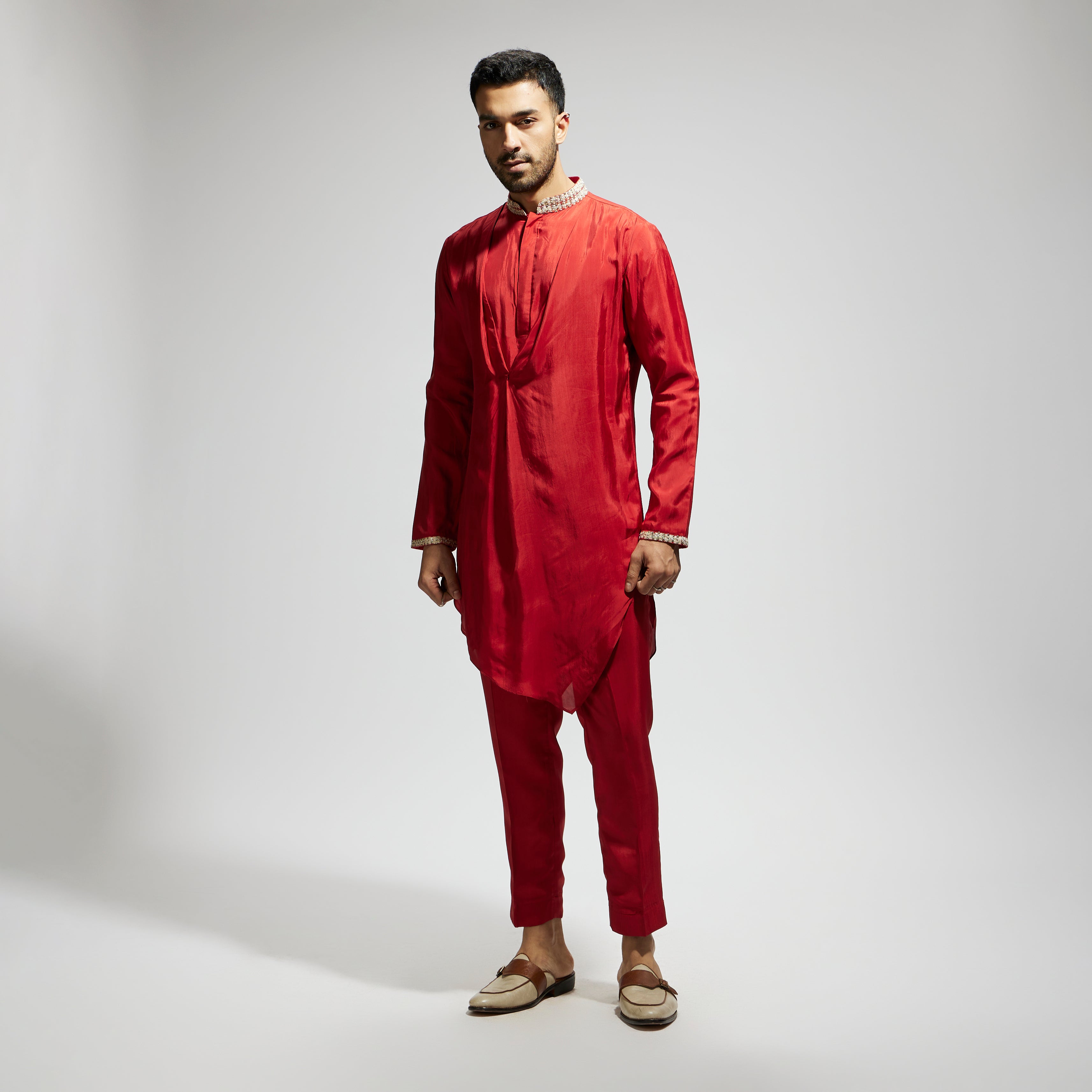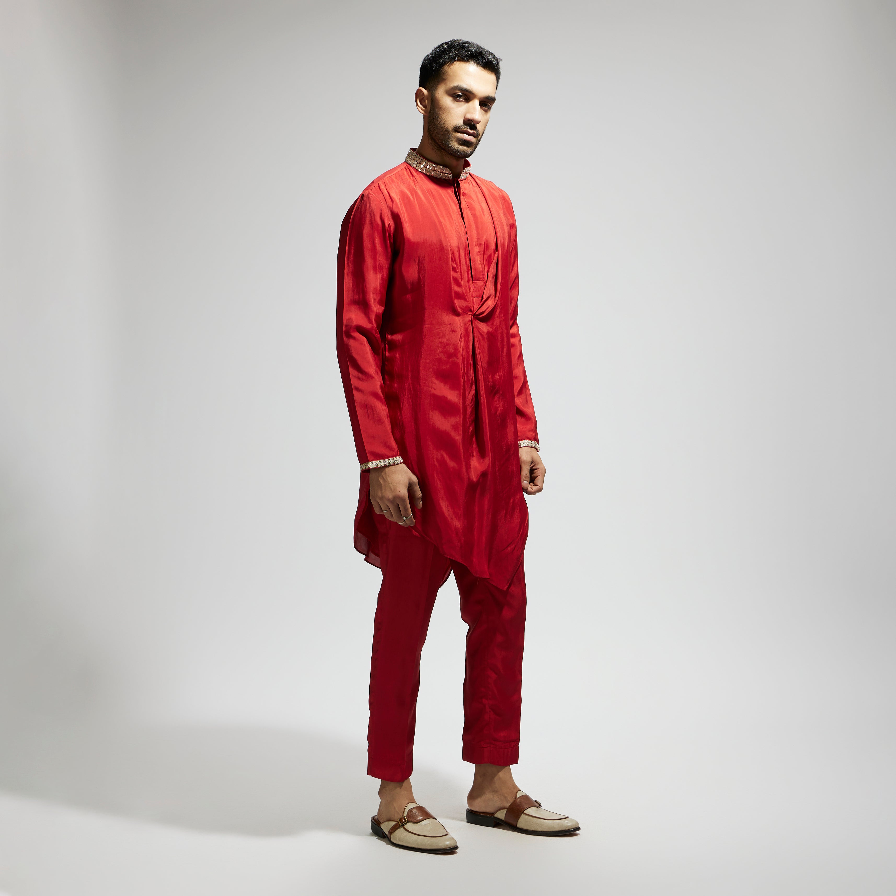 ORANGE SOLID KURTA WITH EMBELLISHED COLLAR AND PANTS