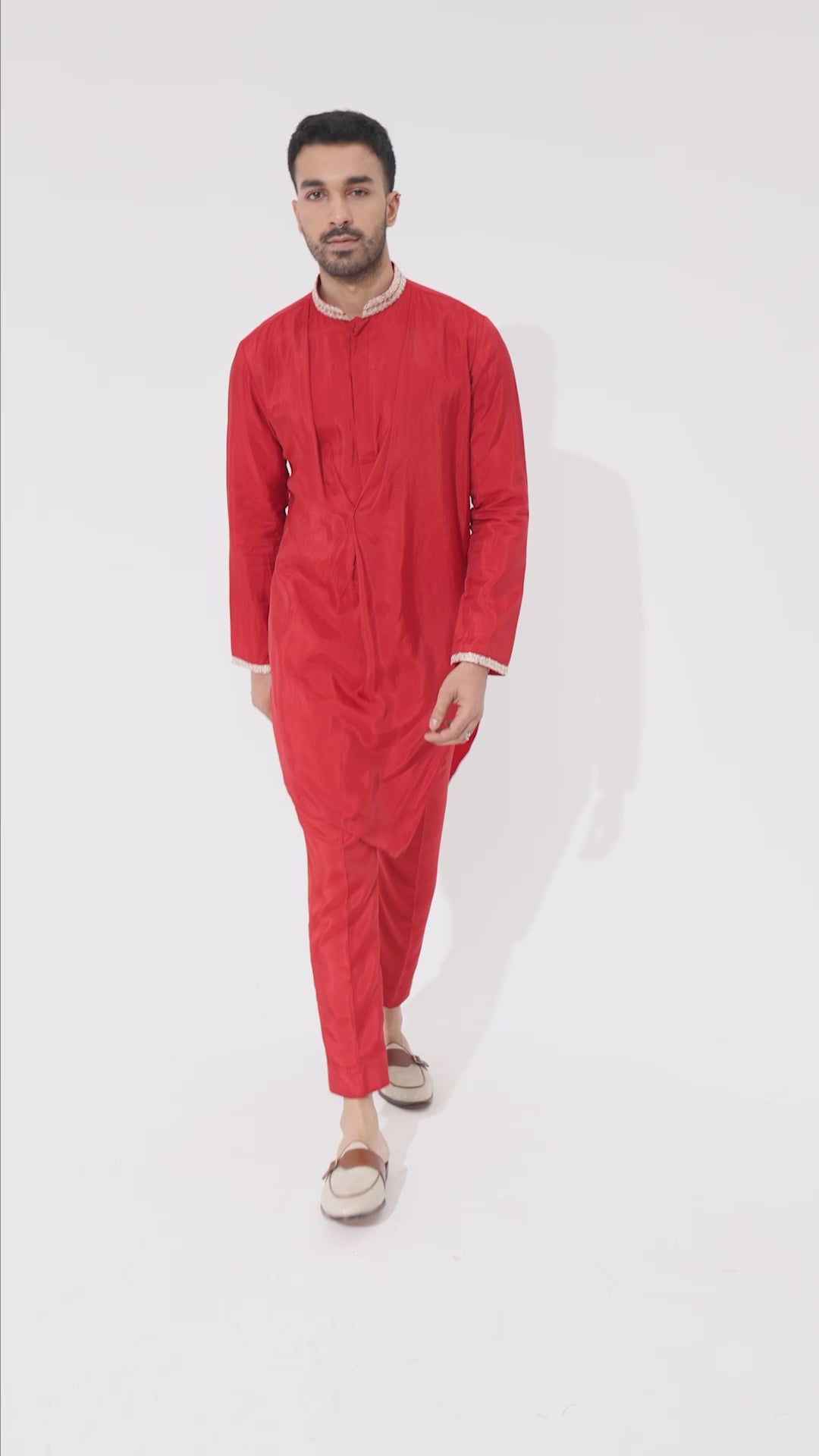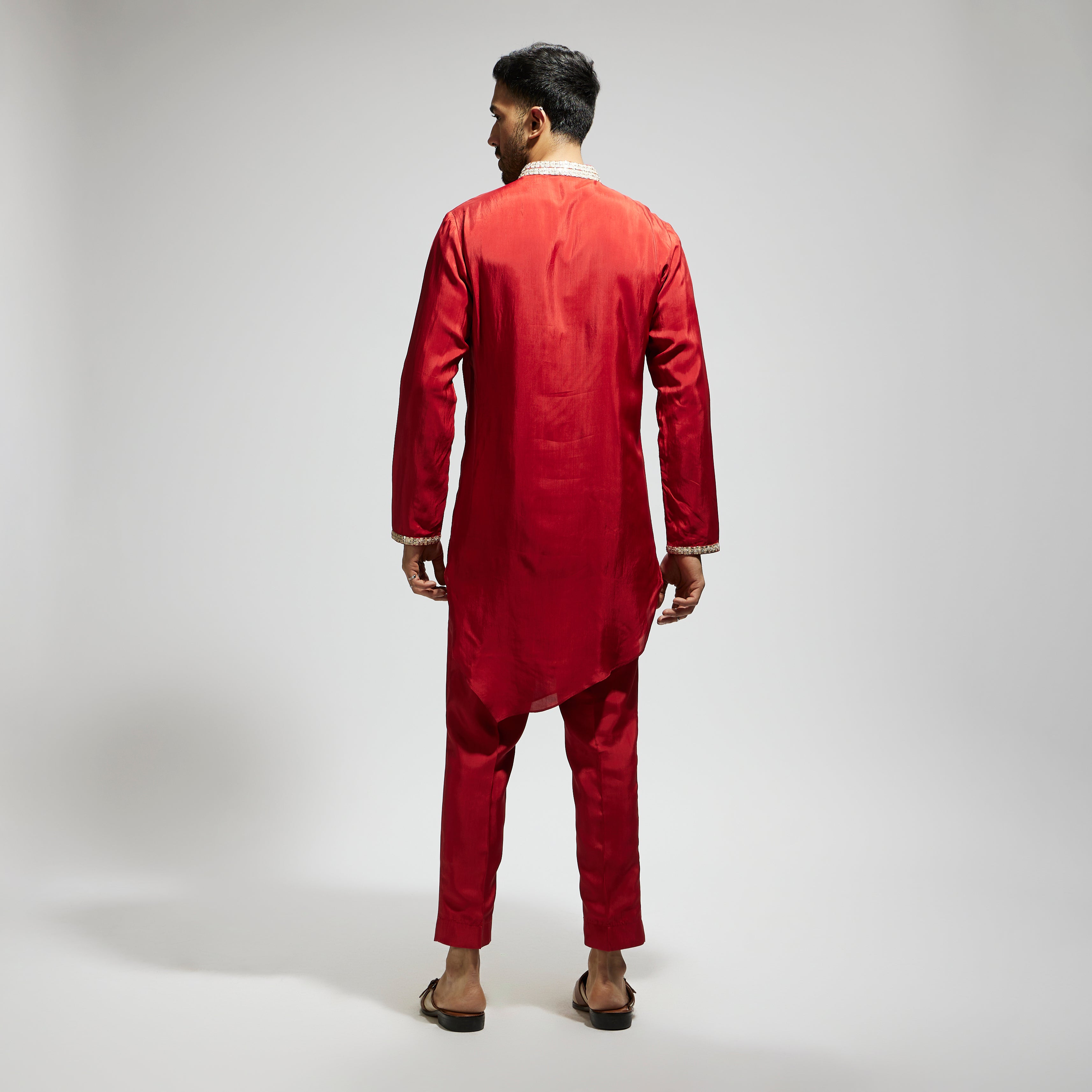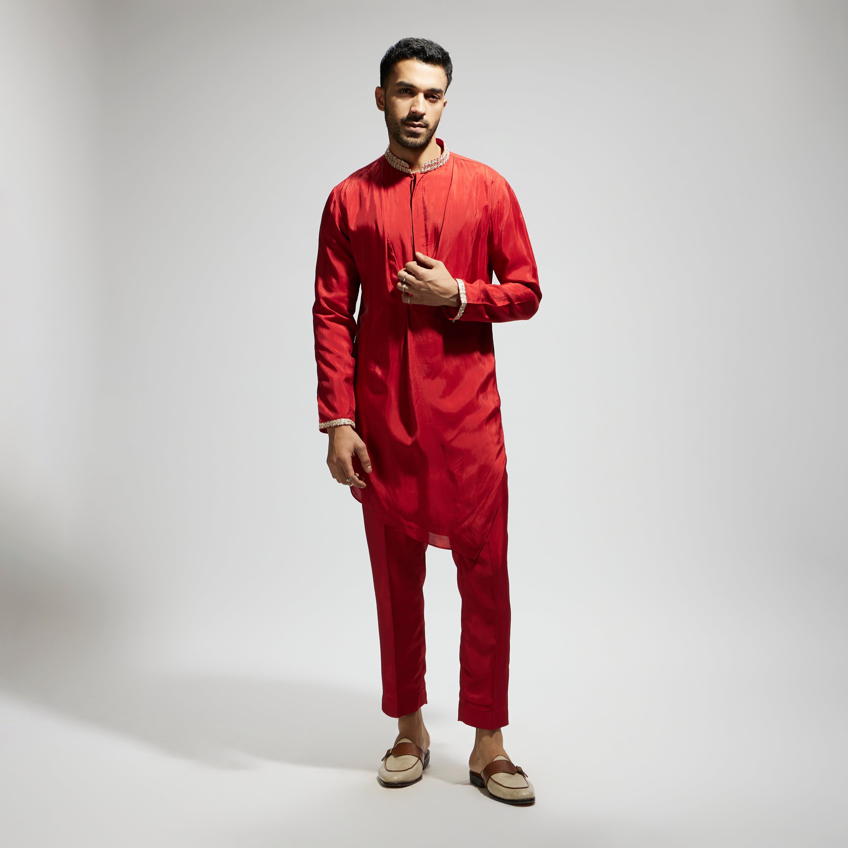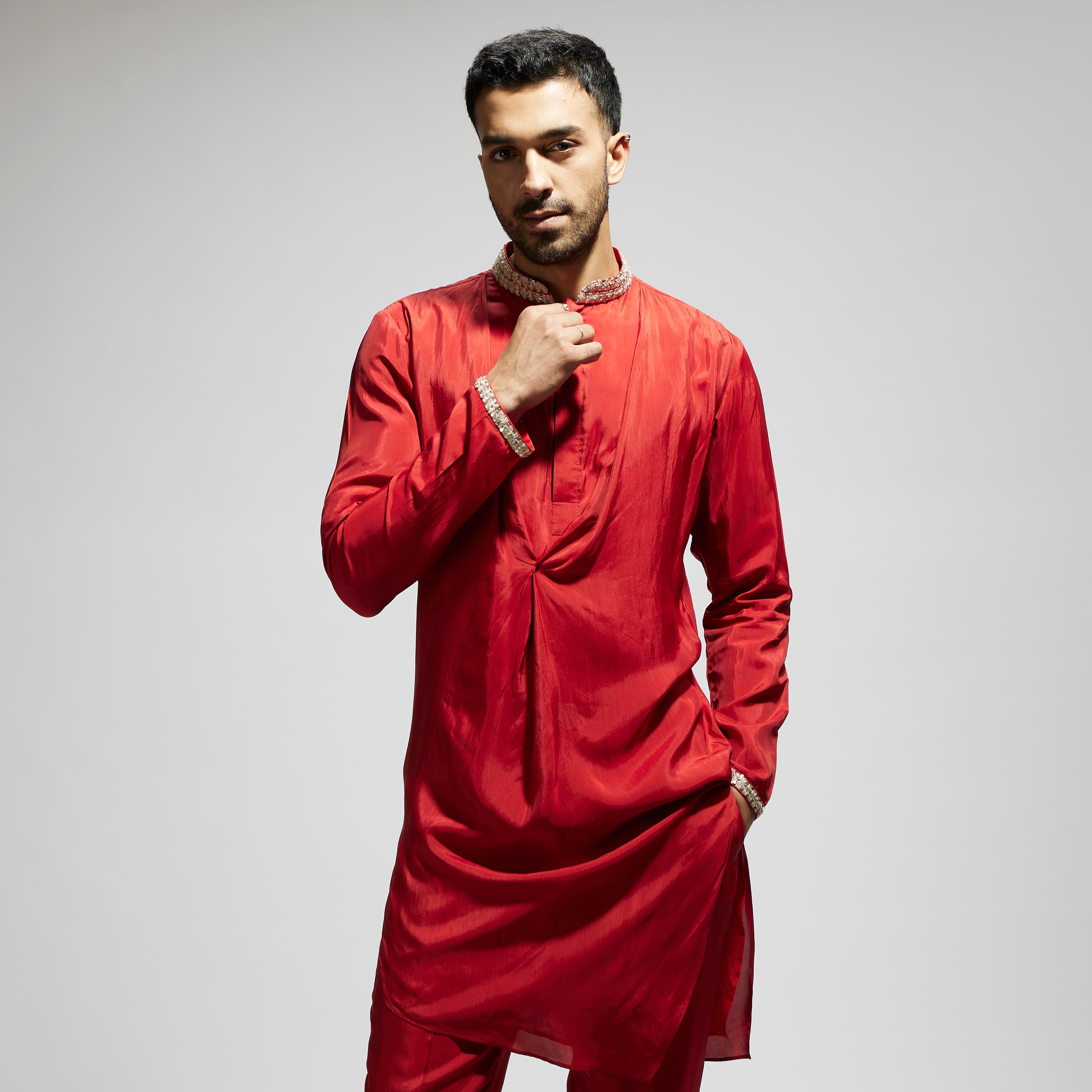 ORANGE SOLID KURTA WITH EMBELLISHED COLLAR AND PANTS