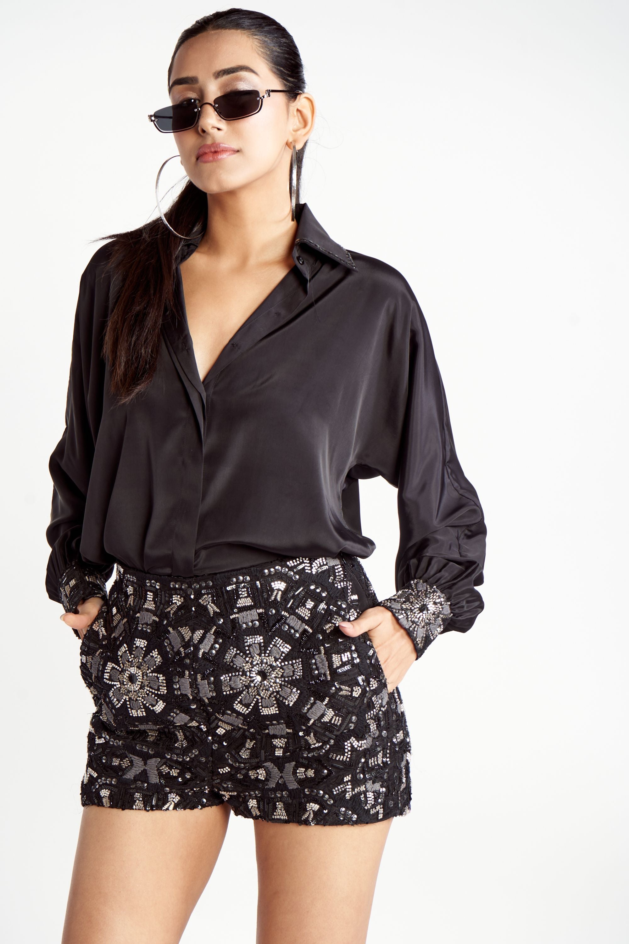 This striking set combines modern chic with intricate craftsmanship. The metallic embroidered shorts are a standout feature, adorned with stunning metallic details that create a bold, luxurious look. Paired with a complementary shirt, this set offers a perfect balance of elegance and contemporary flair.
