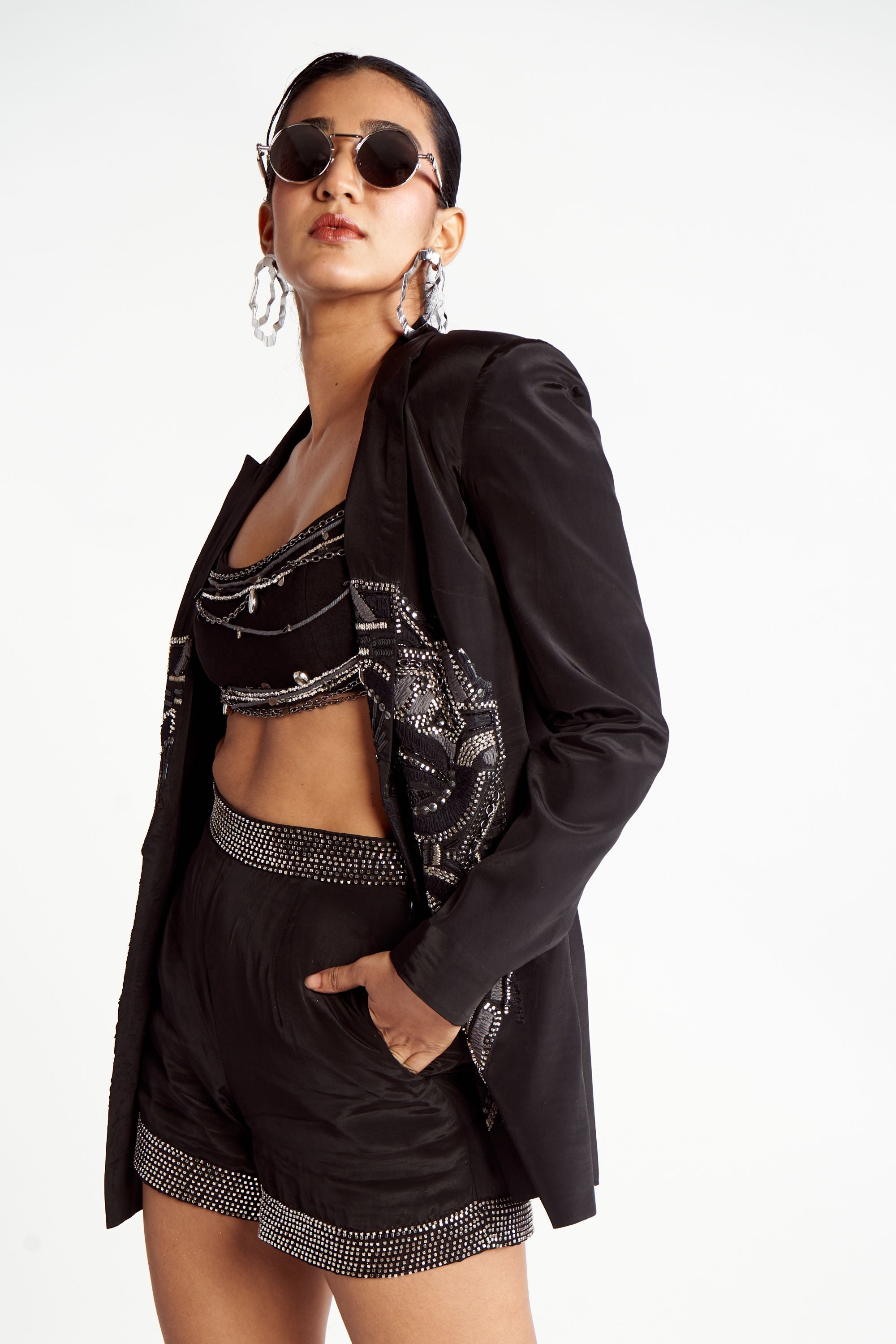Turn heads with this striking Metallic Embroidered Blazer Set, a true statement piece that exudes bold sophistication. The blazer features intricate metallic embroidery of the brand's signature mask motif, showcasing impeccable craftsmanship and artistry. It is paired with a chic bustier adorned with shimmering metallic tassels and tailored shorts.