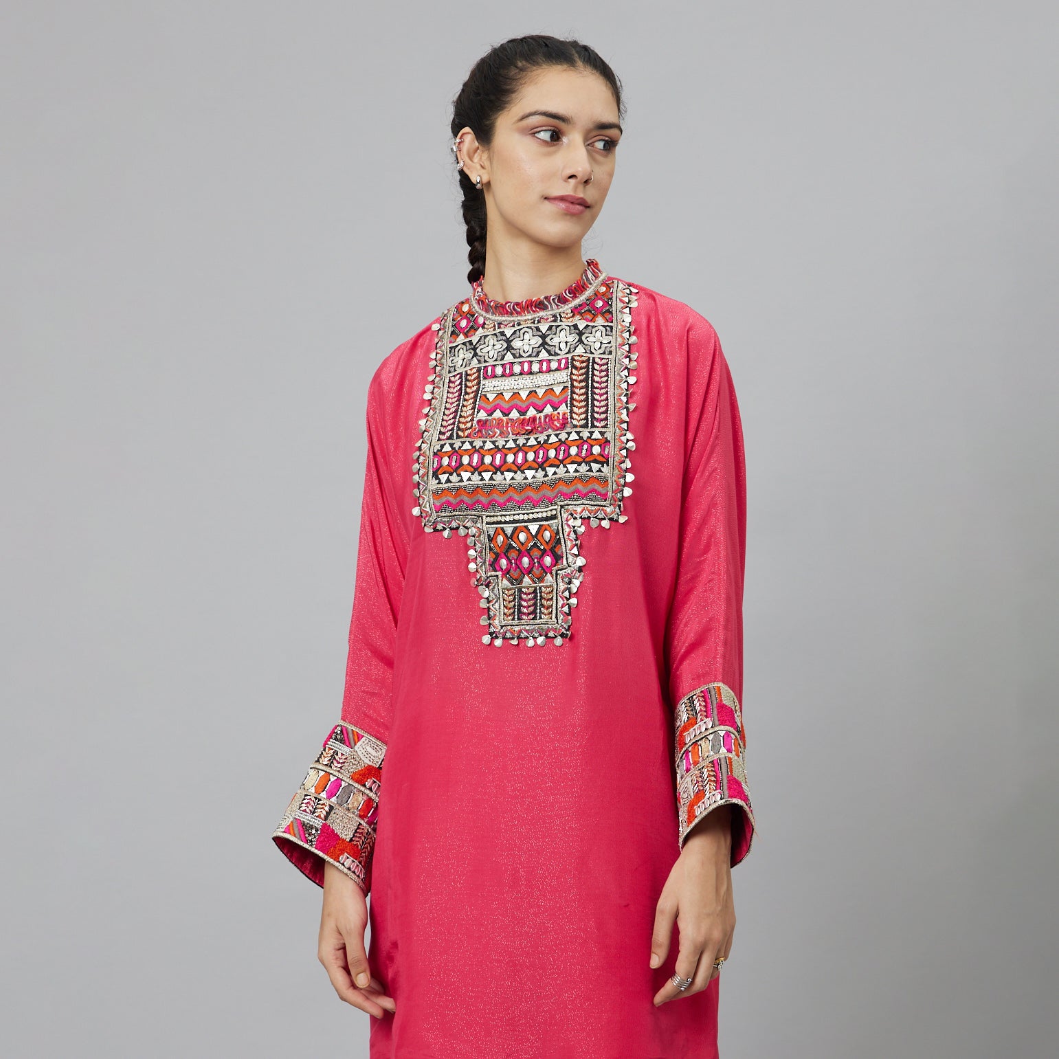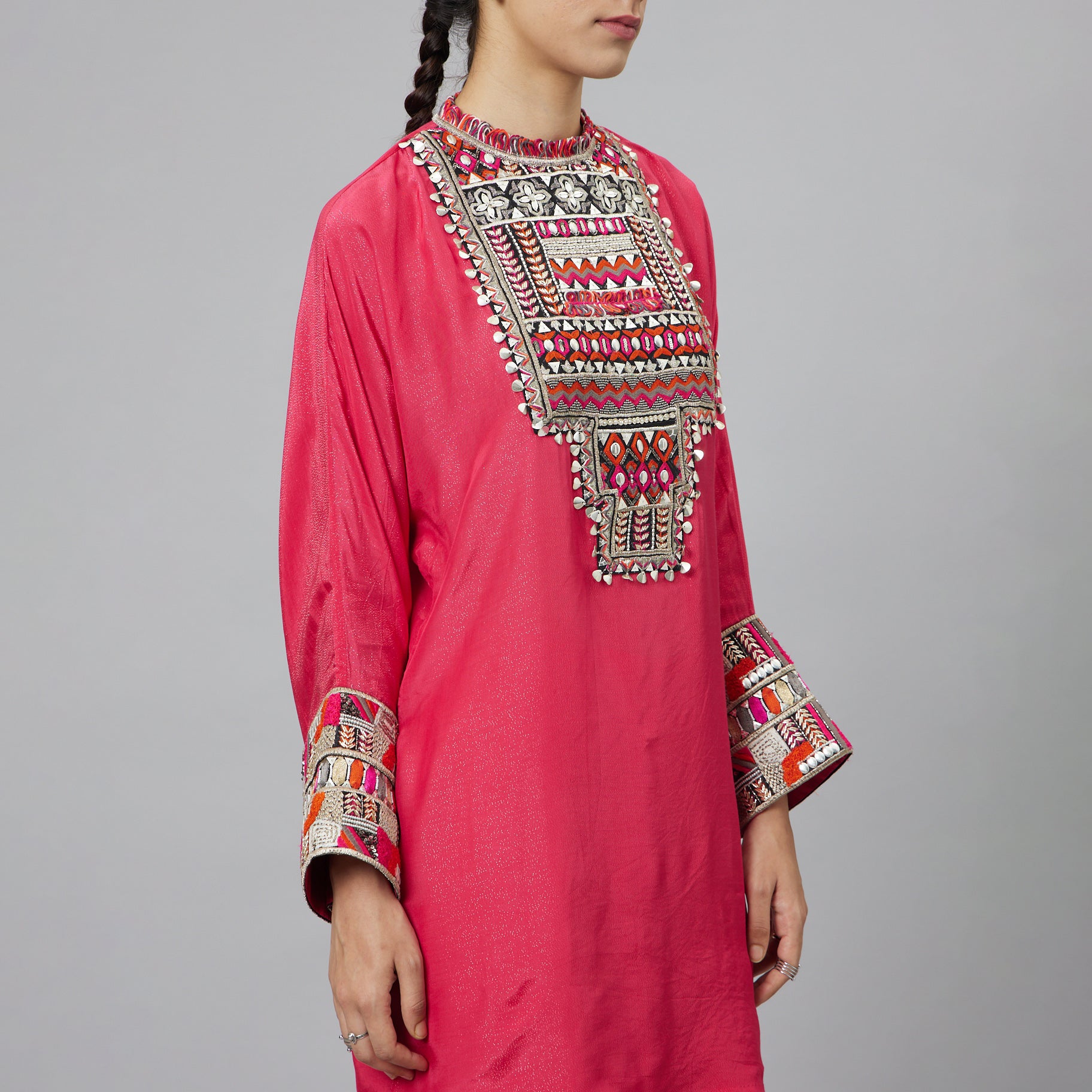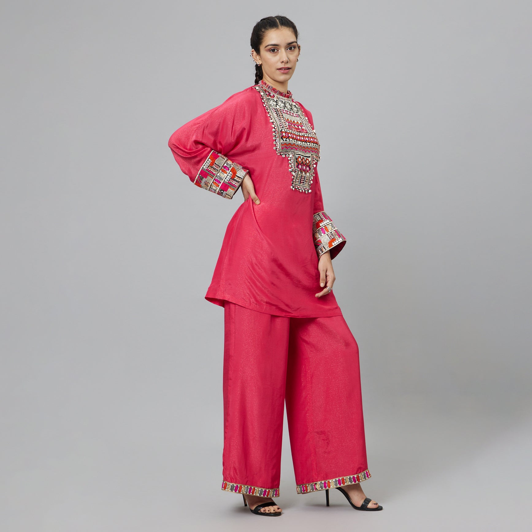Featuring a pink dolmain sleeves embellished yoke tunic paired with pants