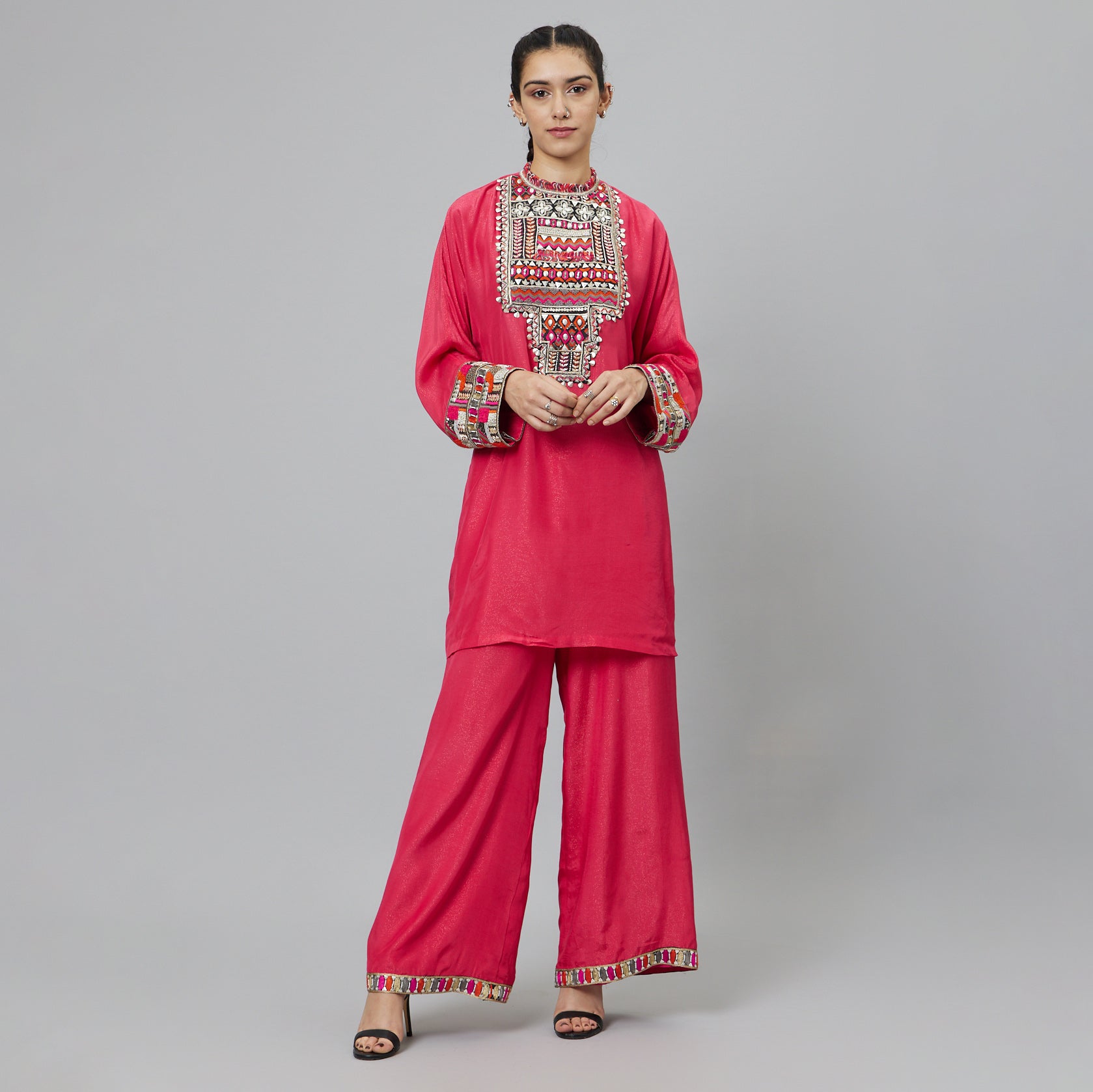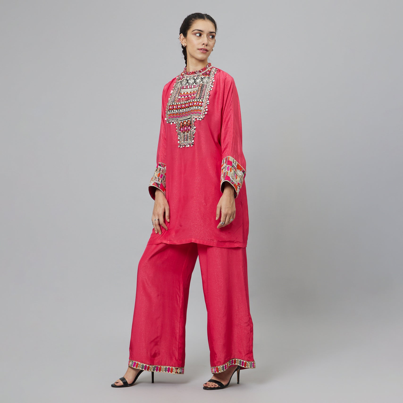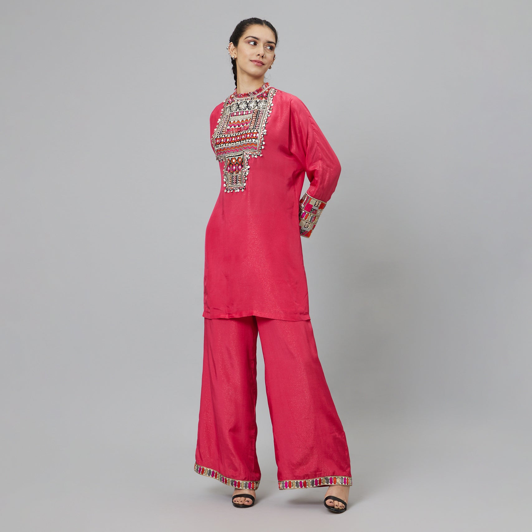 Featuring a pink dolmain sleeves embellished yoke tunic paired with pants