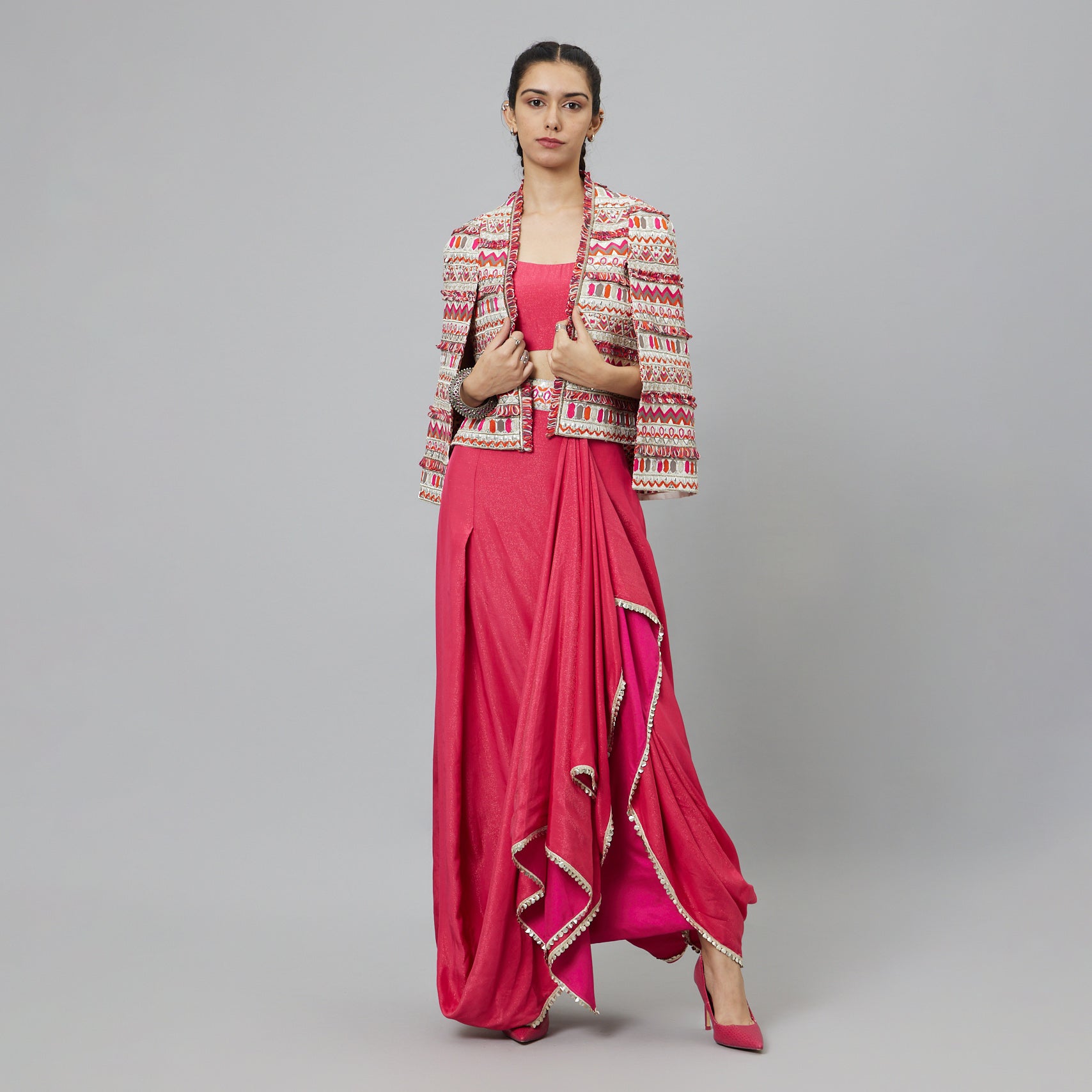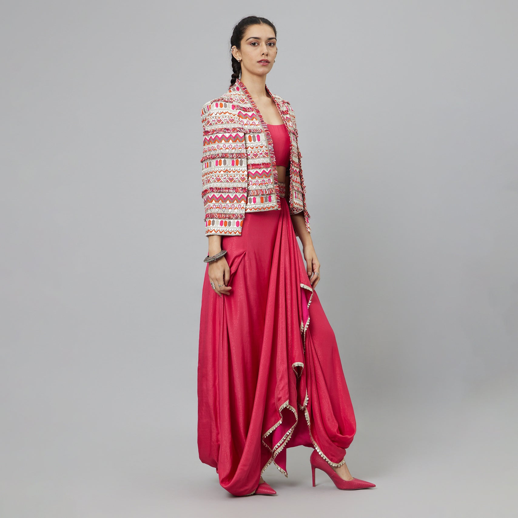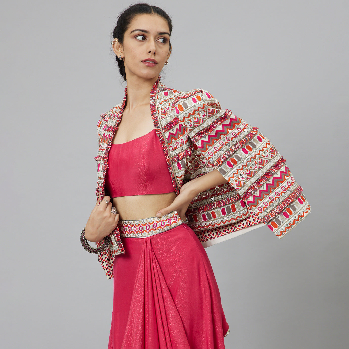Featuring our structured jacket paired with shimmer pink bustier and pre-stitched skirt