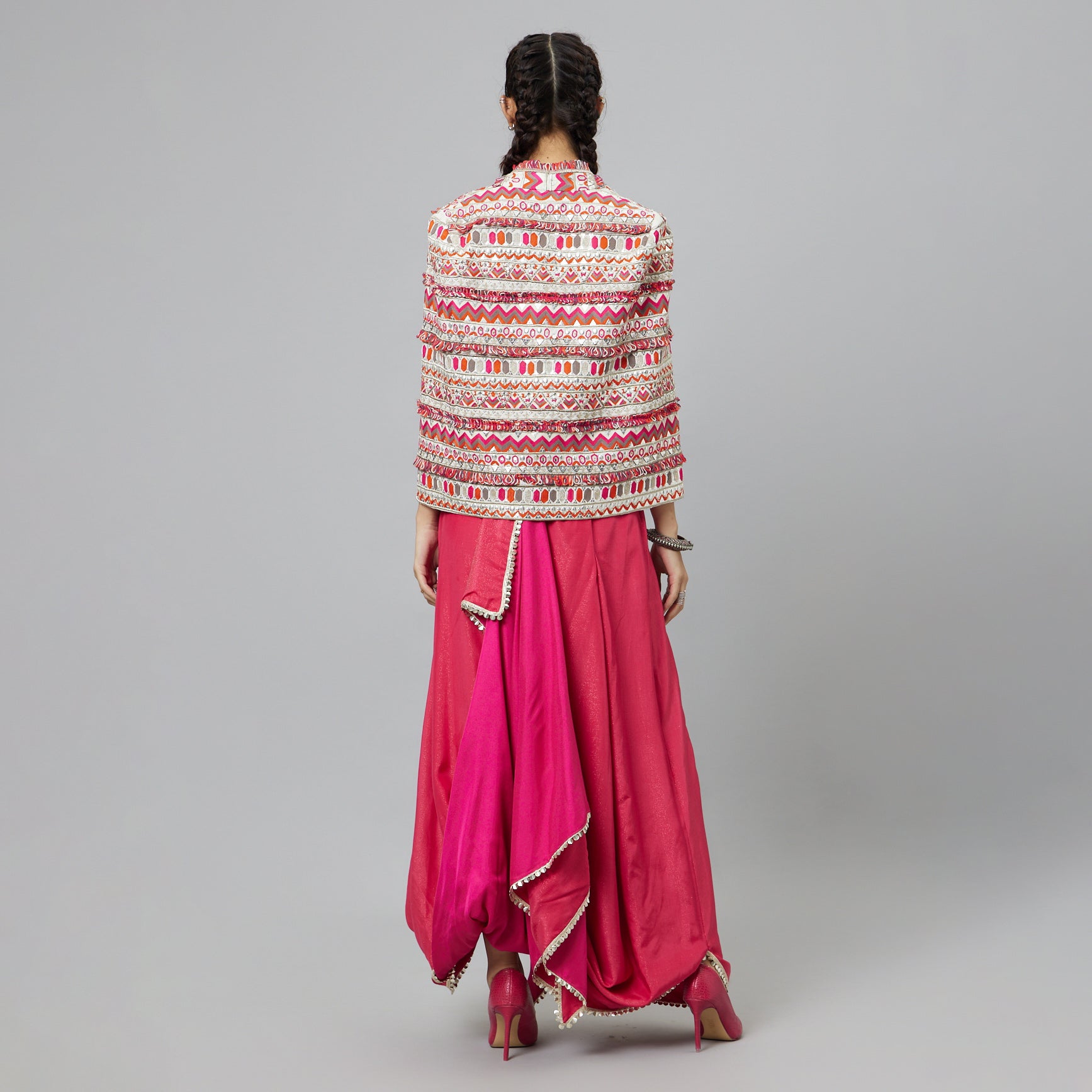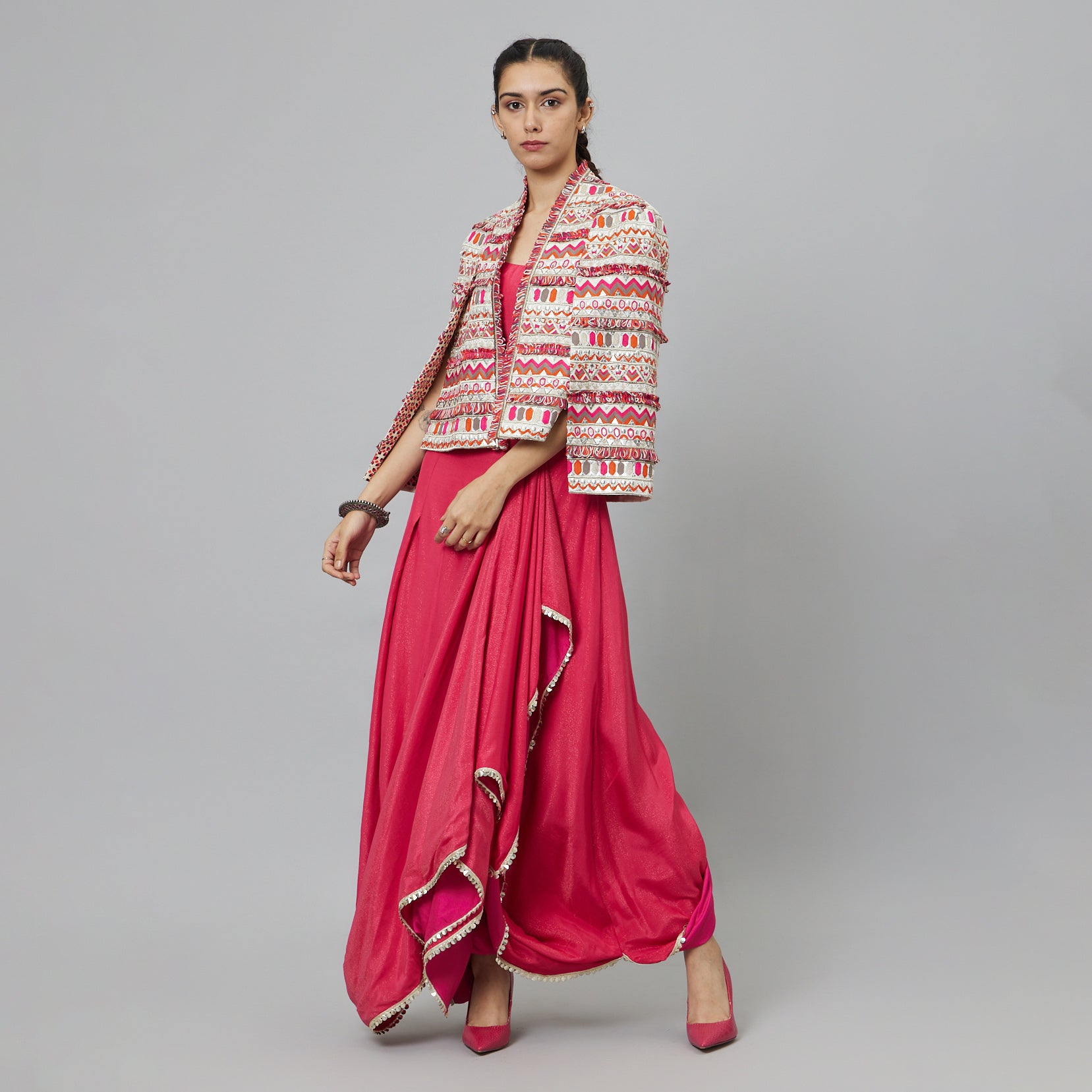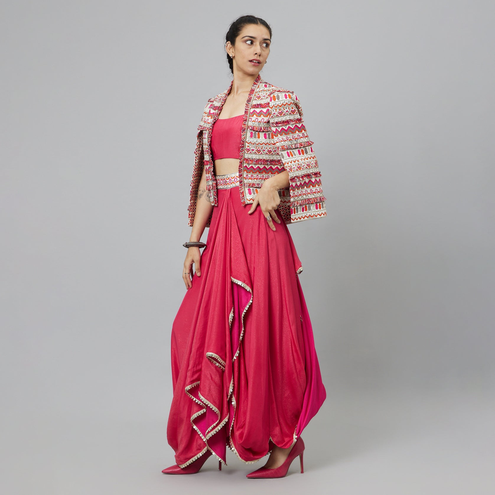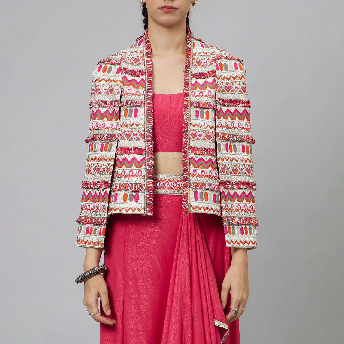 Featuring our structured jacket paired with shimmer pink bustier and pre-stitched skirt