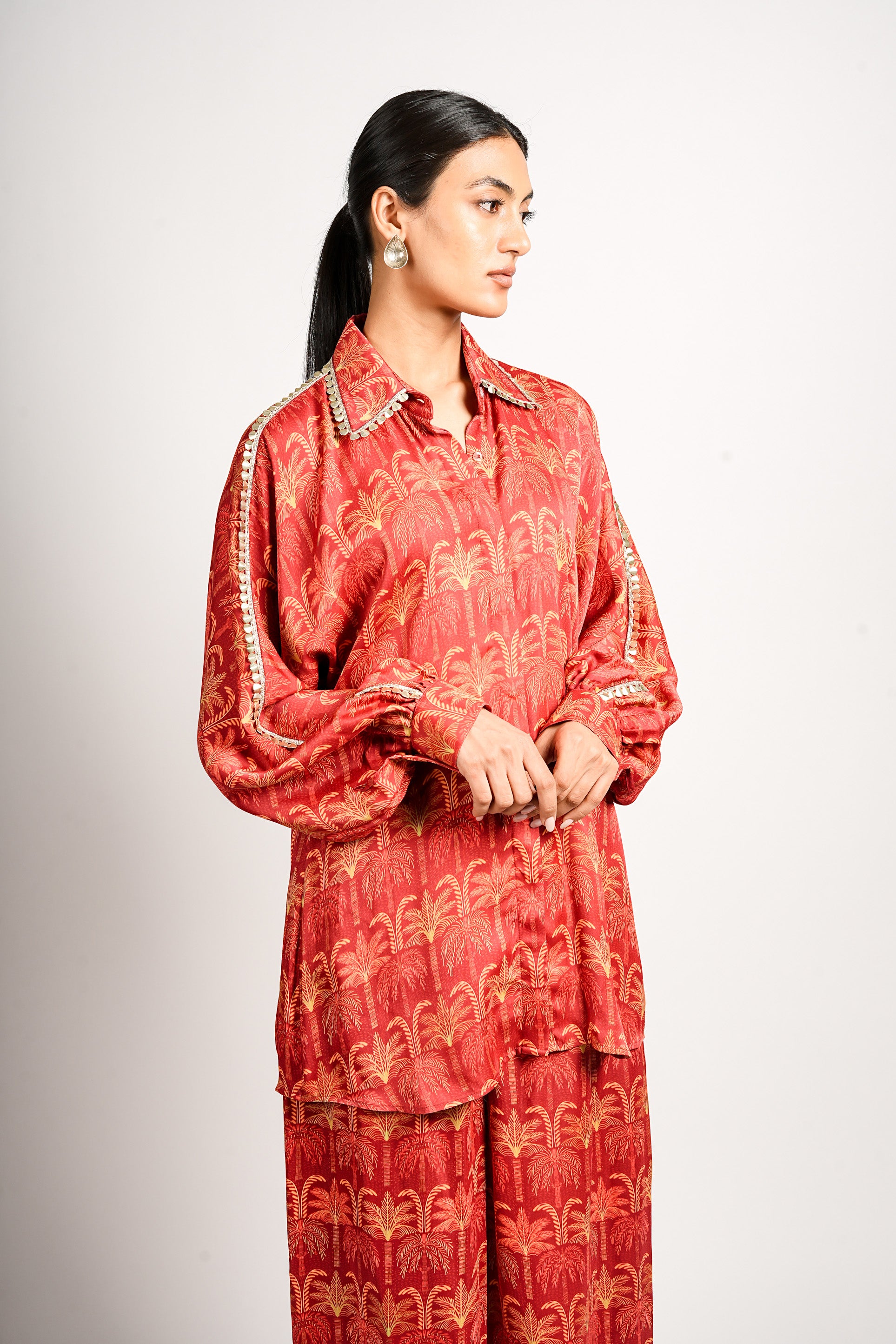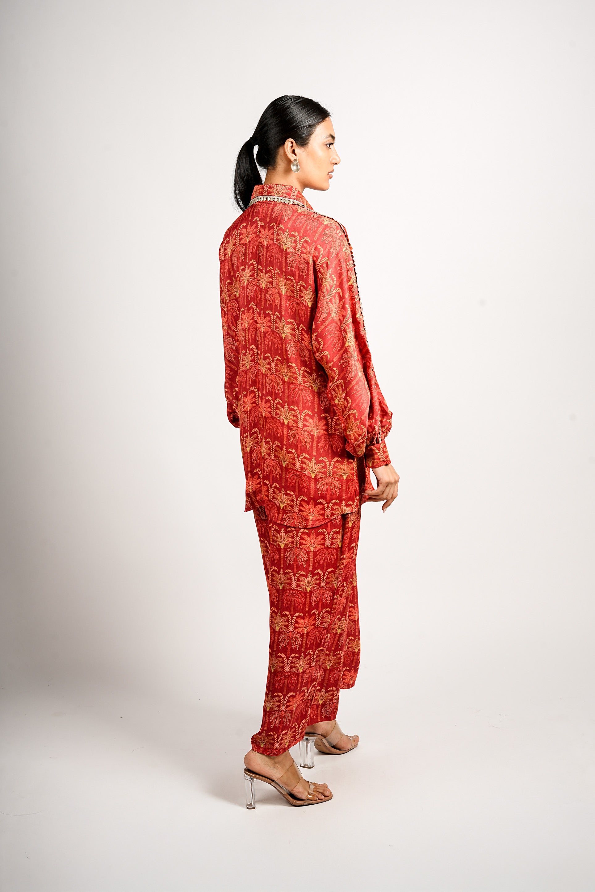 A chic co-ord set featuring a relaxed shirt and matching pants, crafted with palm motif for an effortlessly polished, statement look