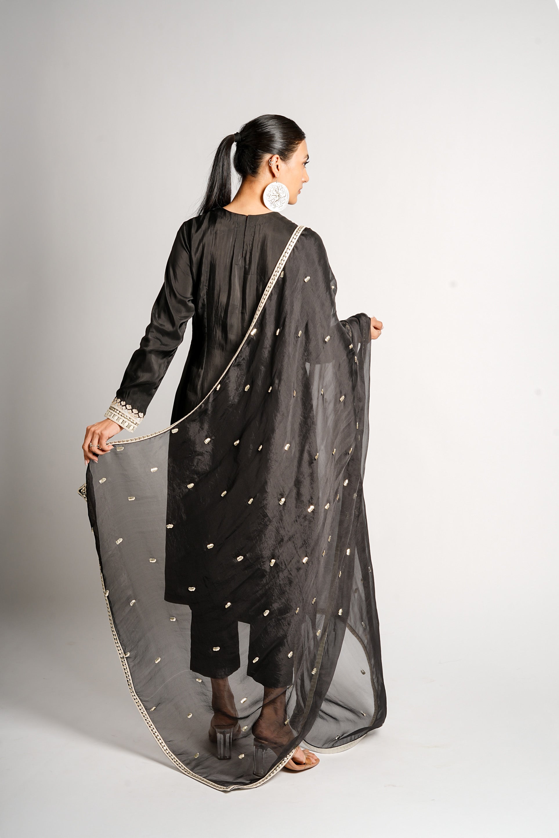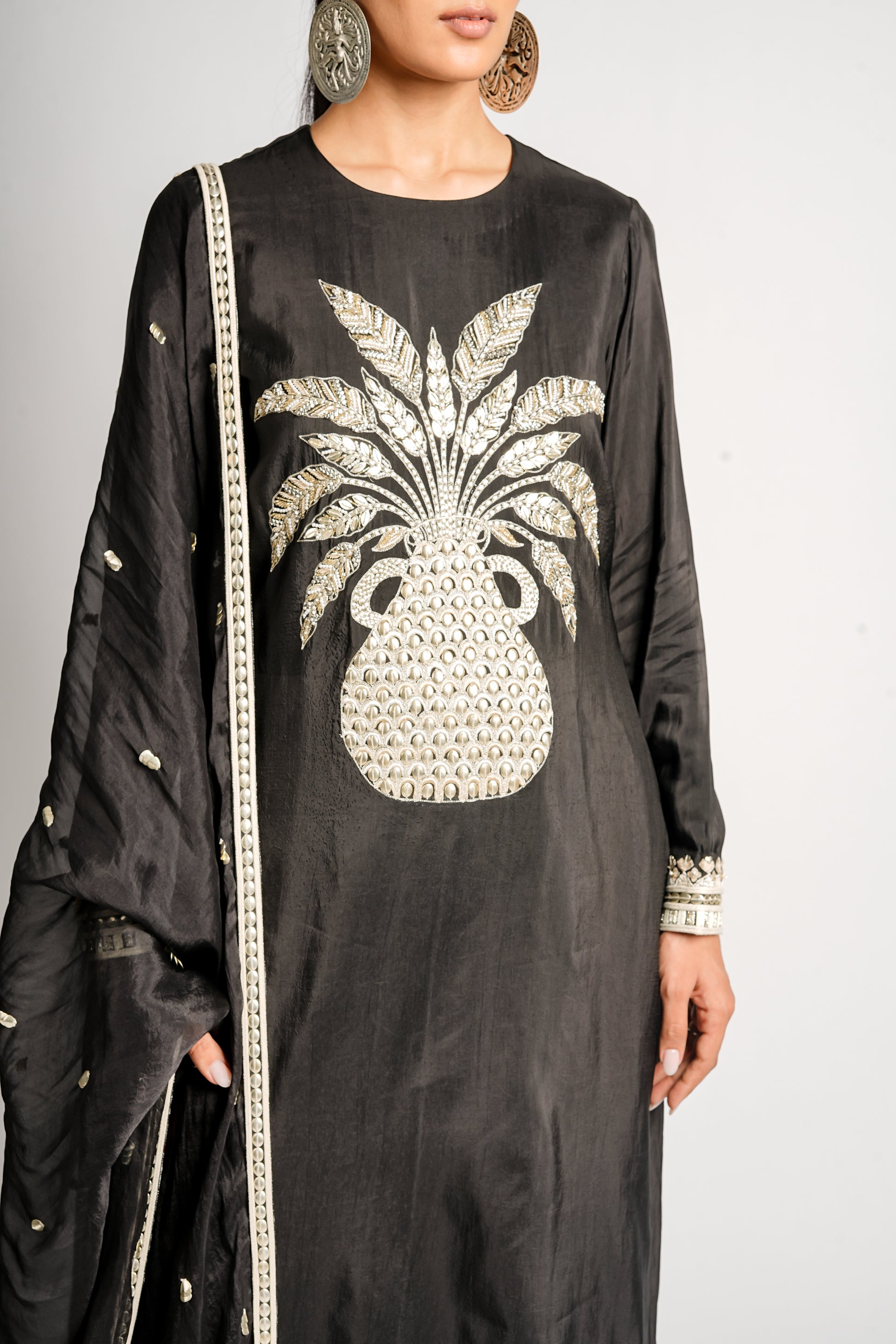 A striking black kurta set featuring a bold, embroidered flower pot motif paired with pants and a lightweight dupatta edged in delicate gold accents. The look blends playful detailing with elegant minimalism, making it a standout festive or evening ensemble.