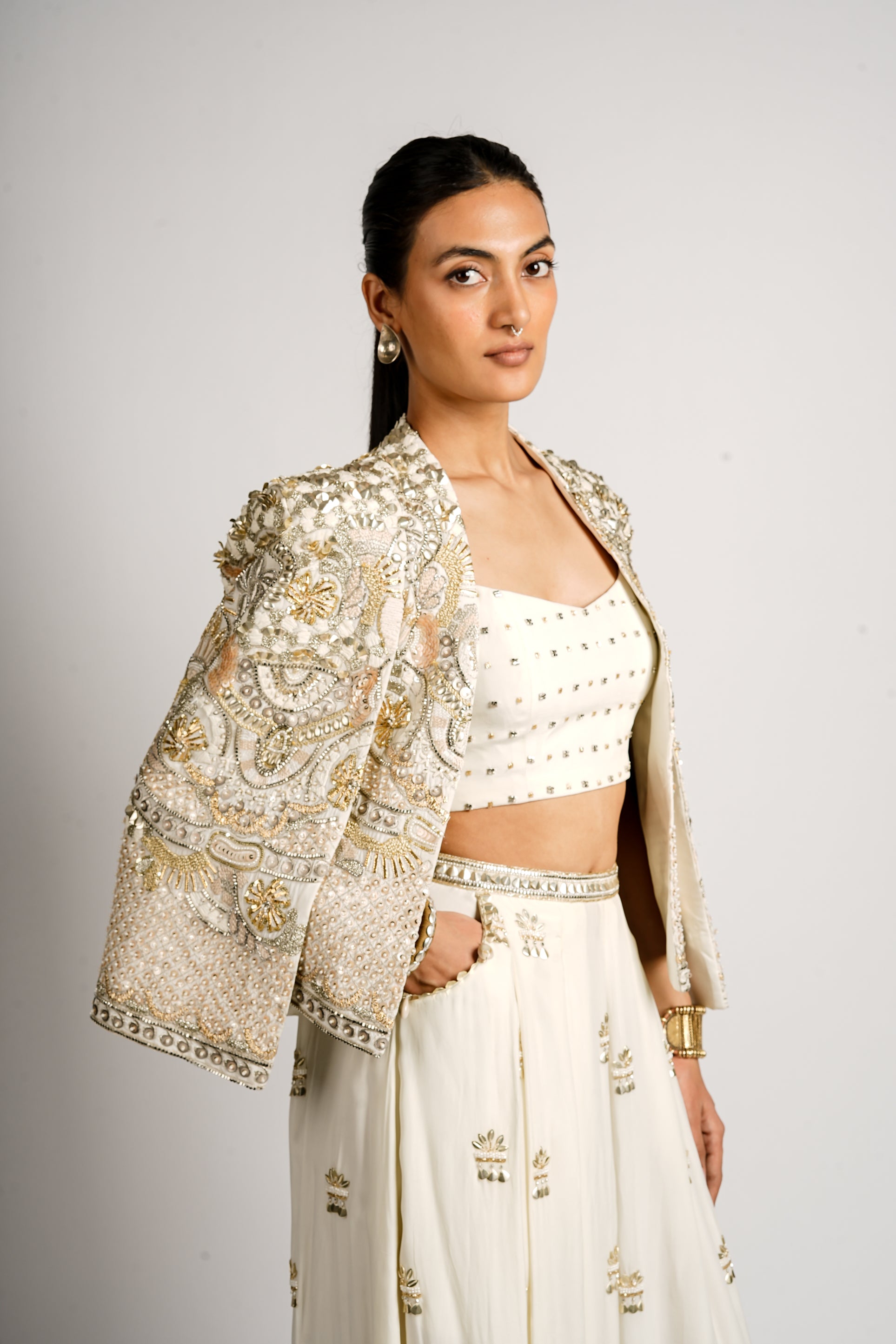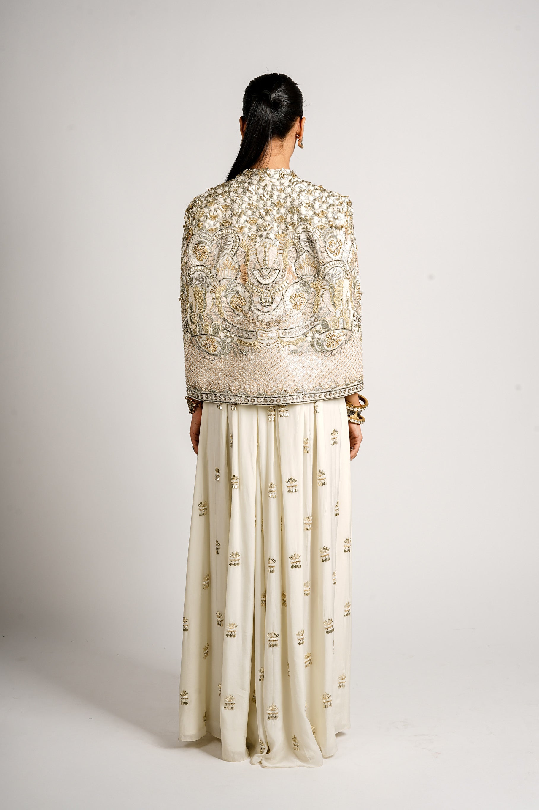 A contemporary ivory three-piece set featuring fluid pleated pants, a structured studded bustier, and a heavily hand-embroidered cape jacket, blending effortless elegance with statement sparkle.