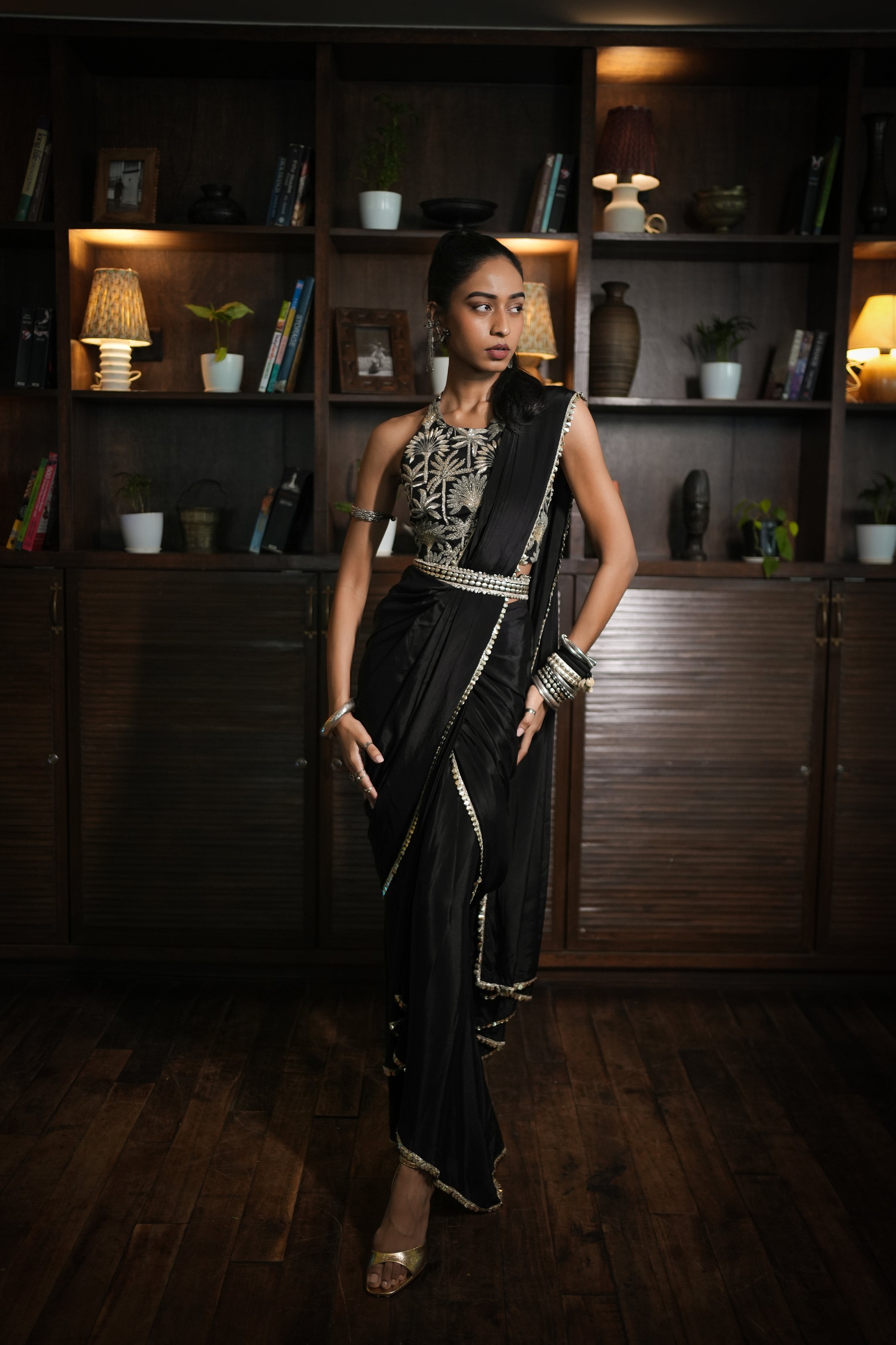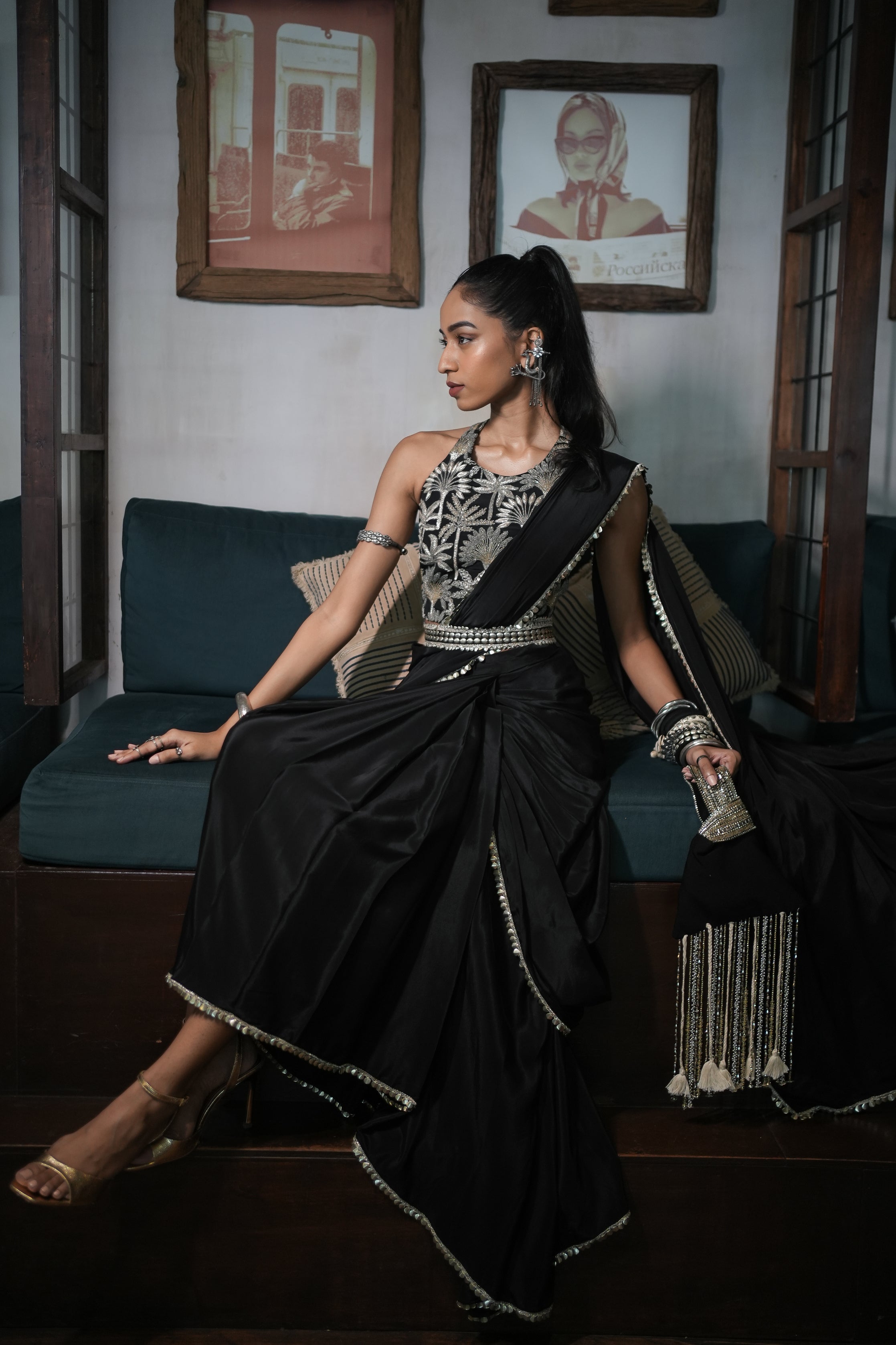 Striking a pose in this contemporary black saree ensemble, blending classic elegance with modern structure. The heavily embroidered palm embellished halter neck bustier top provides a glamorous contrast to the sleek, solid drape, cinched perfectly with a slim belt. Finished with bold statement jewelry, this look is pure cocktail party perfection for a sophisticated, festive evening.