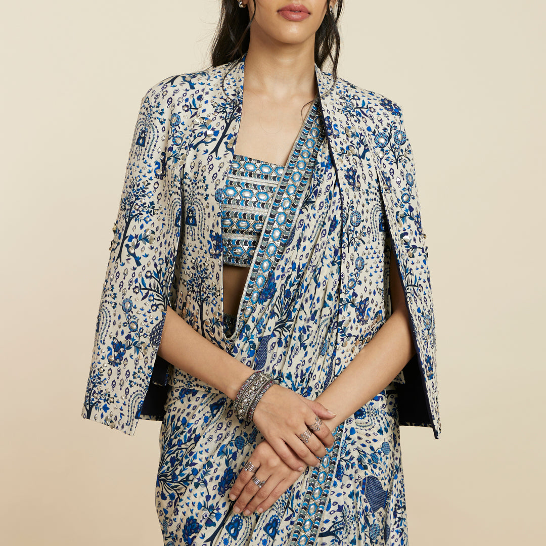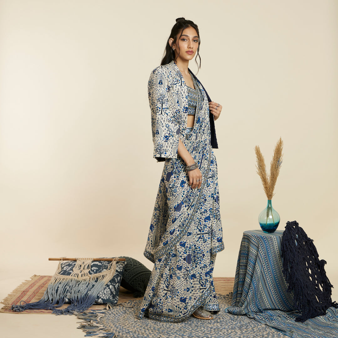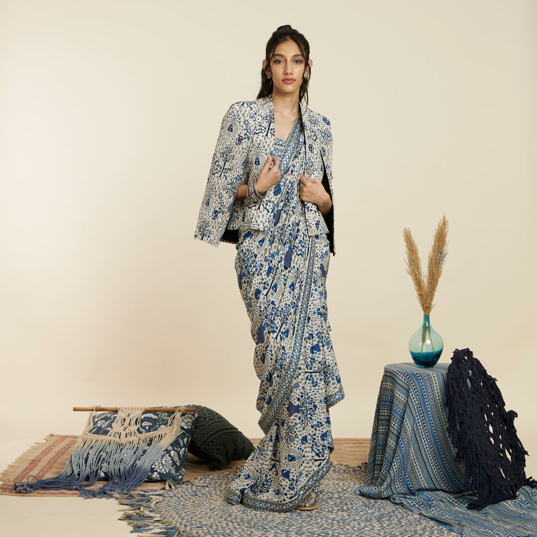 SAFAR BLUE JAAL CASCADE SAREE SET WITH A NOOR JACKET