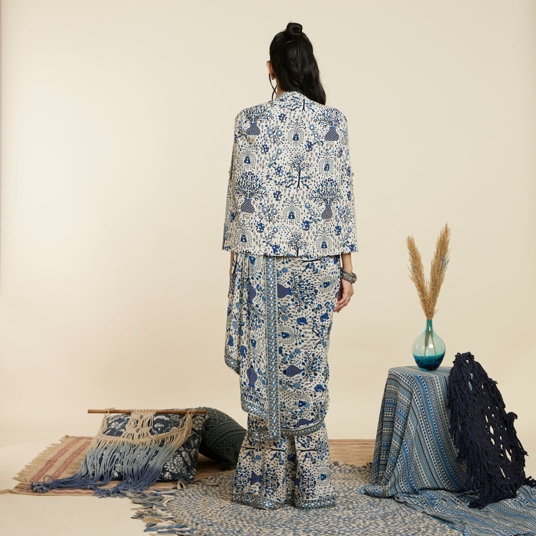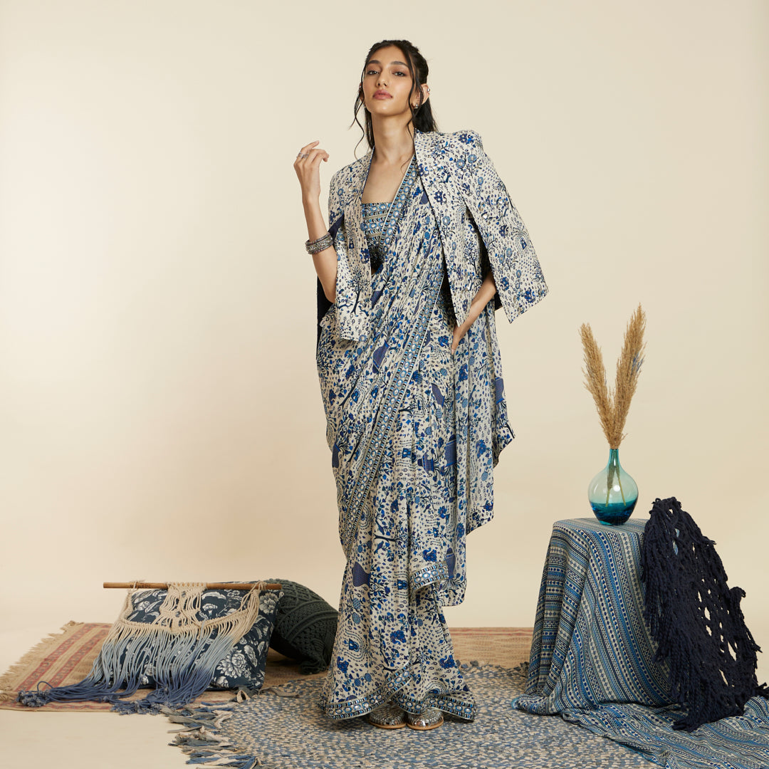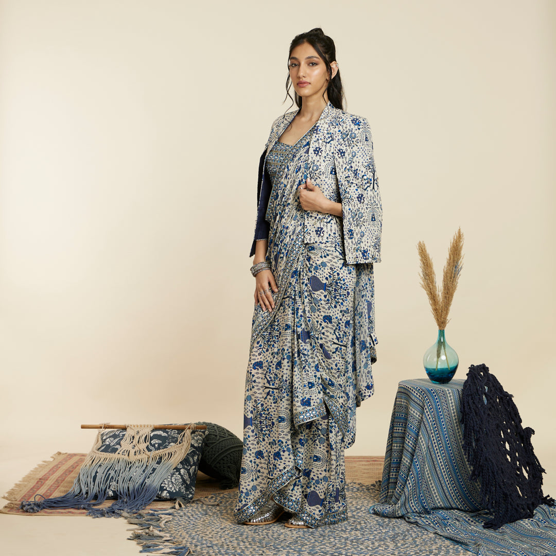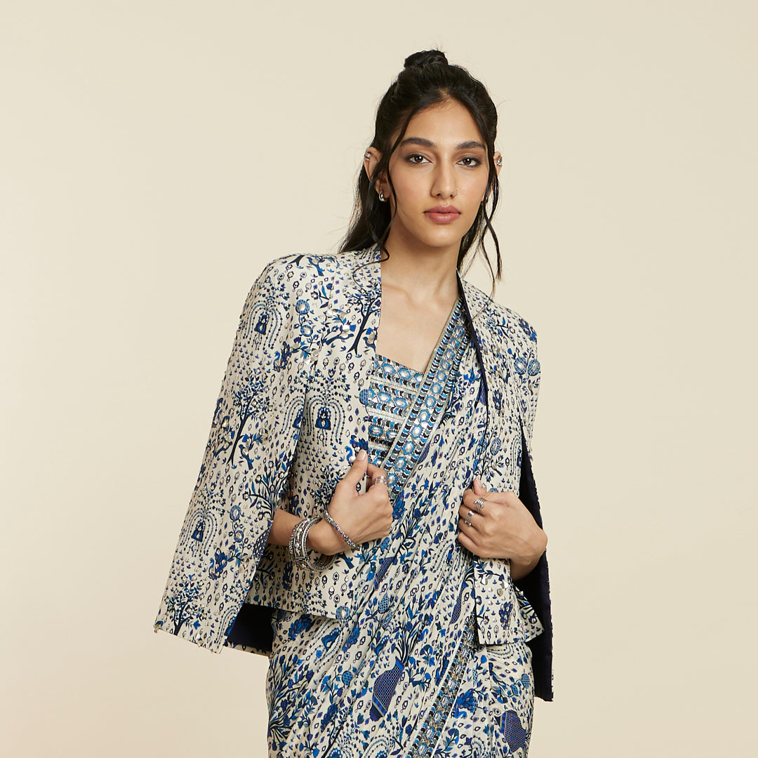 SAFAR BLUE JAAL CASCADE SAREE SET WITH A NOOR JACKET