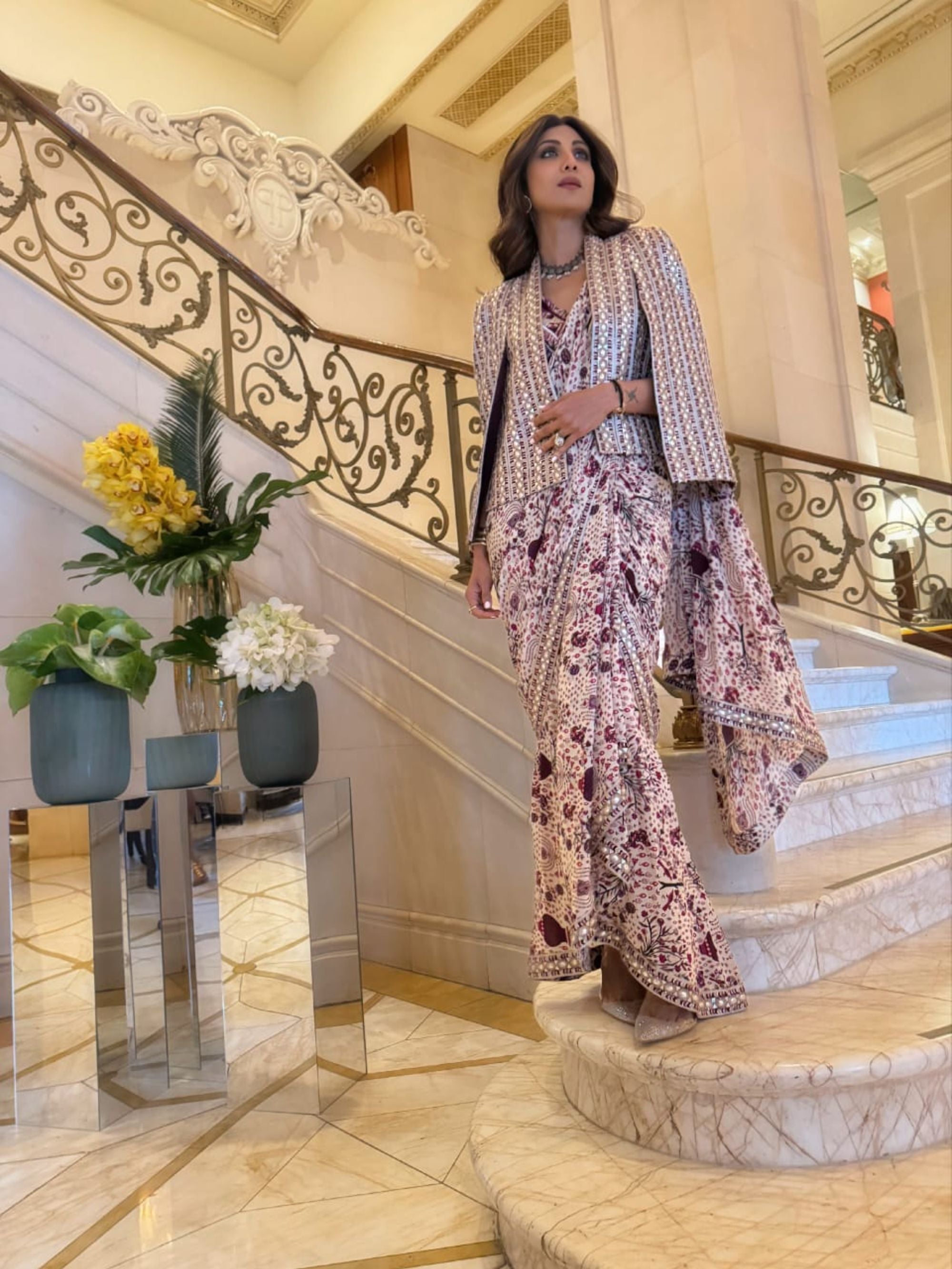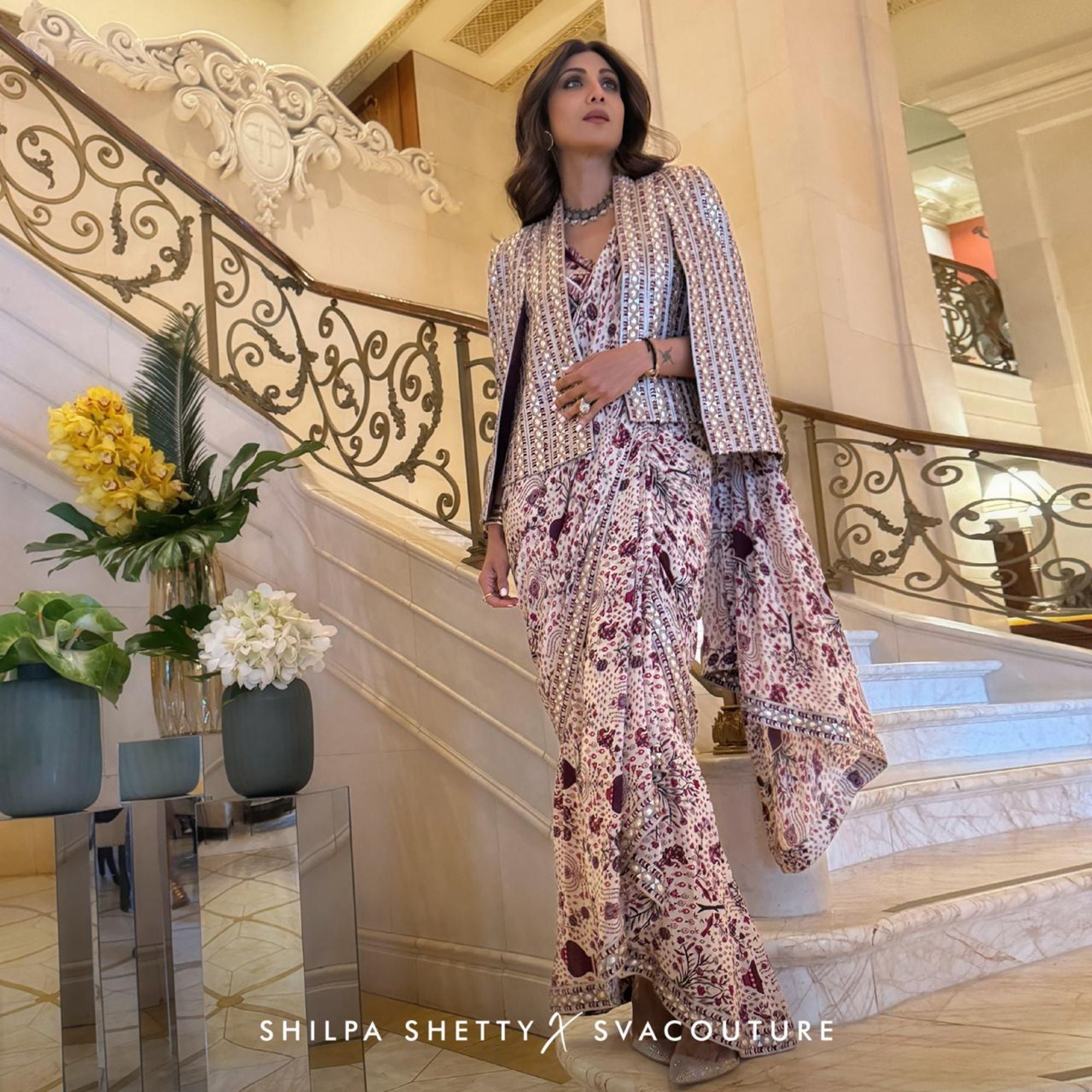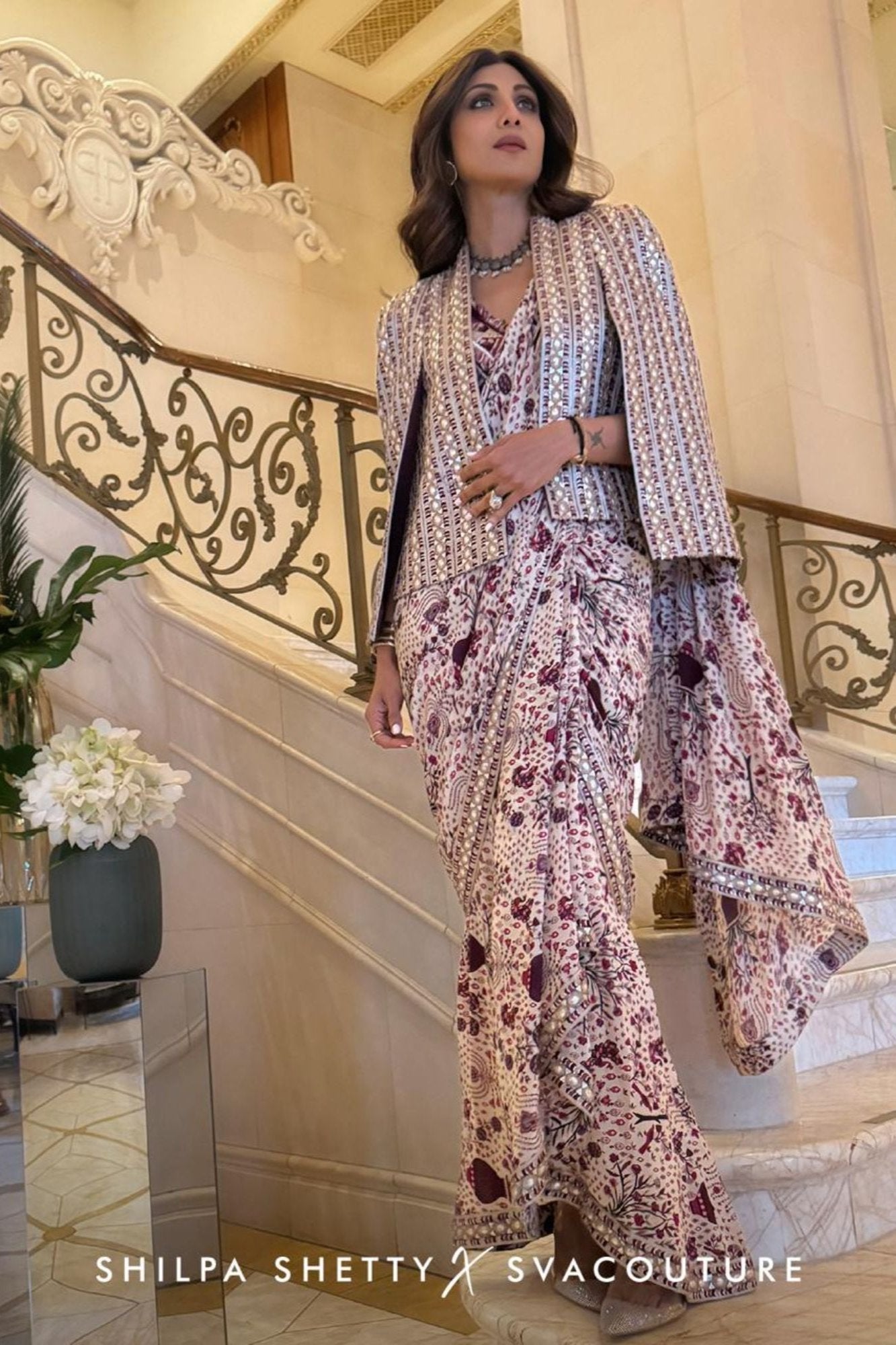 Featuring a Safar Merlot jaal cascade saree paired with texture bustier and embellished cape jacket.