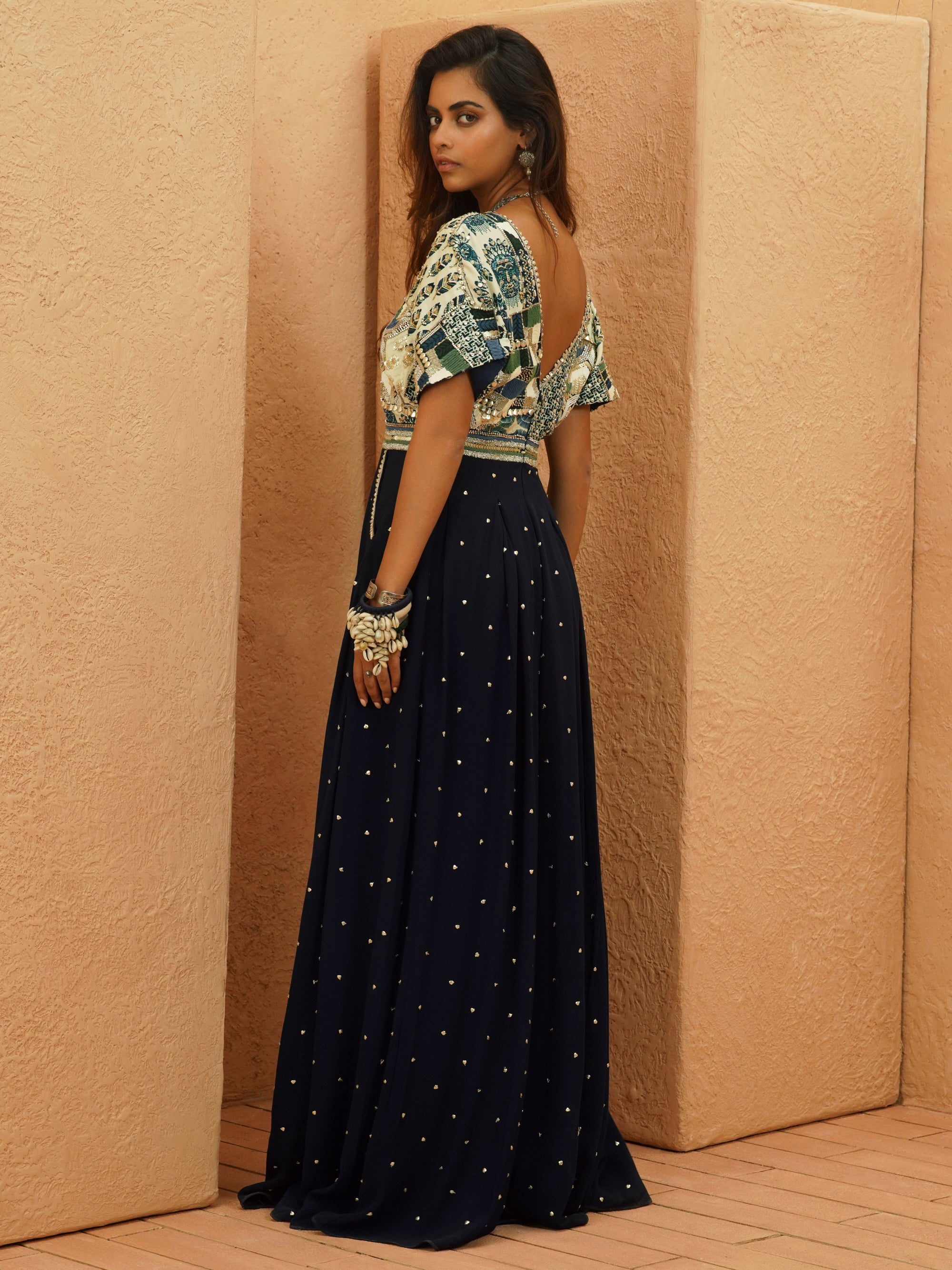 A striking navy jumpsuit featuring an intricately hand-embellished patchwork bodice with a mix of textures, metallic work, and bead detailing. The flowy wide-leg silhouette is adorned with delicate sequins, adding a touch of understated glamour to this fusion ensemble.