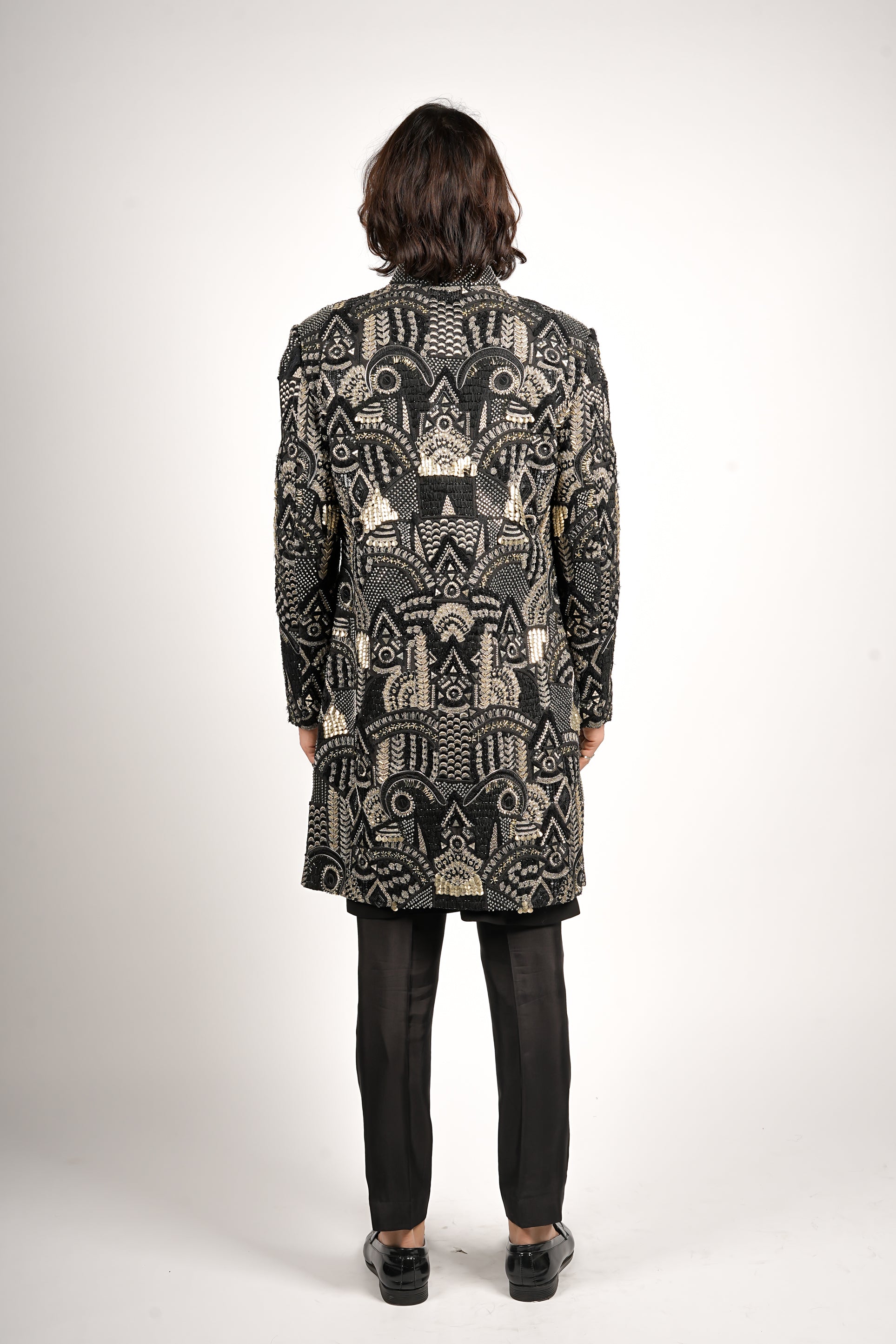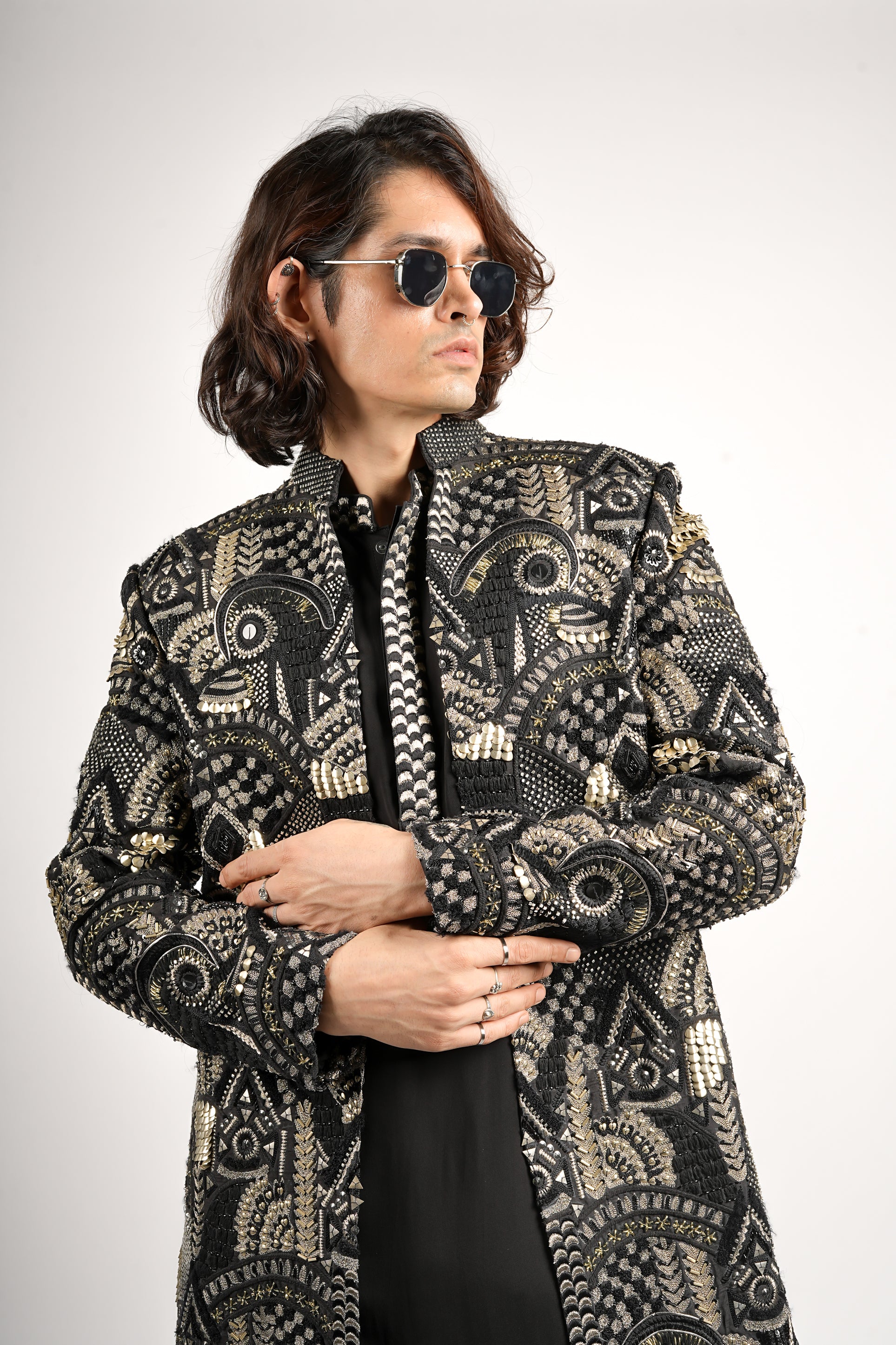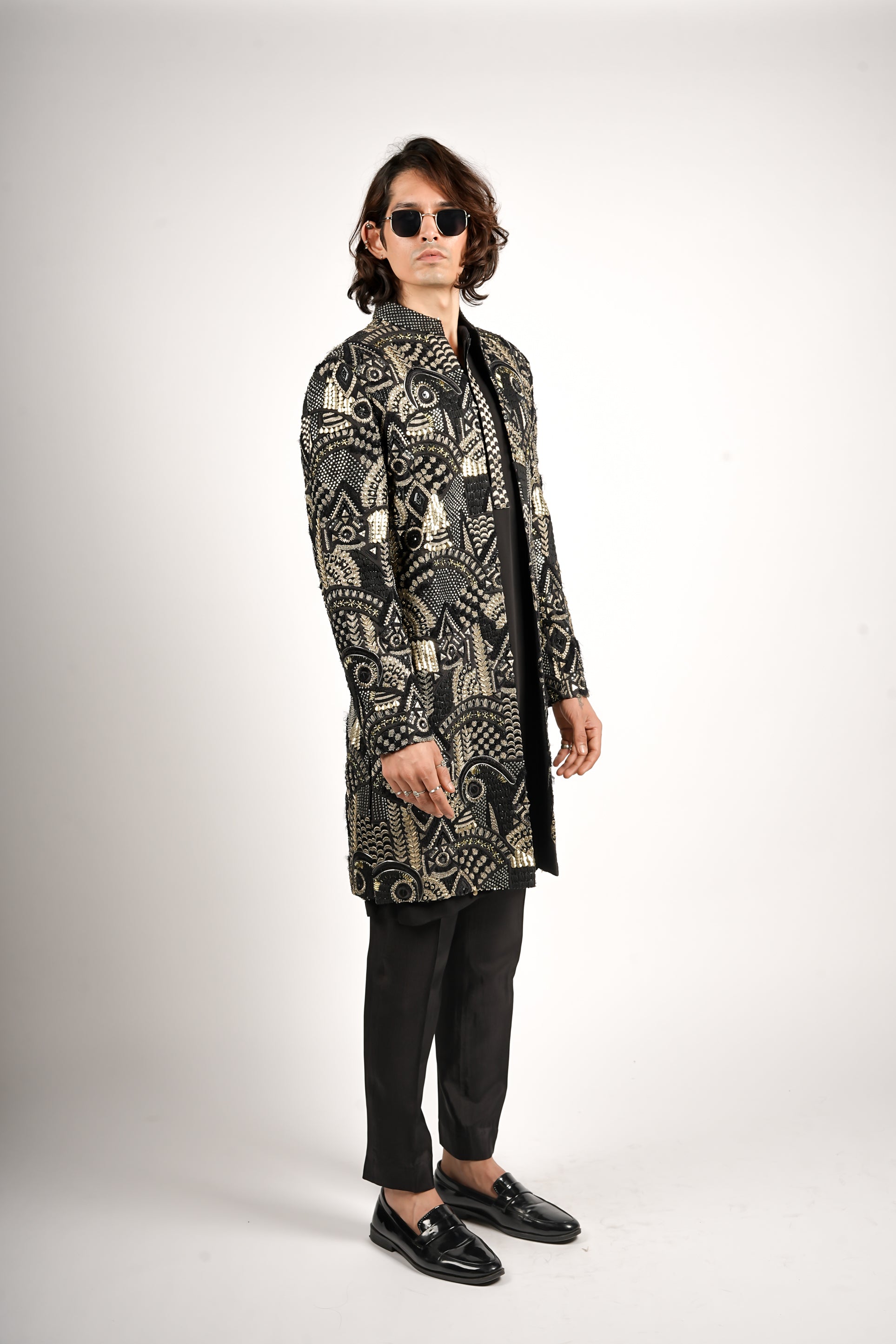 A striking black sherwani set featuring intricate metallic embroidery layered over a sleek black kurta and pant. Bold, opulent, and statement driven designed for elevated festive and evening celebrations.