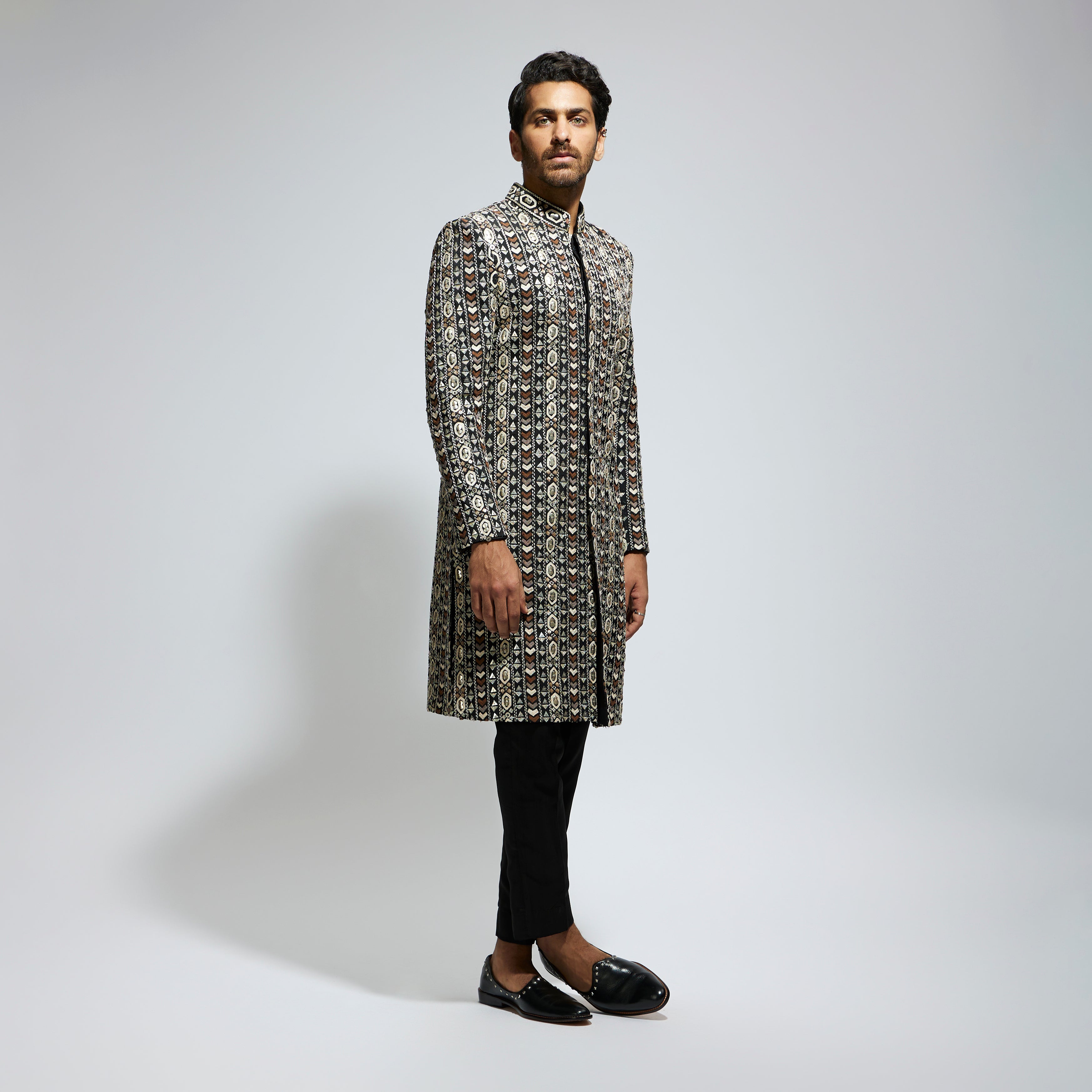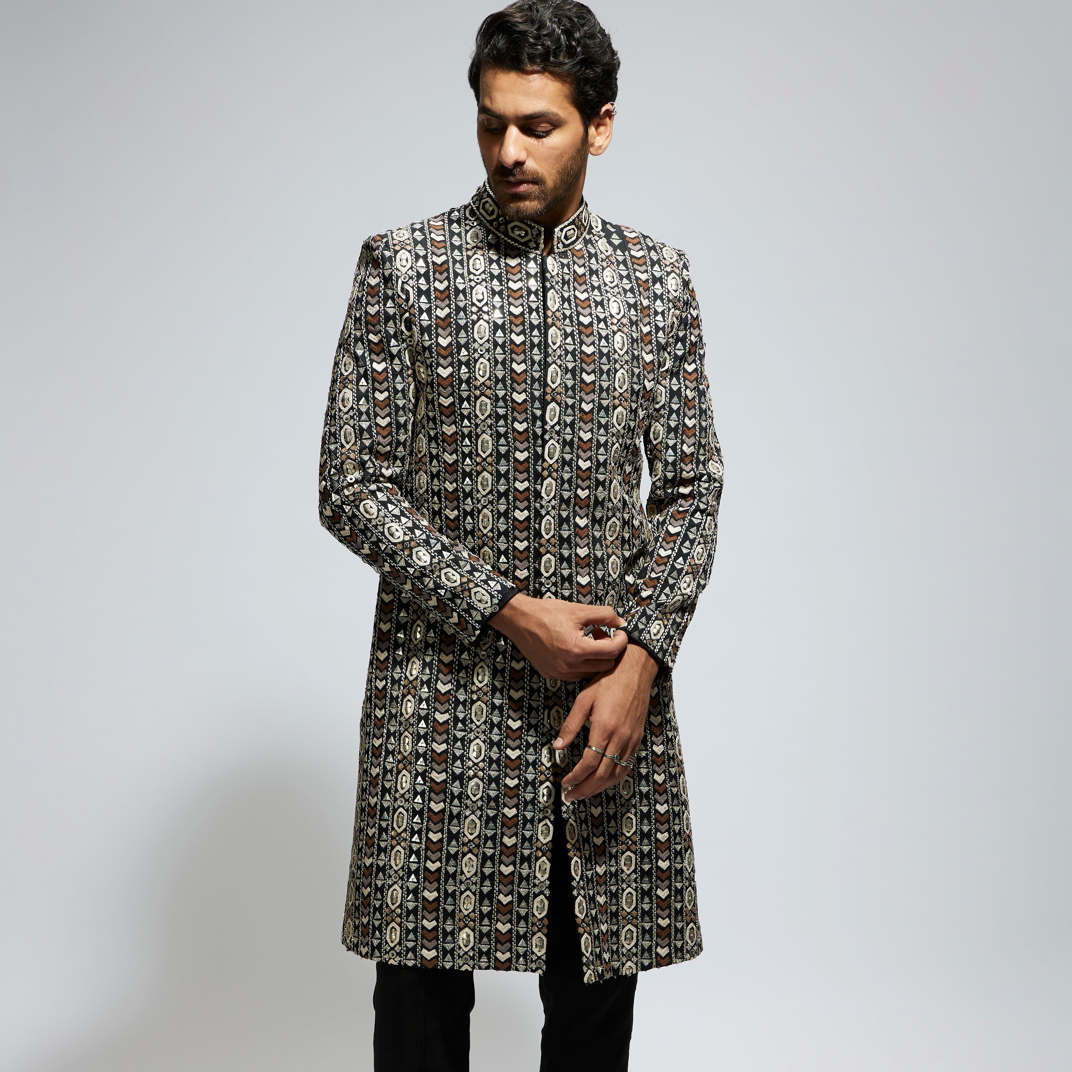 BLACK GEO EMBROIDERED SHERWANI WITH PANTS