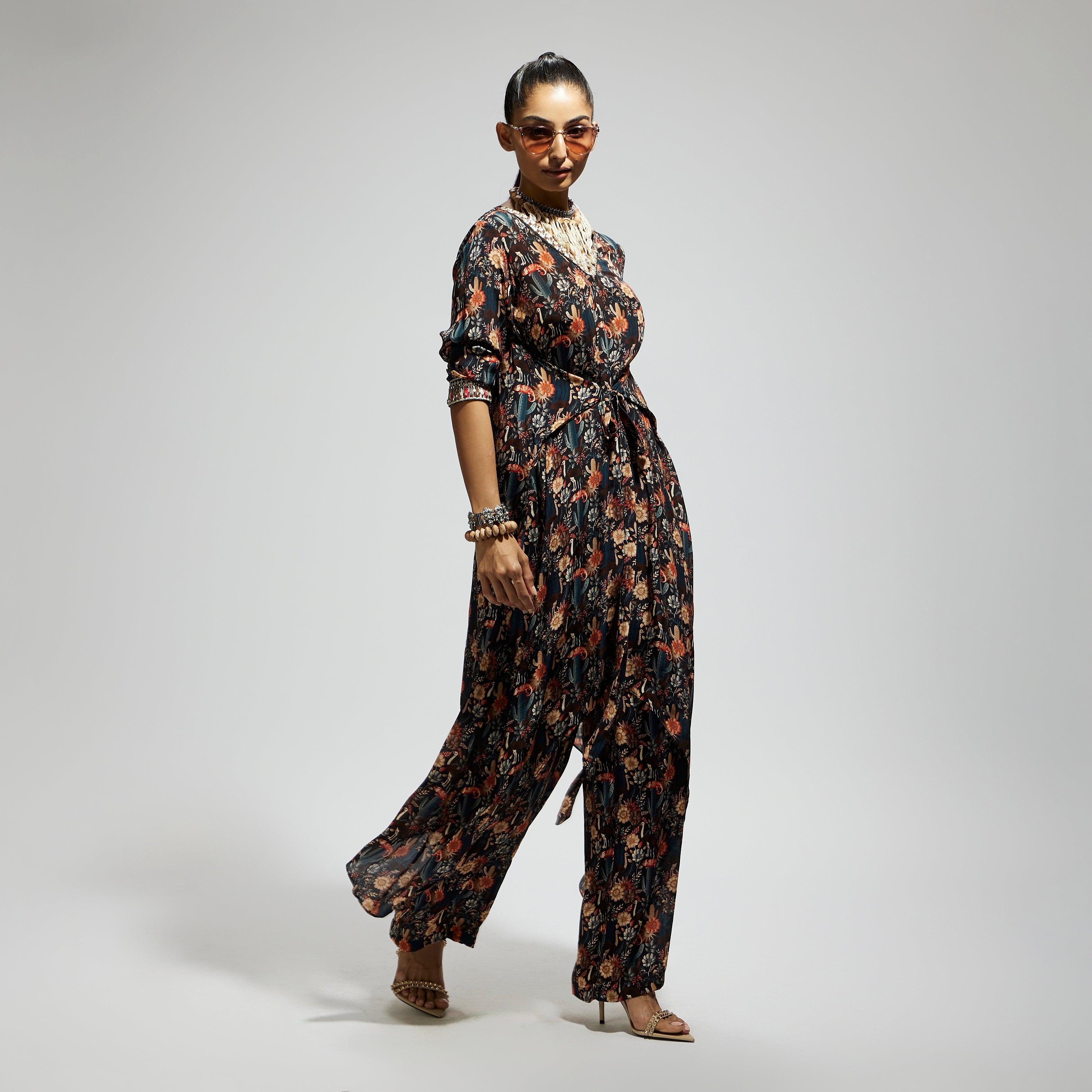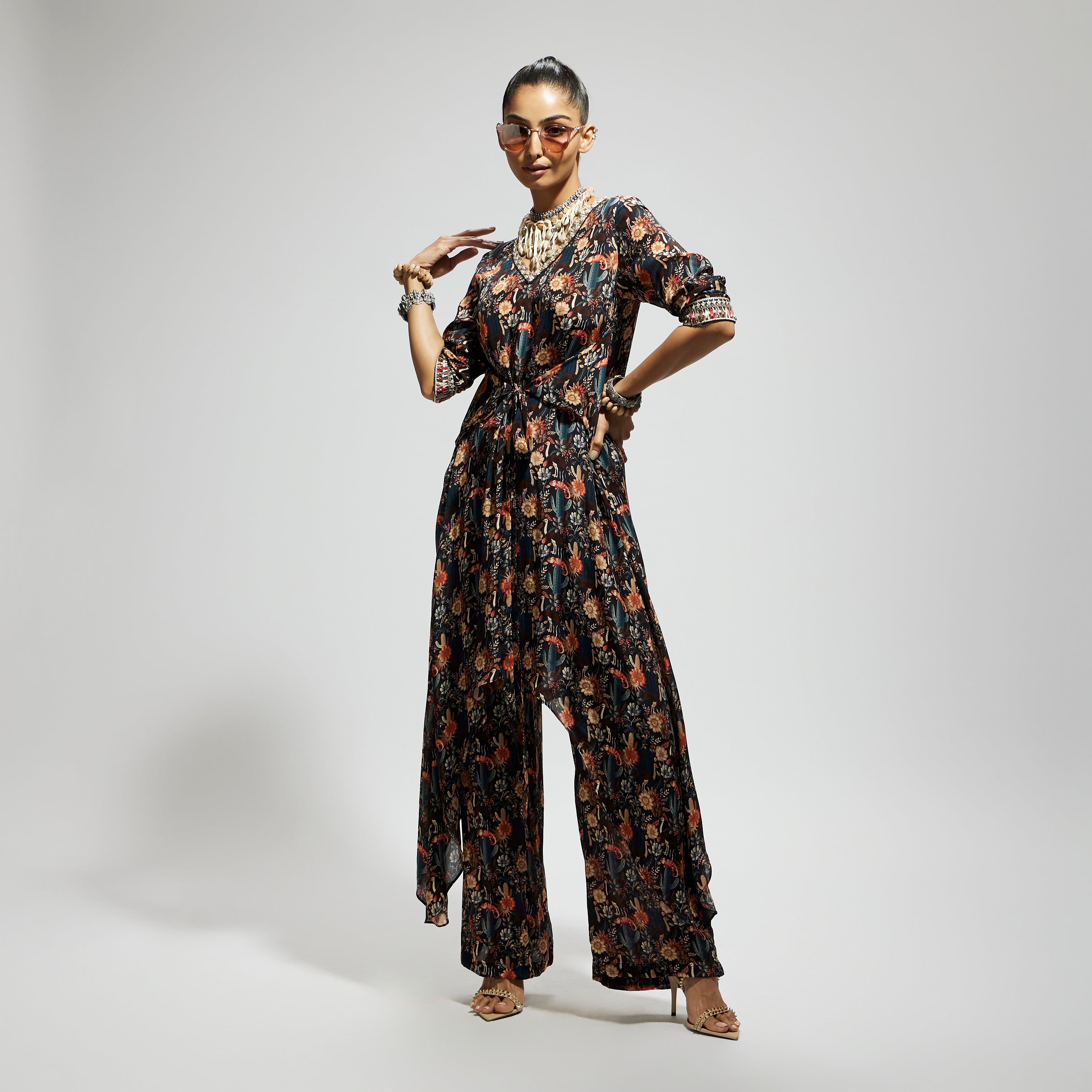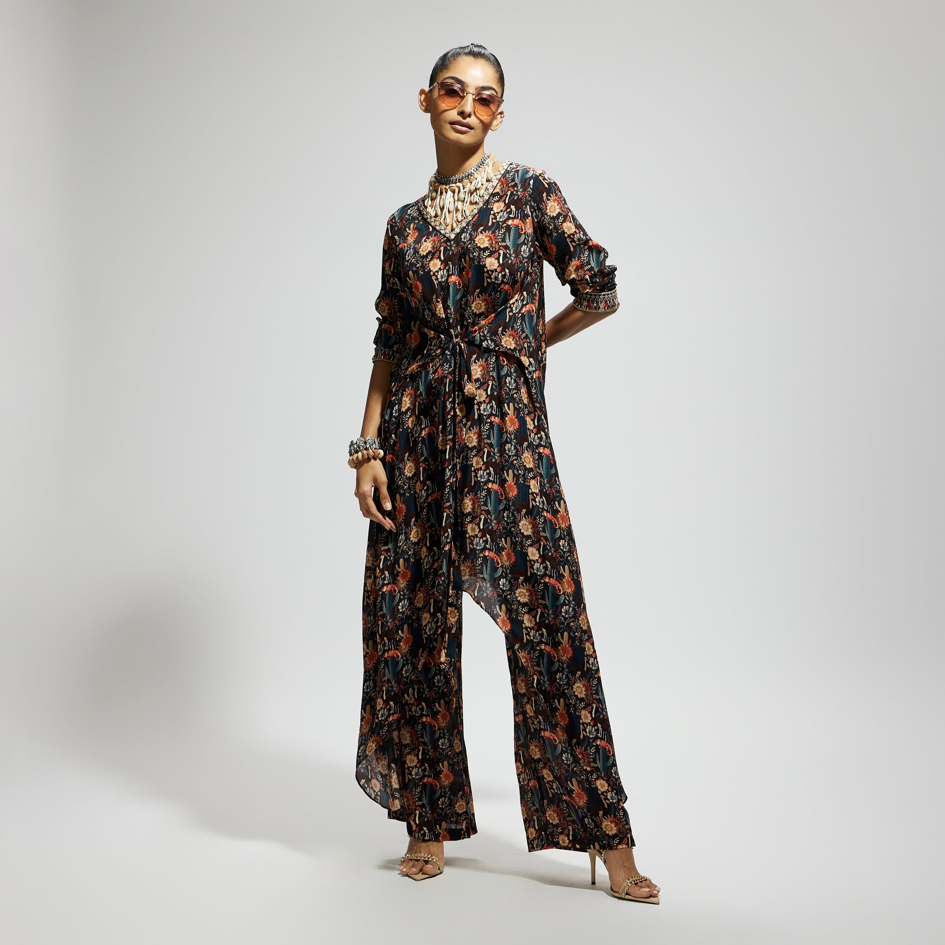 The black jaal print front tie-up tunic is paired with pants fabric air jet crepe component 2 pants.