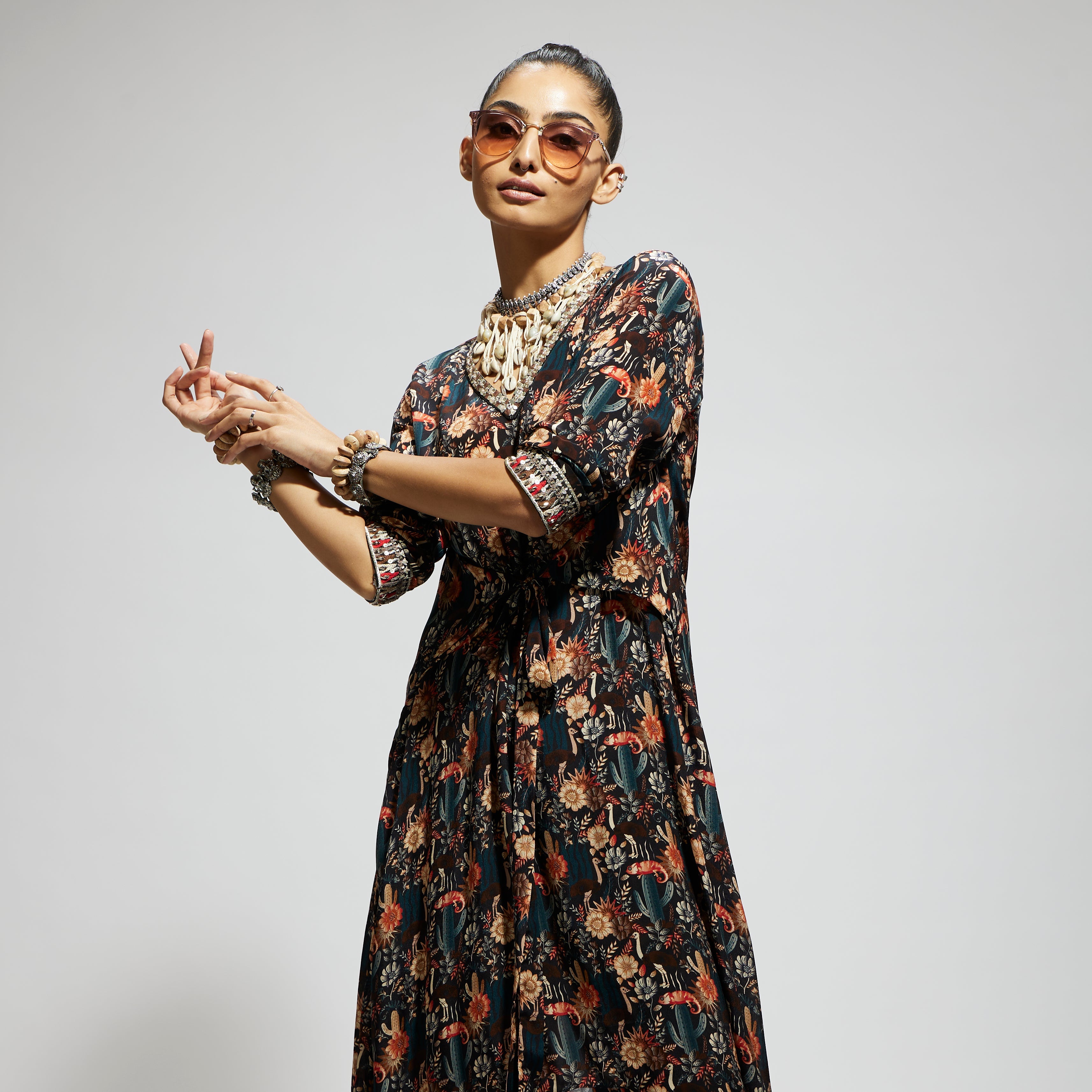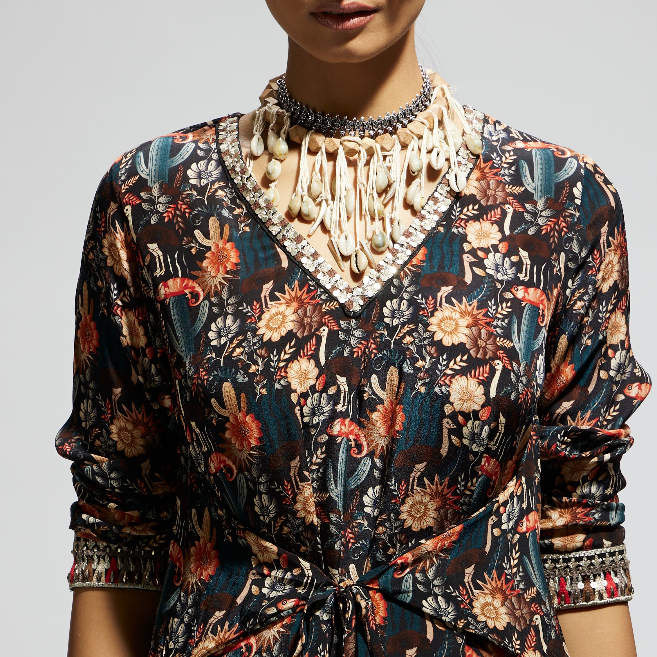 SAMSARA: BLACK JAAL PRINT FRONT TIE UP TUNIC