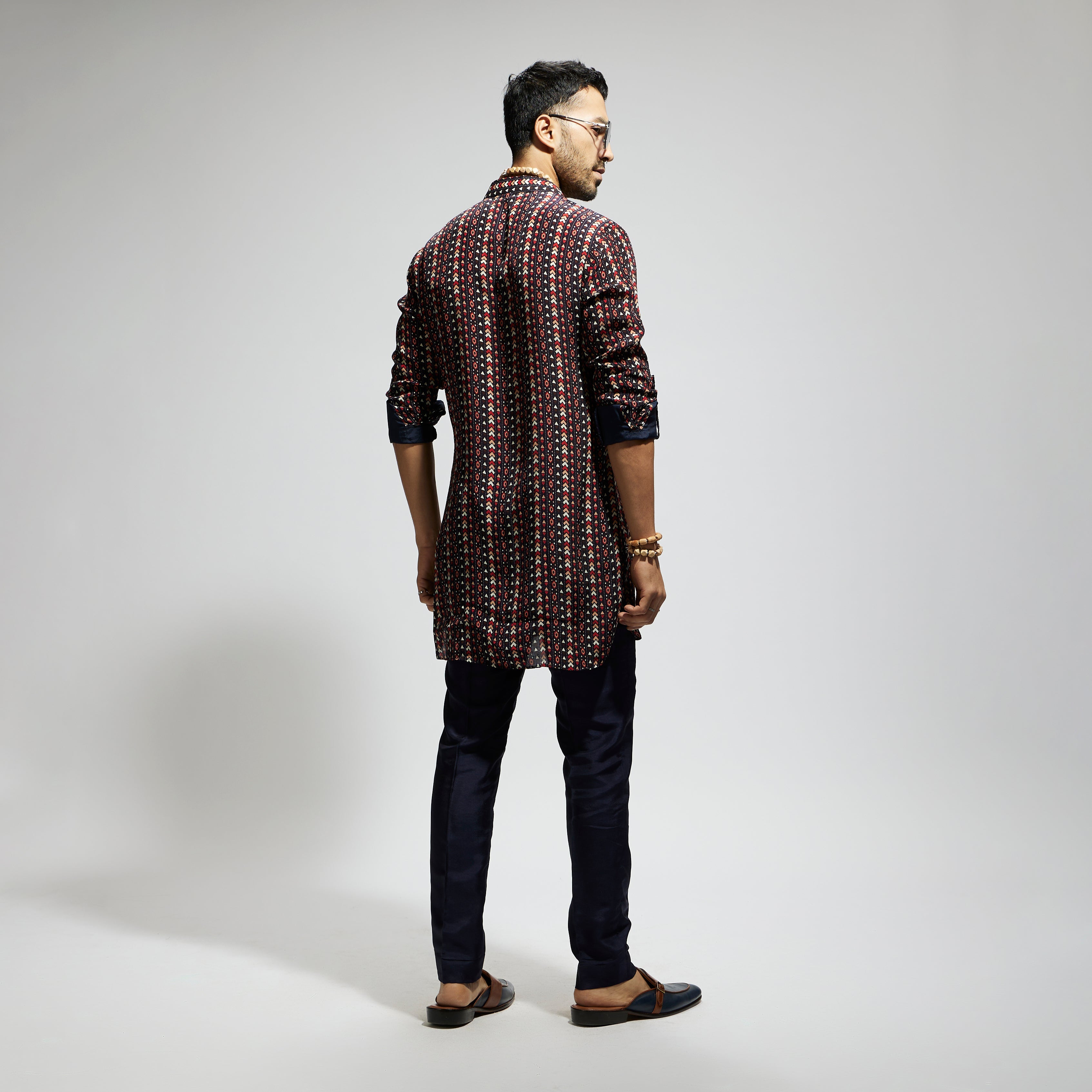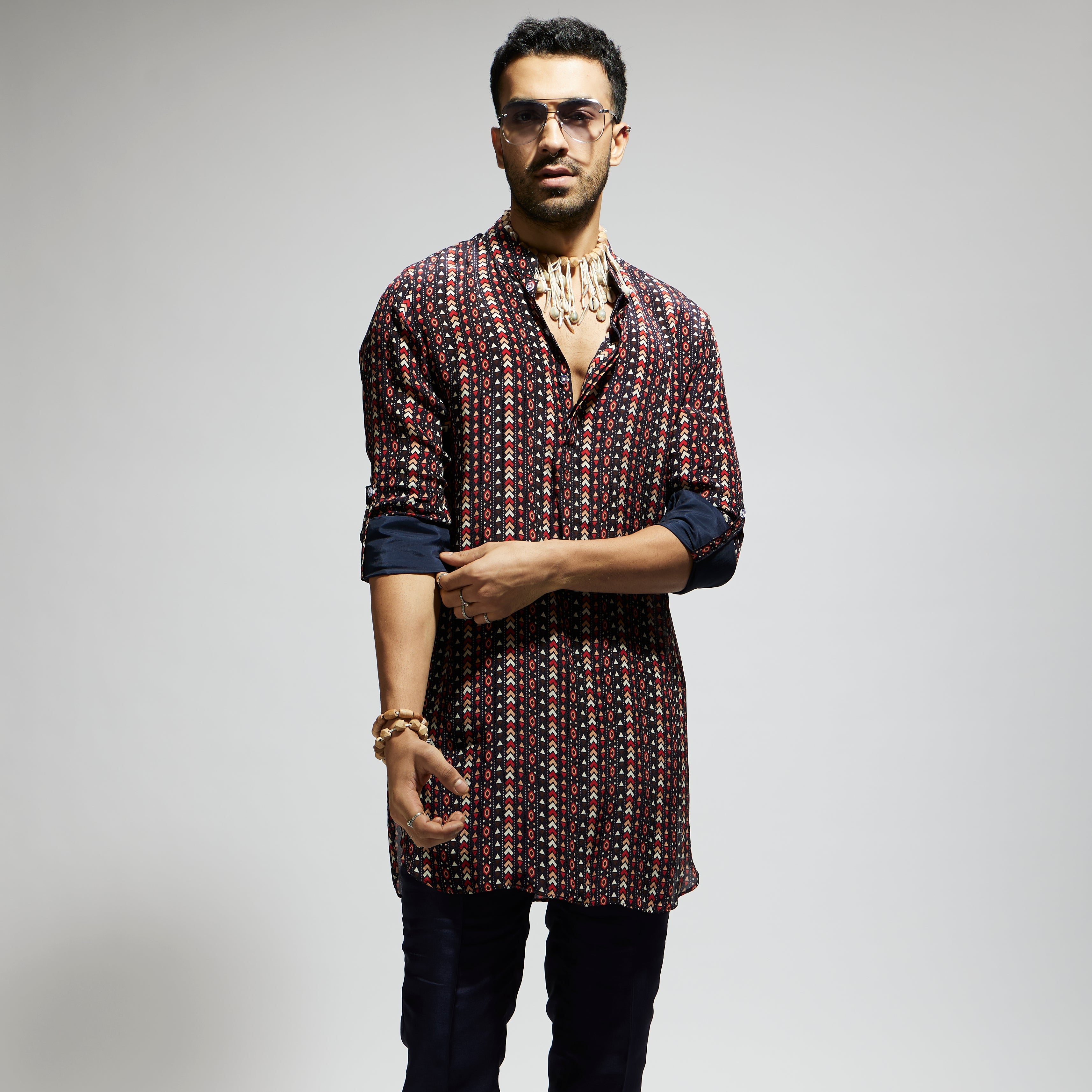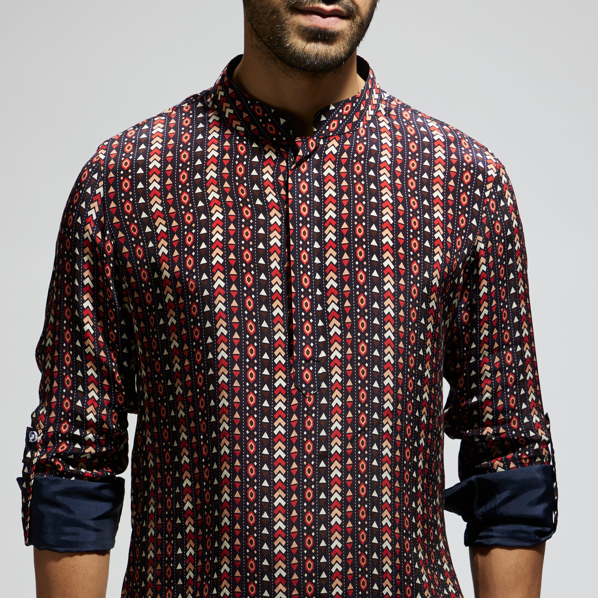 SAMSARA: BLUE BOHO PRINT ROLLED UP SLEEVES KURTA
