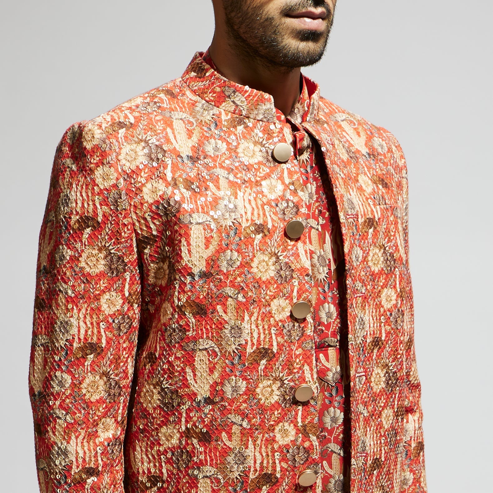 Featuring a orange jaal embellished bandhgala, fabric crepe, sequins, habutai and Component 1.
