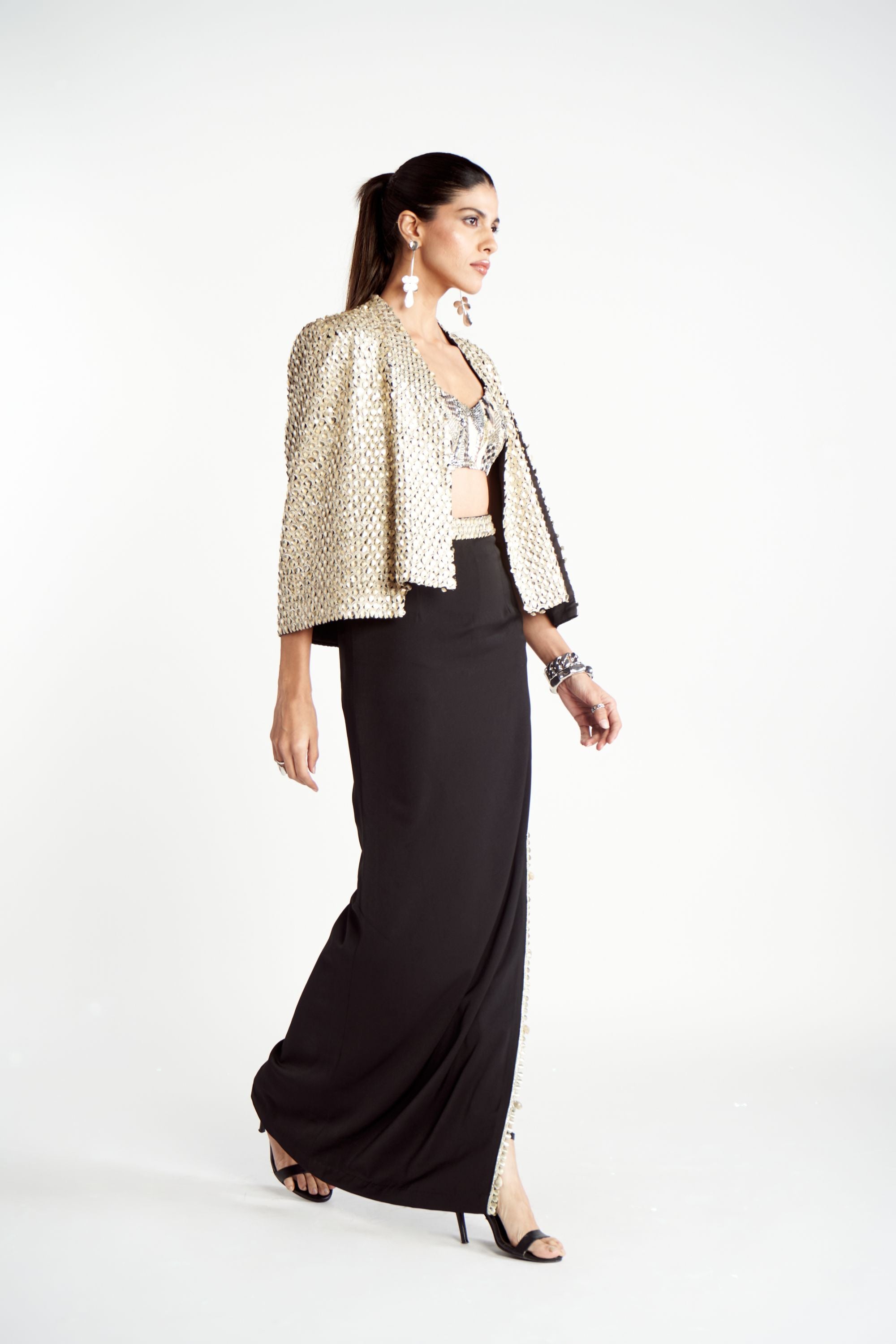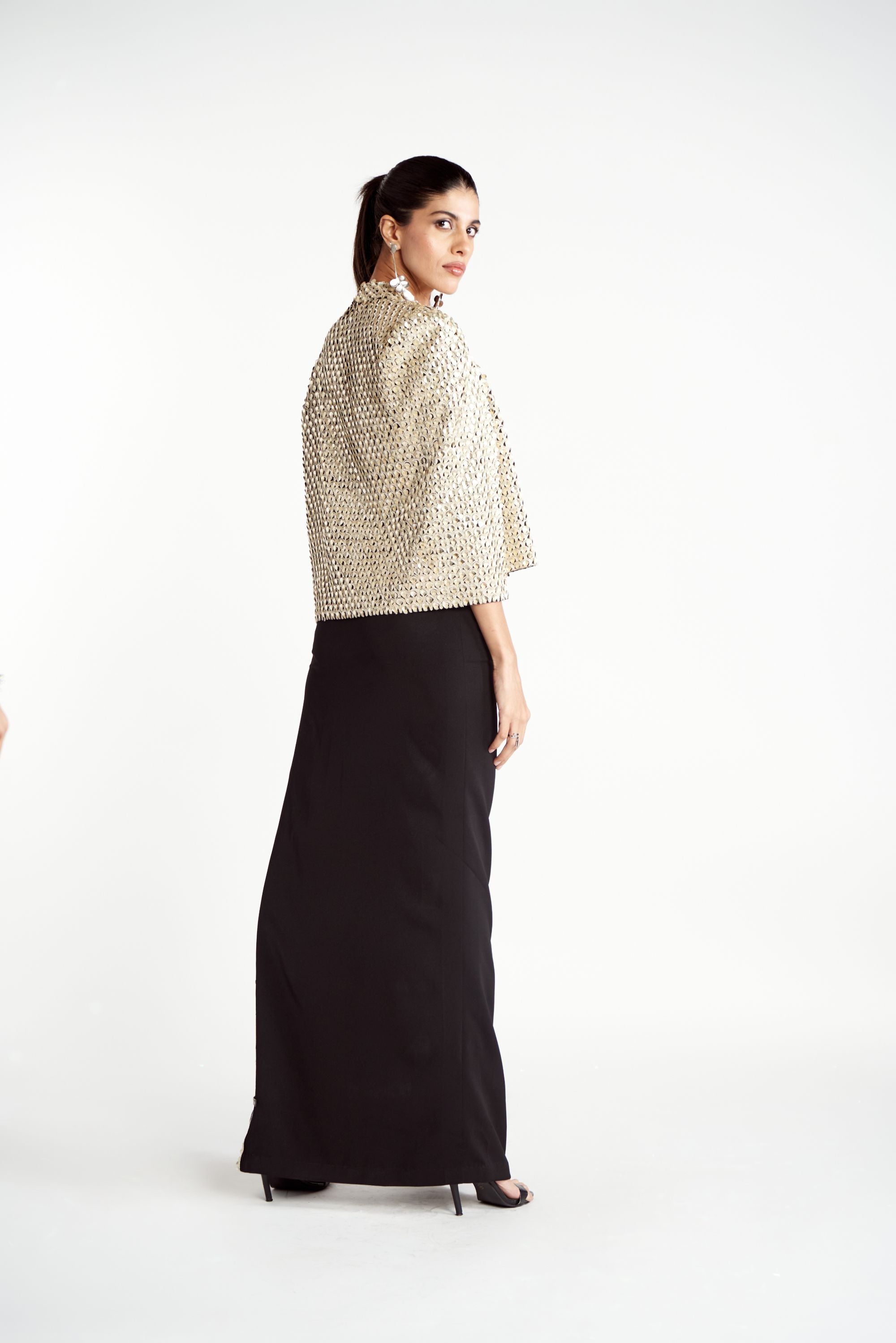 Make a bold statement with the Scalloped Embroidered Noor Jacket, a true testament to the brand's impeccable craftsmanship. This jacket is meticulously hand-embroidered with metallic scallop patterns, offering a luxurious and visually striking design. The intricate detailing adds depth and texture, making it a standout piece that effortlessly combines opulence with contemporary style. Whether layered over a chic outfit or worn as the centerpiece of your look, this jacket is sure to turn heads and leave a lasting impression.