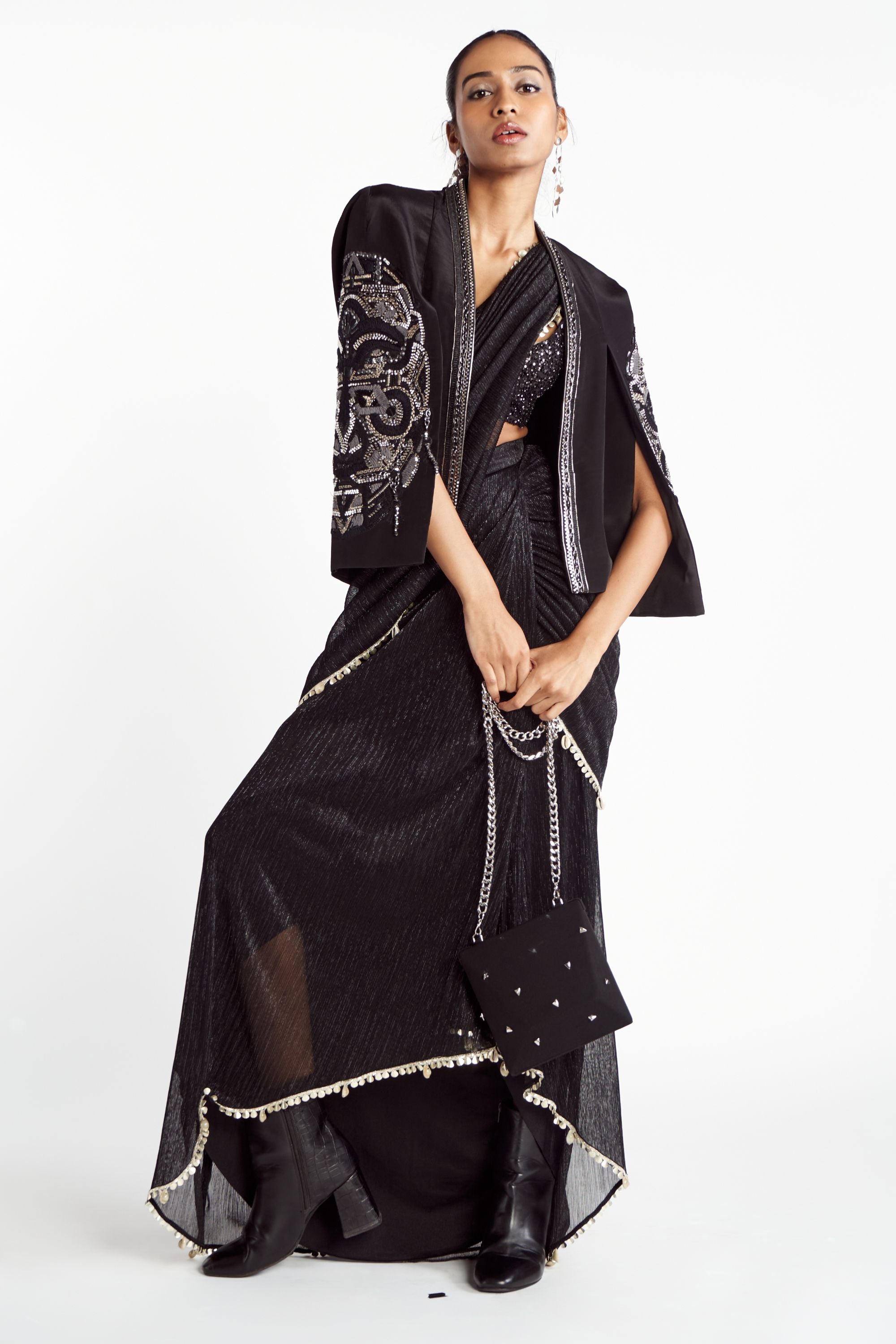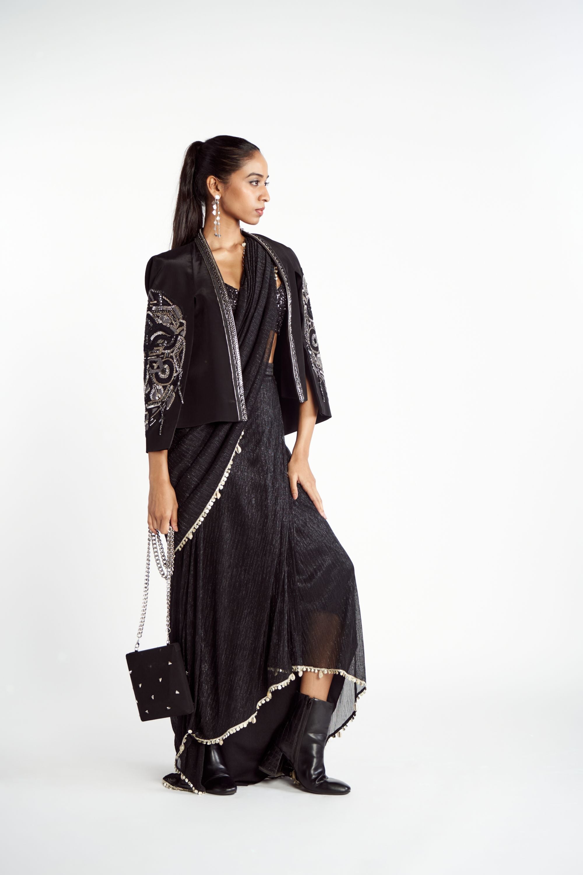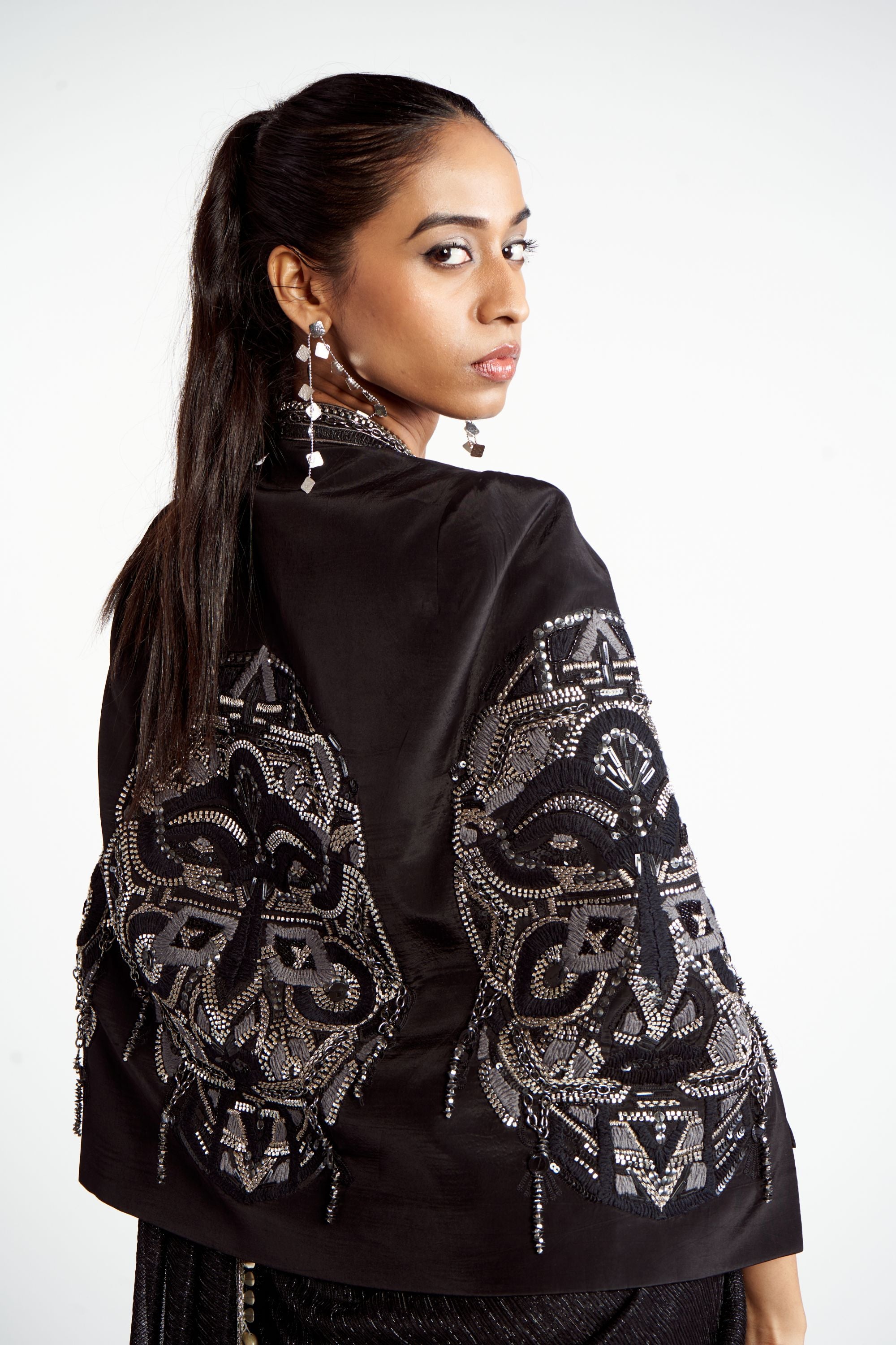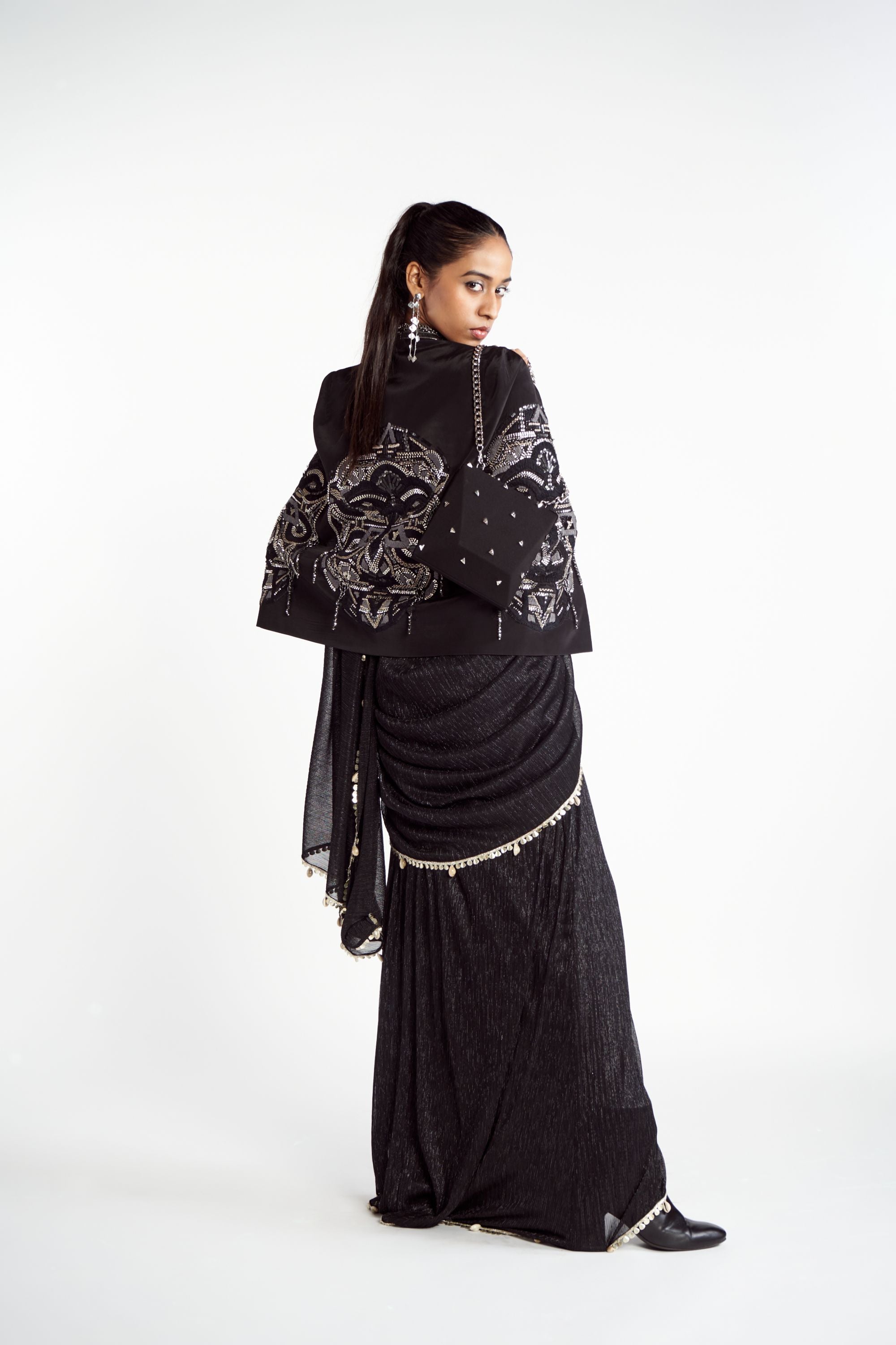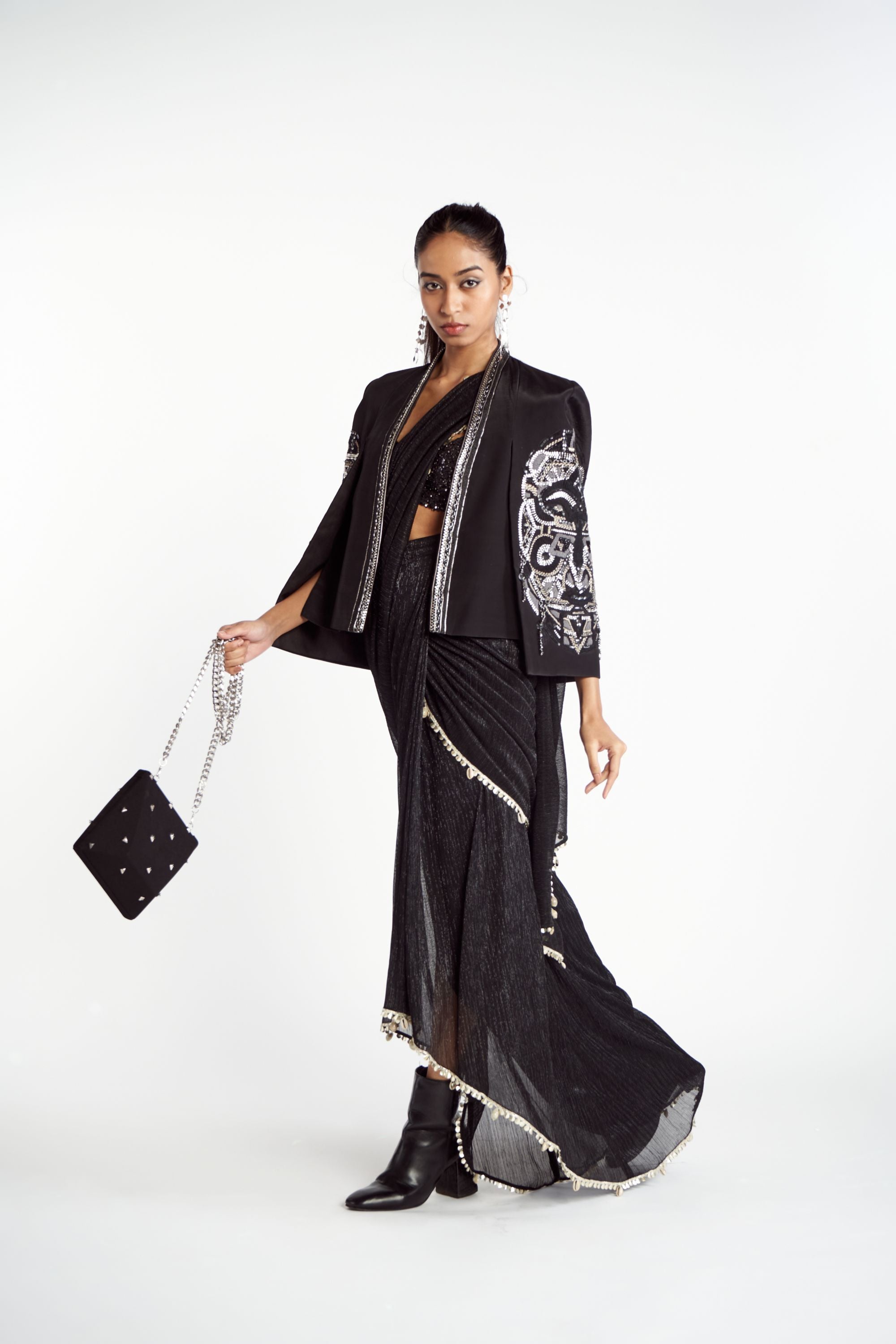 Take your ensemble to the next level by styling it with our signature Noor Jacket, a draped masterpiece that exudes opulence. The jacket showcases intricate metallic embroidery inspired by the brand's collection, featuring three intricately embroidered masks as the focal design. This unique combination of textures and details makes it a truly standout piece for those who dare to dazzle. Whether worn together or separately, the Cascade Saree and Noor Jacket promise a look that's unforgettable.