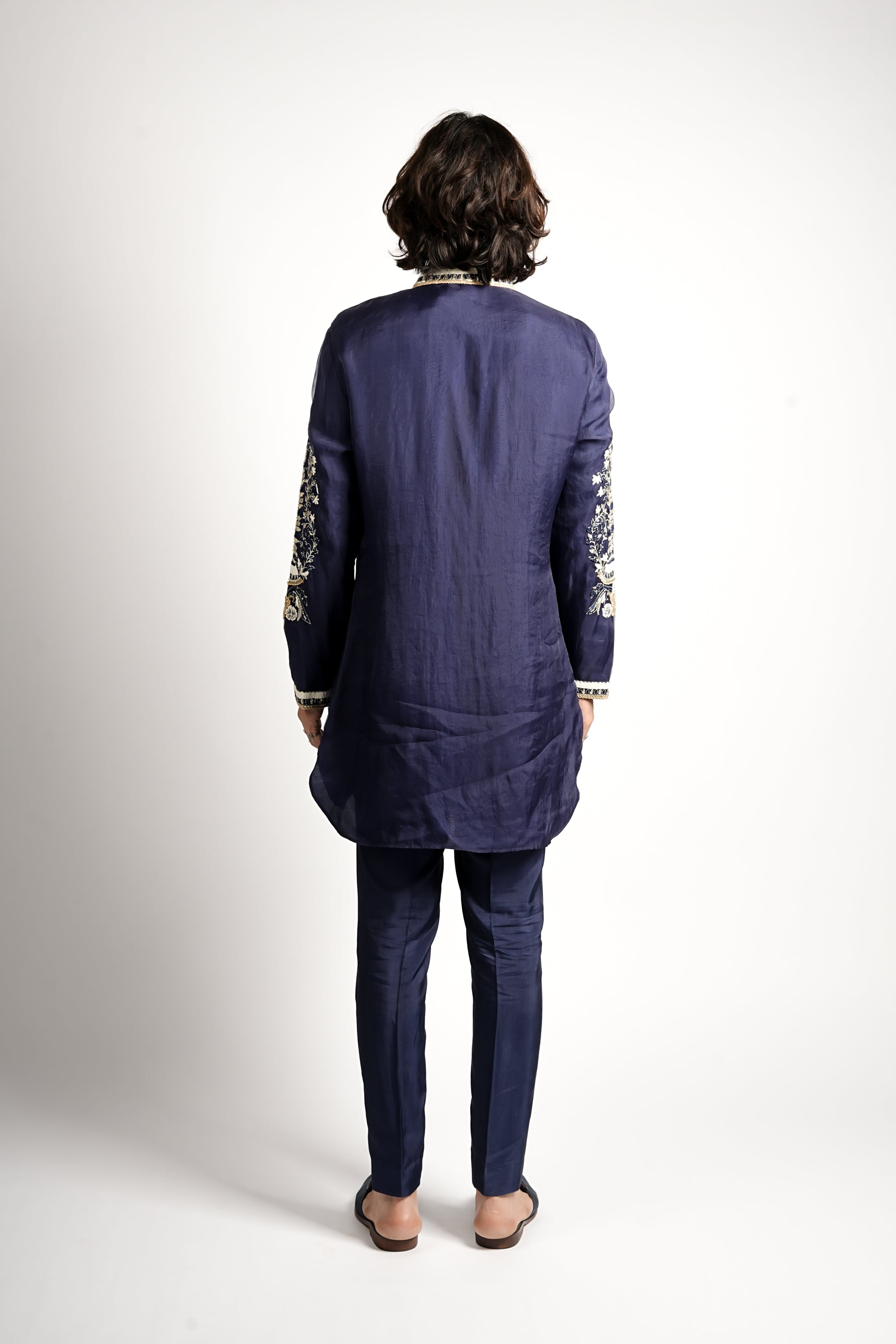 This is a vibrant royal blue kurta, featuring a clean, straight-cut silhouette. The collar, front placket and cuffs are beautifully detailed with white, gold, and blue embroidery, with a floral motif on the full-length sleeves, creating a striking and refined festive look.
