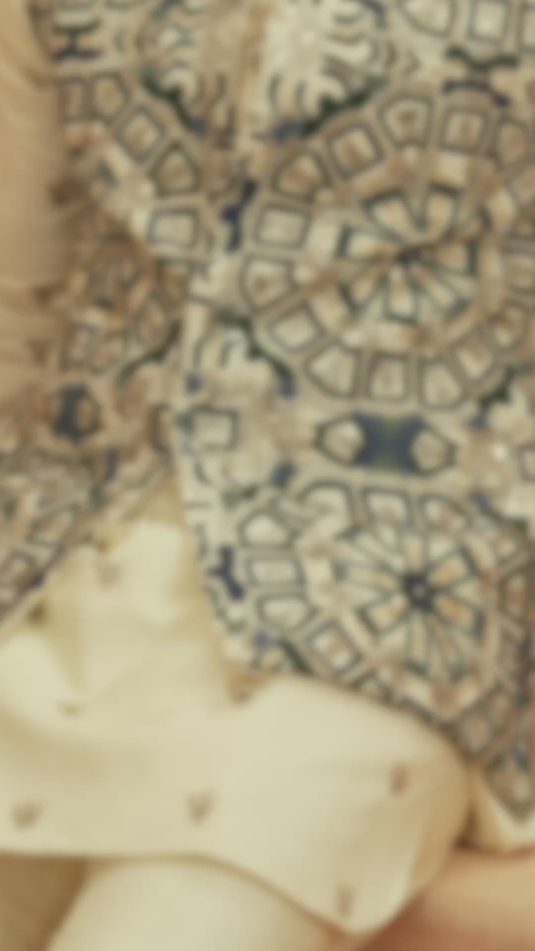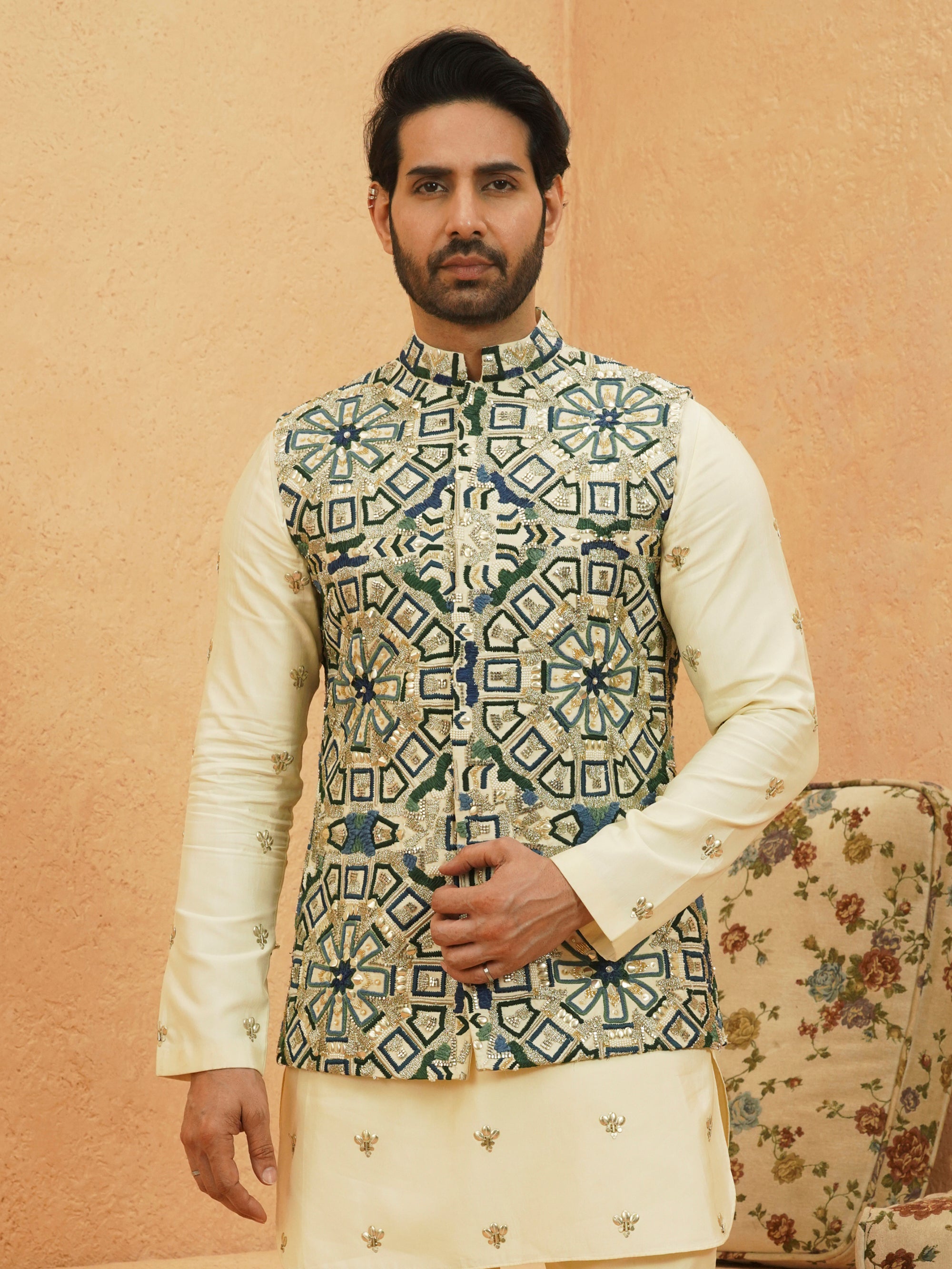 This bundi jacket features intricate geometric embroidery in shades of blue, green, and gold, creating a striking and regal look. Paired with an ivory kurta set adorned with delicate embellishment, it exudes a blend of tribal craftsmanship and contemporary elegance. Perfect for festive and wedding occasions.