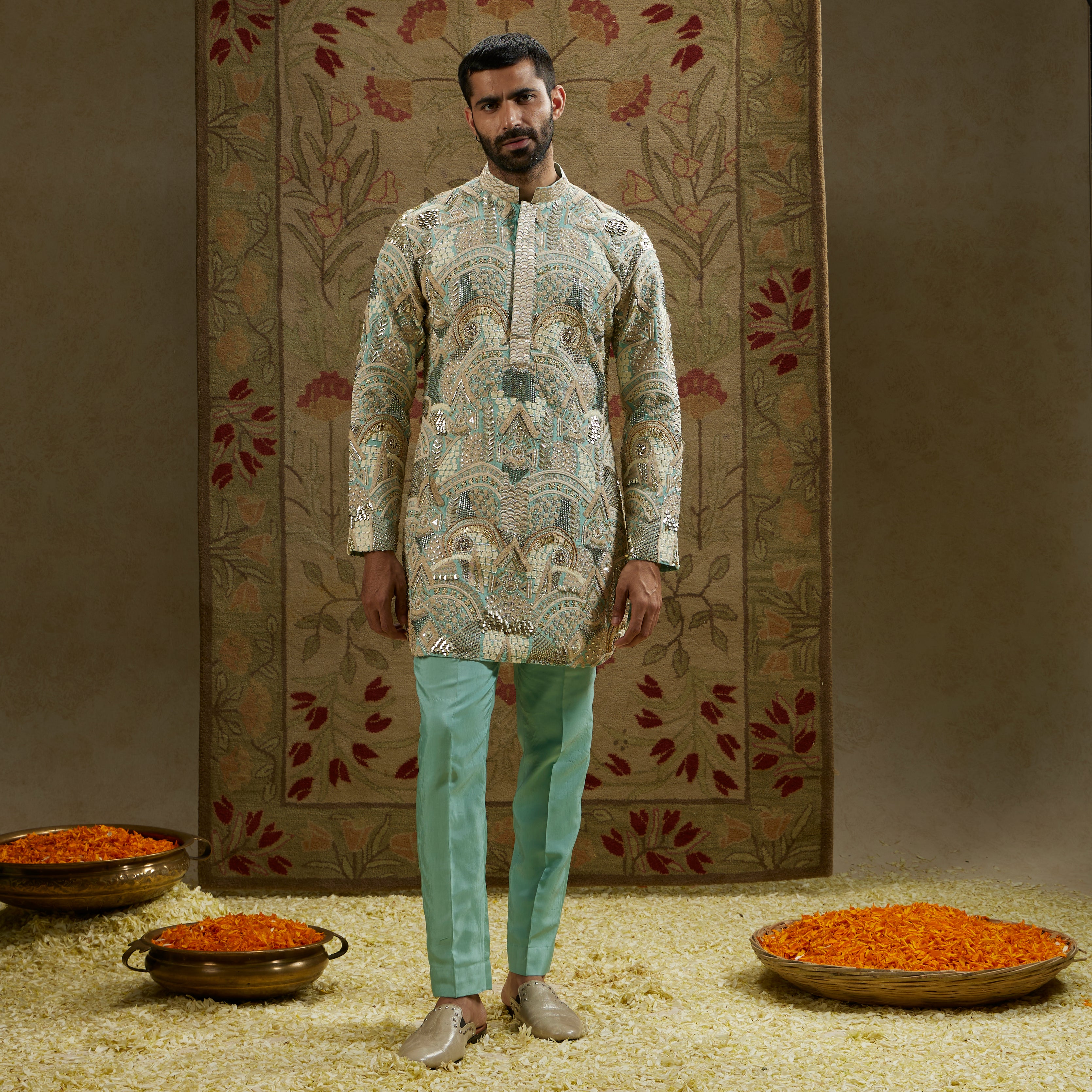 Featuring a blue embellished kurta set.