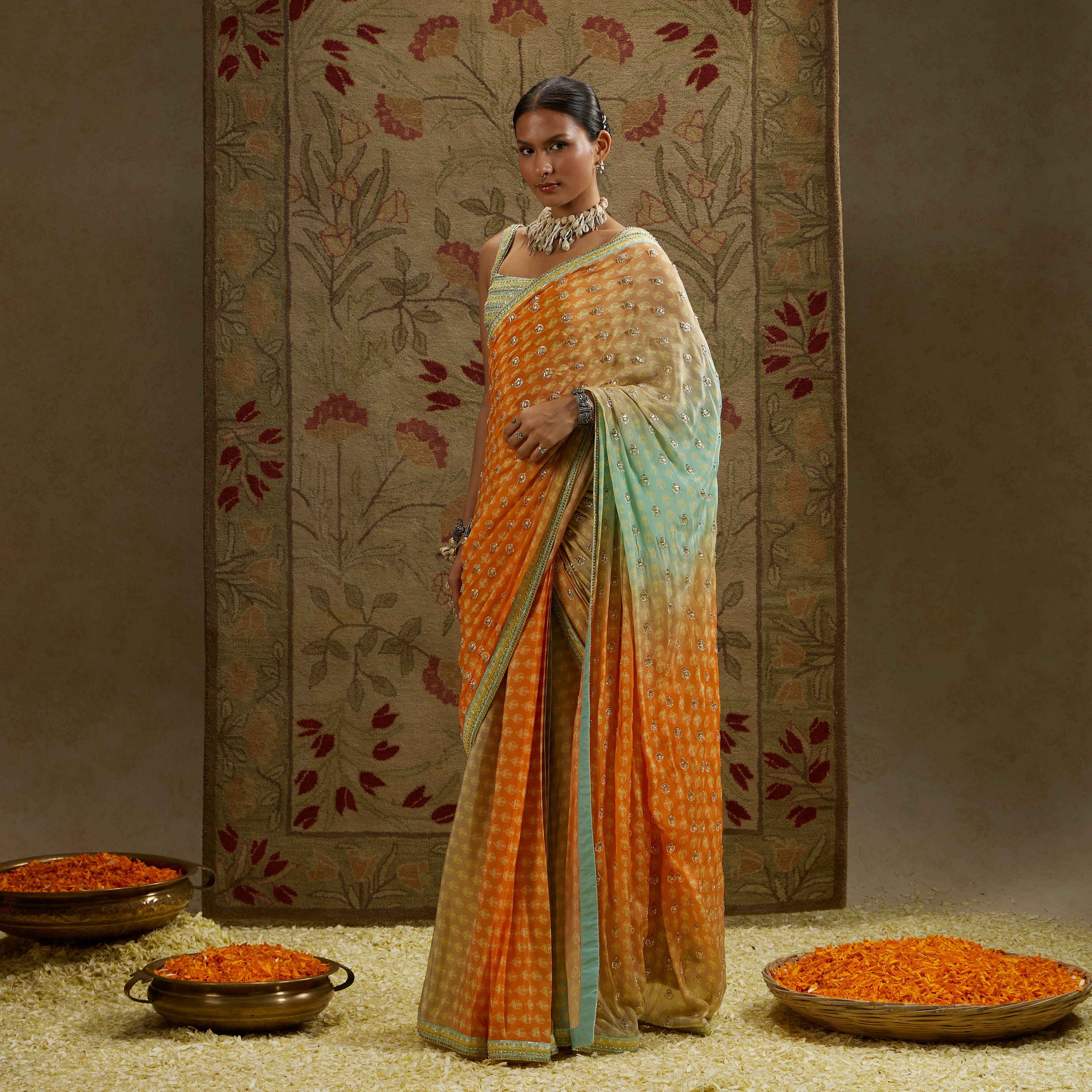 ORANGE BLUE OMBRE EMBELLISHED CASCADE SAREE PAIRED WITH EMBELLISHED BUSTIER.