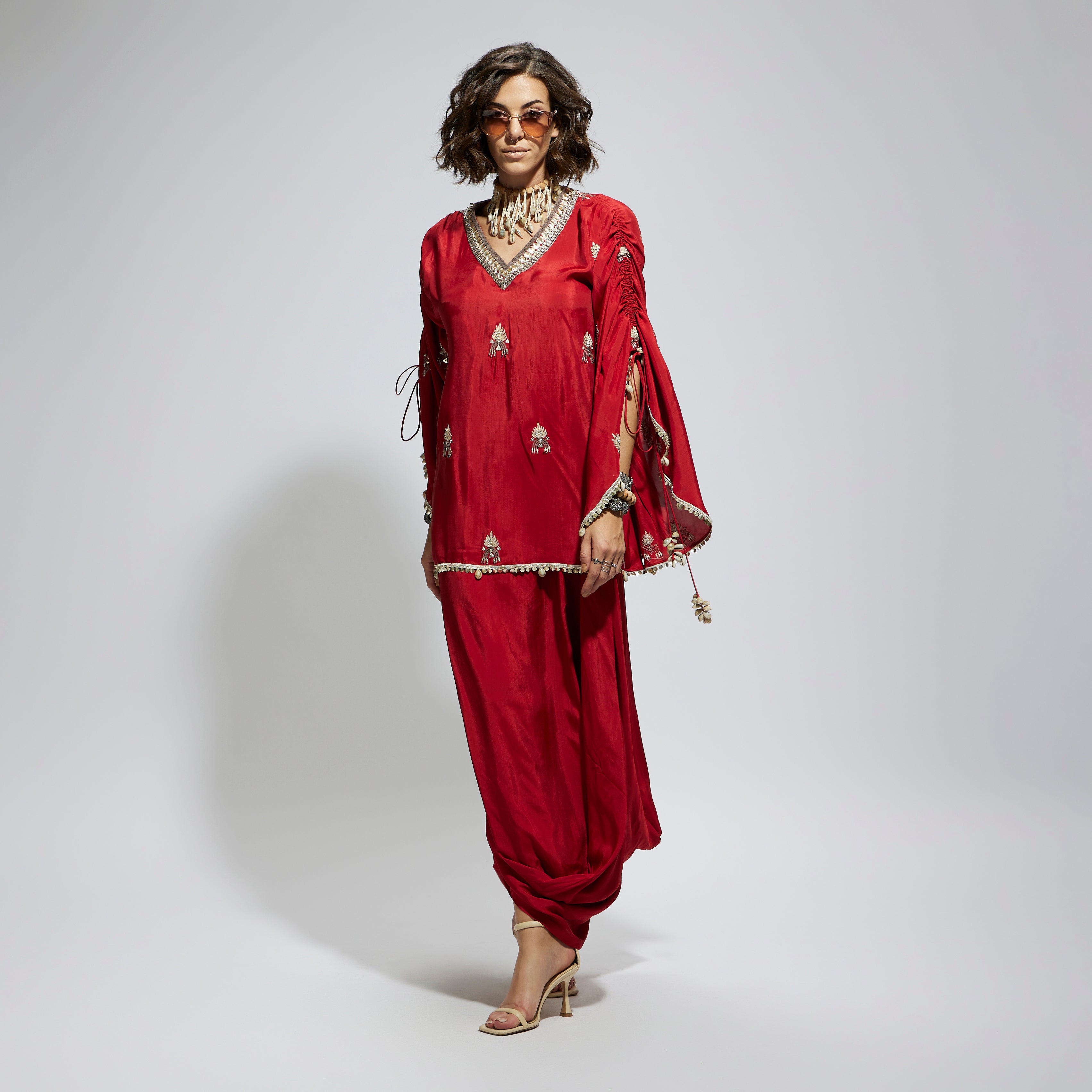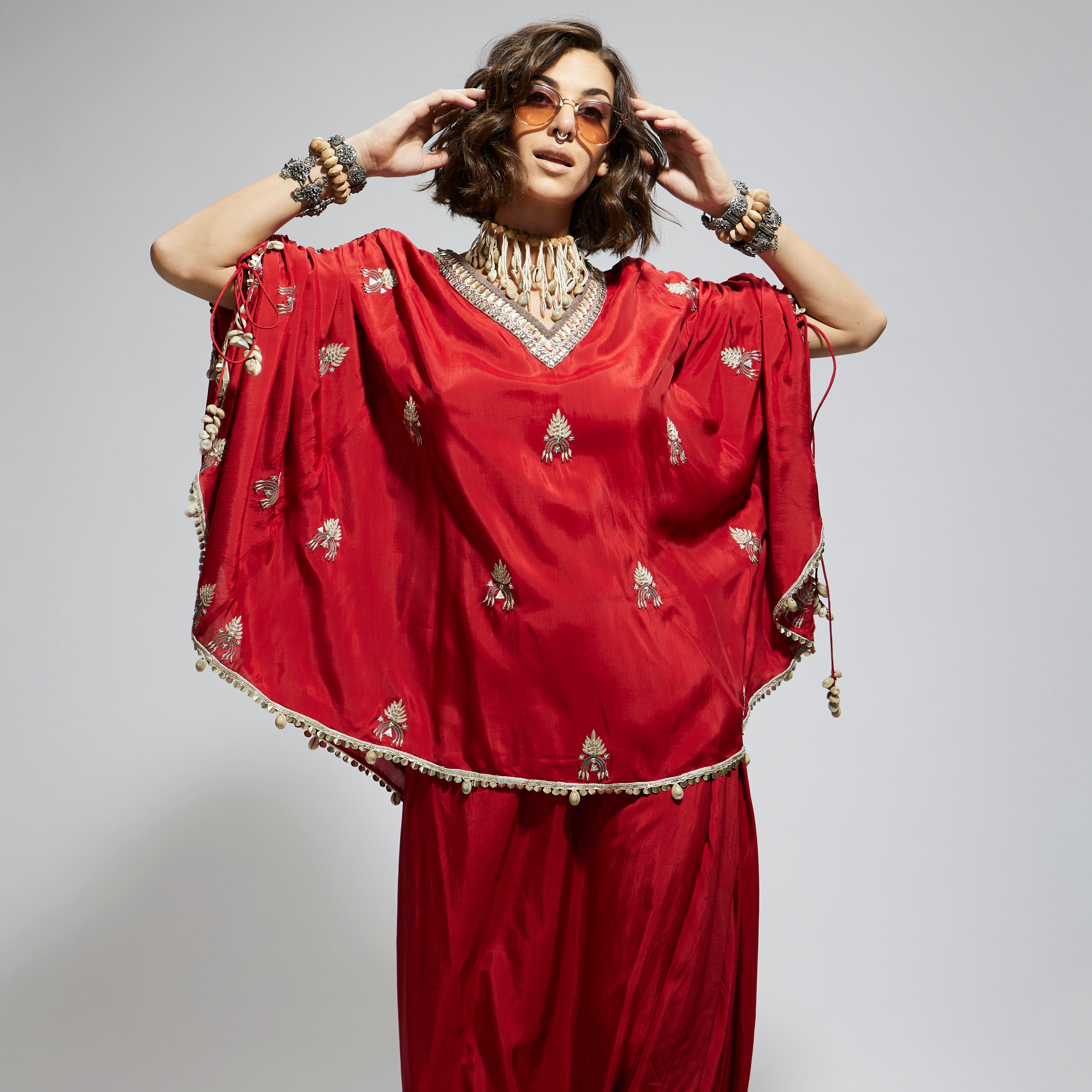 TERRACOTTA EMBELLISHED CAPE TOP PAIRED WITH TERRACOTTA DRAPE SKIRT
