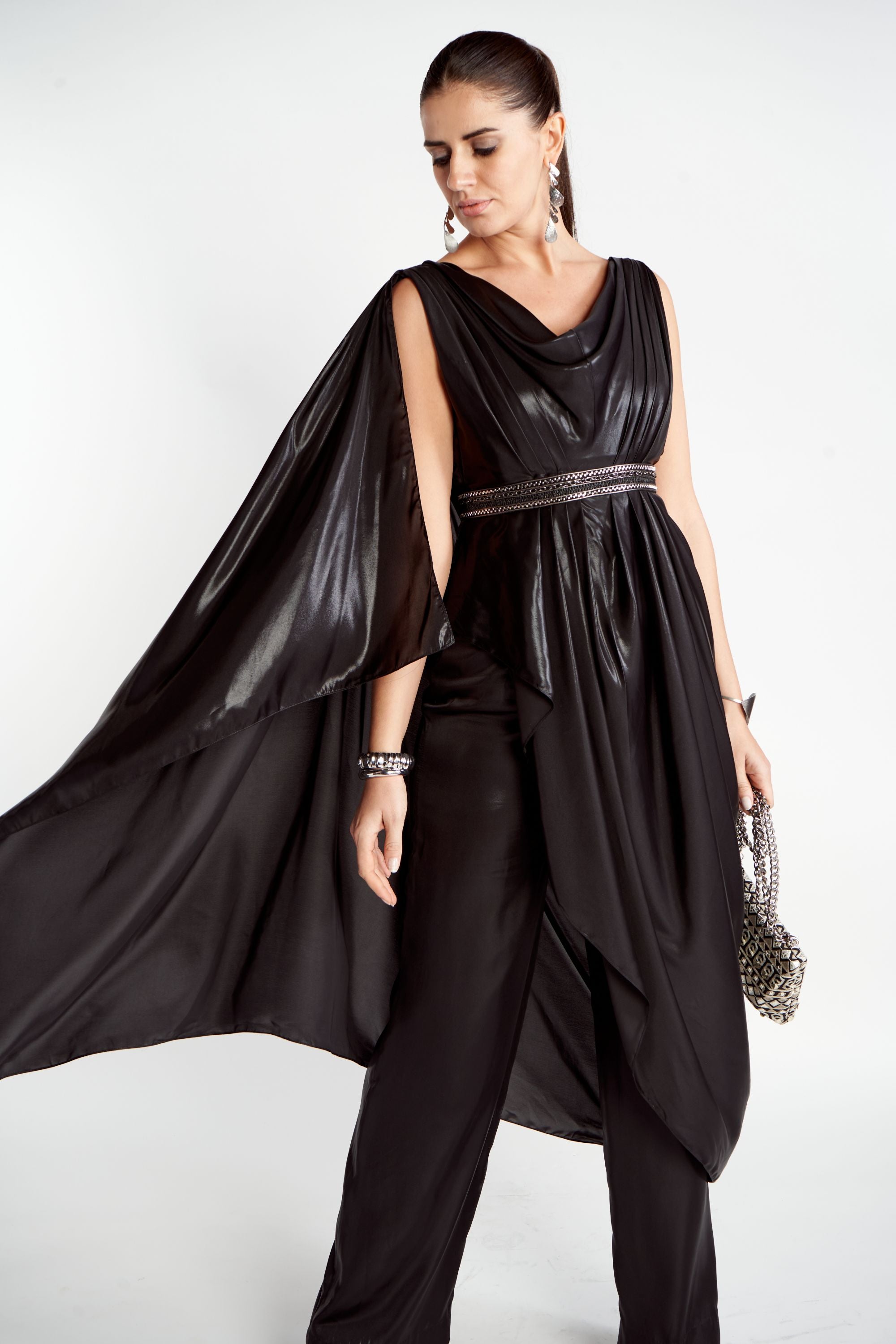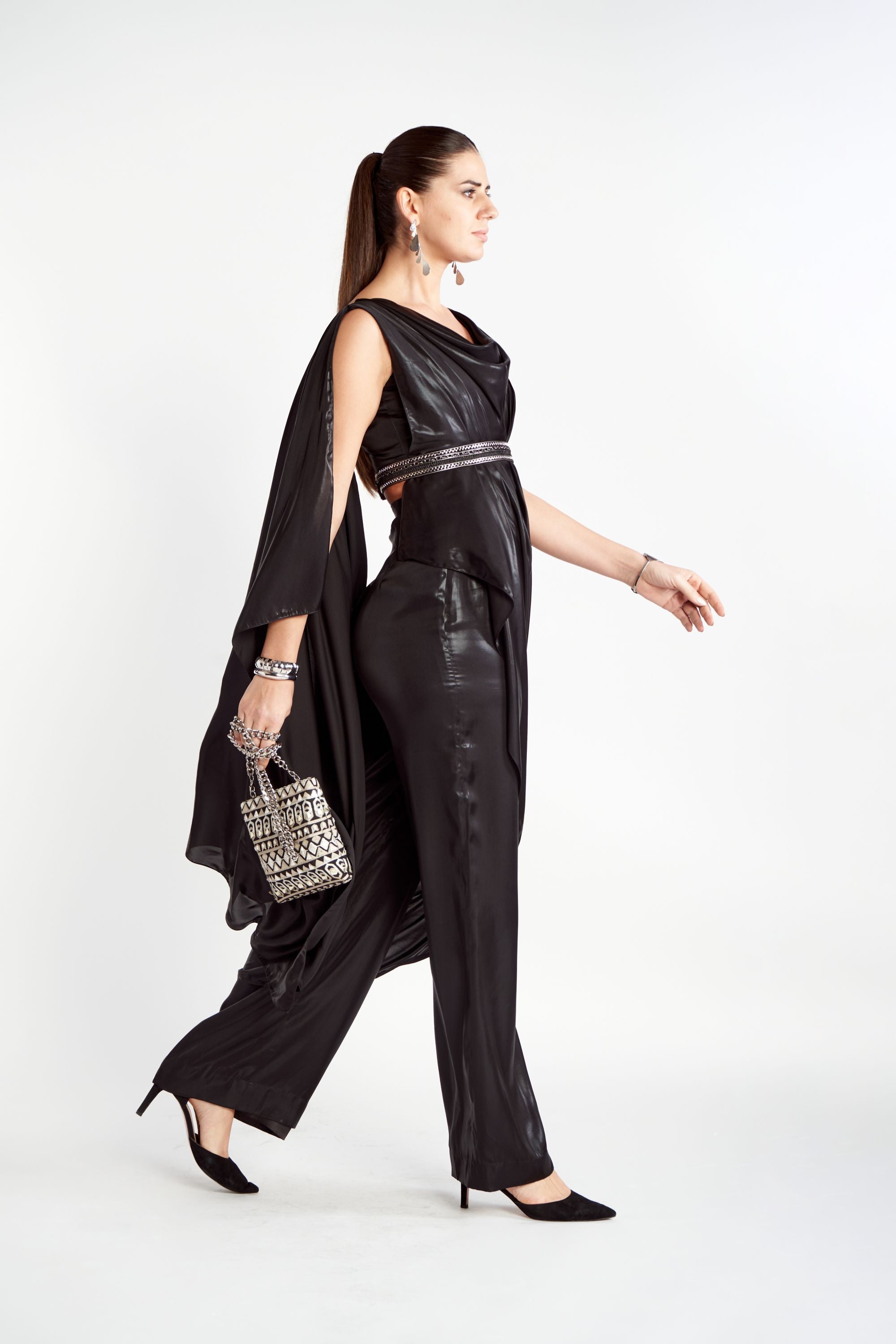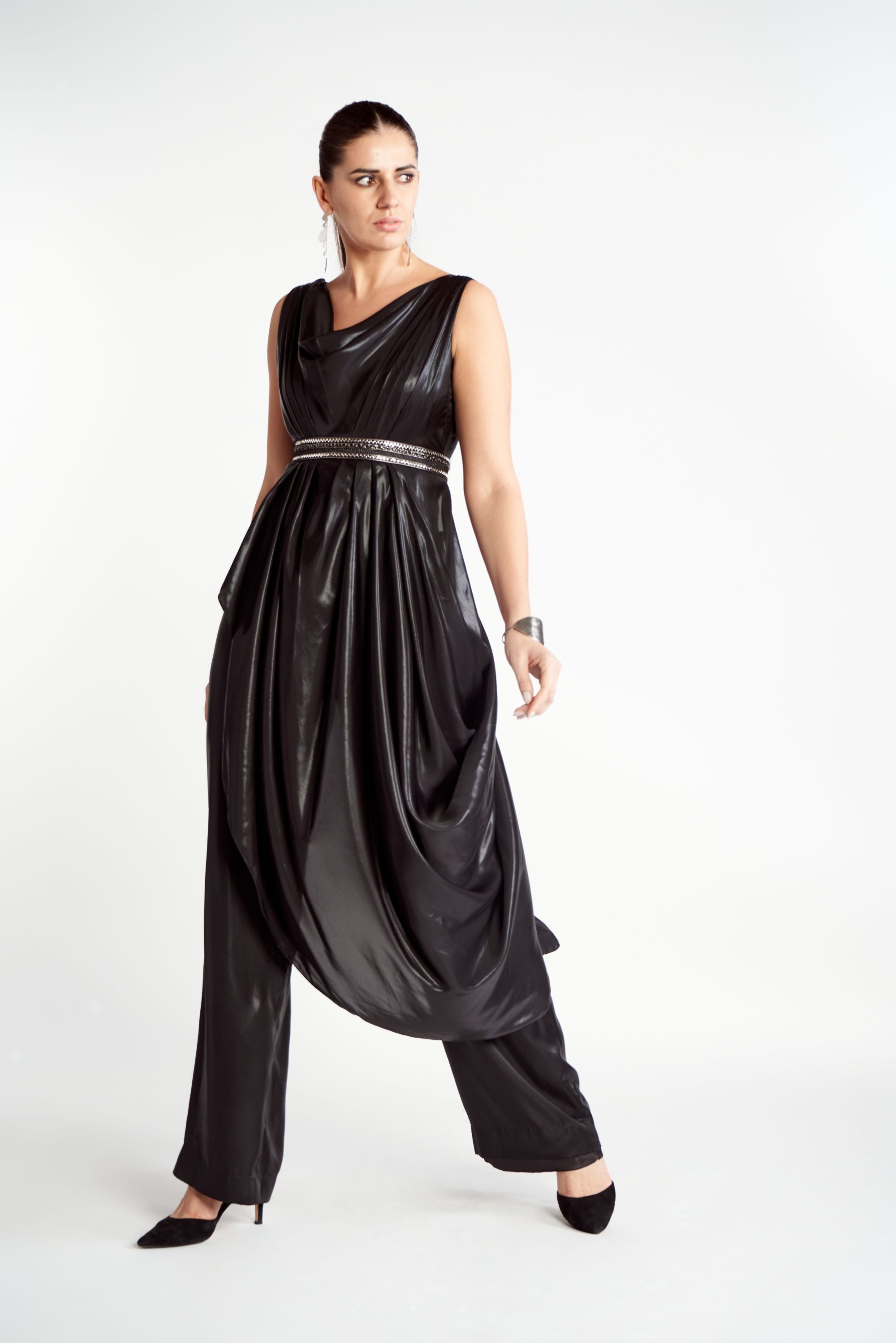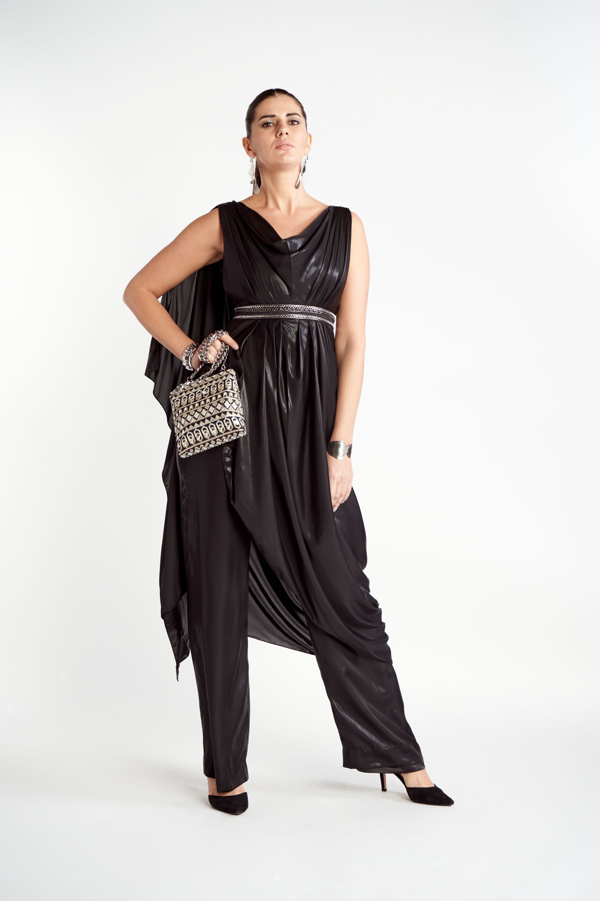 Step into edgy sophistication with this Draped Leather Dress Set, crafted from premium leather fabric for a sleek and modern look. The dress features an elegant draped design that flatters the silhouette, paired perfectly with tailored pants for a contemporary ensemble. Adding a touch of glamour, the set is completed with a metallic embroidered belt