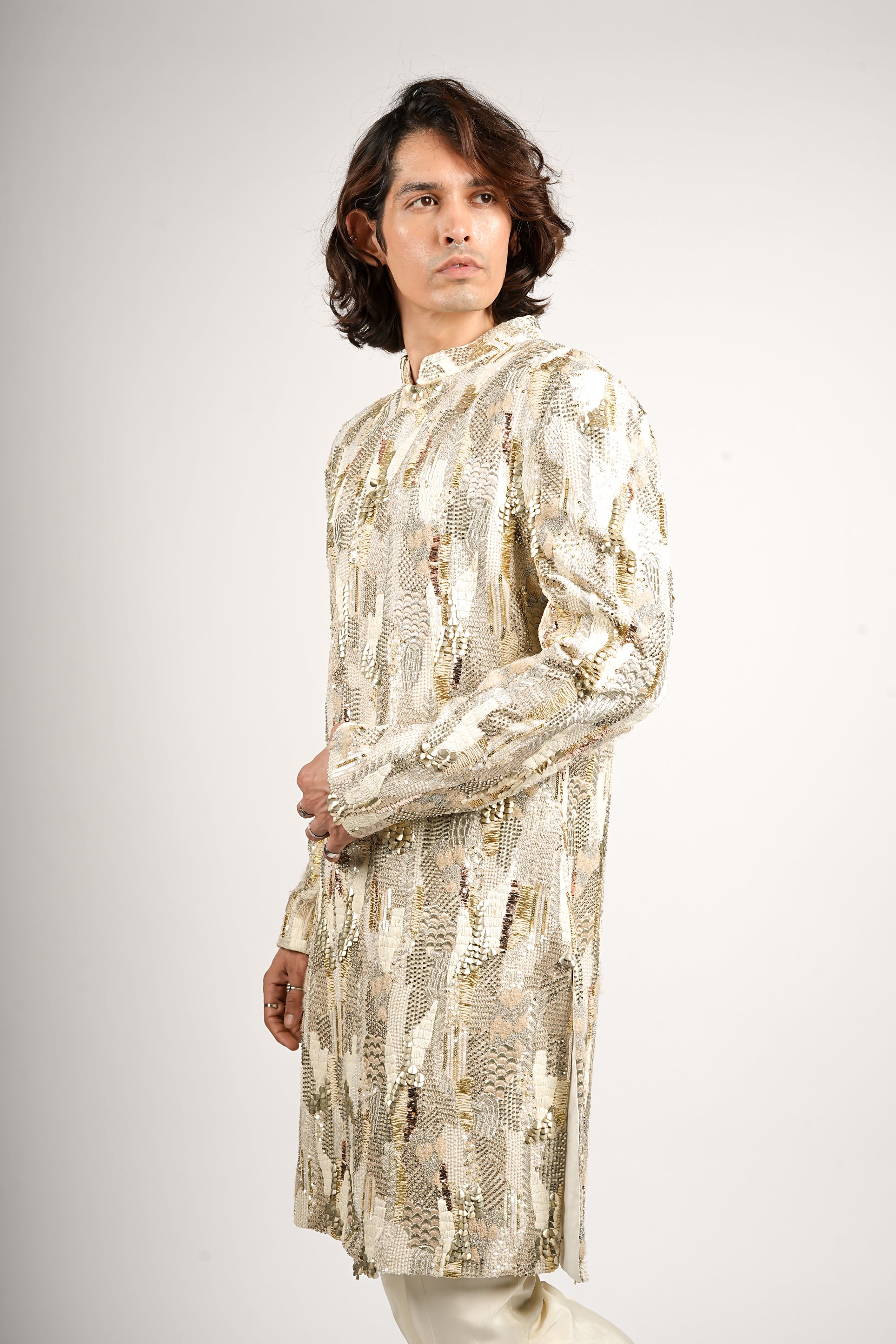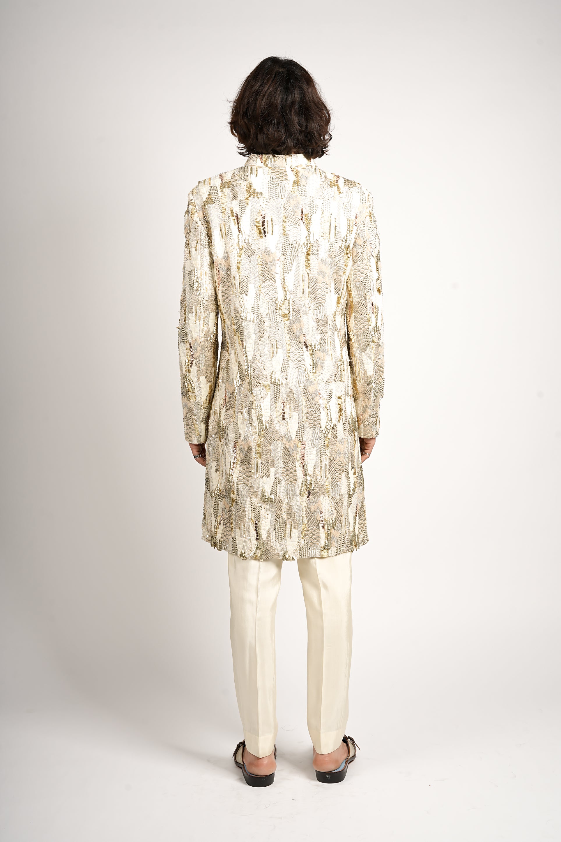 This statement sherwani set features a long, high-collar coat entirely covered in a dazzling, abstract pattern of gold and cream studs and threadwork. The highly embellished sherwani is balanced by crisp ivory tailored pants, resulting in a lavish, show-stopping look for any grand festive or wedding occasion.