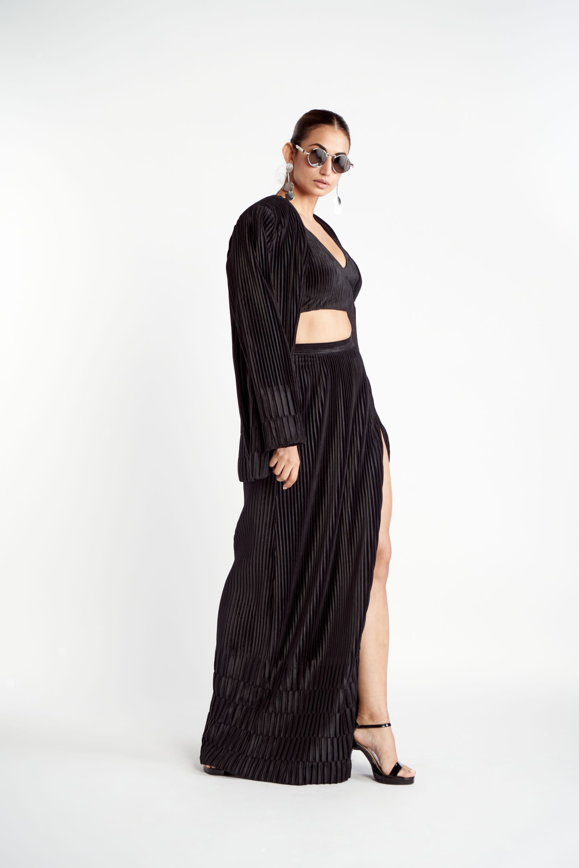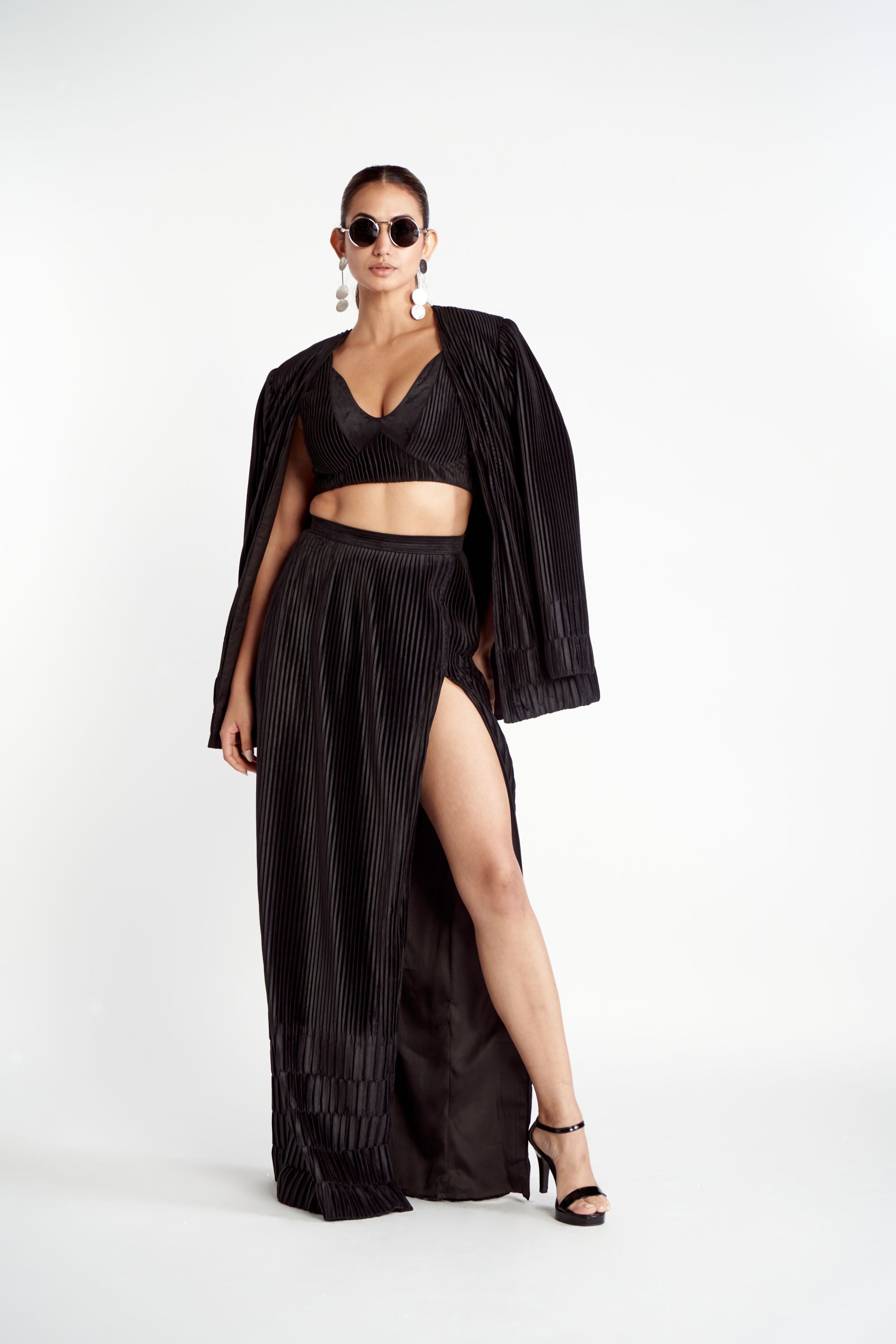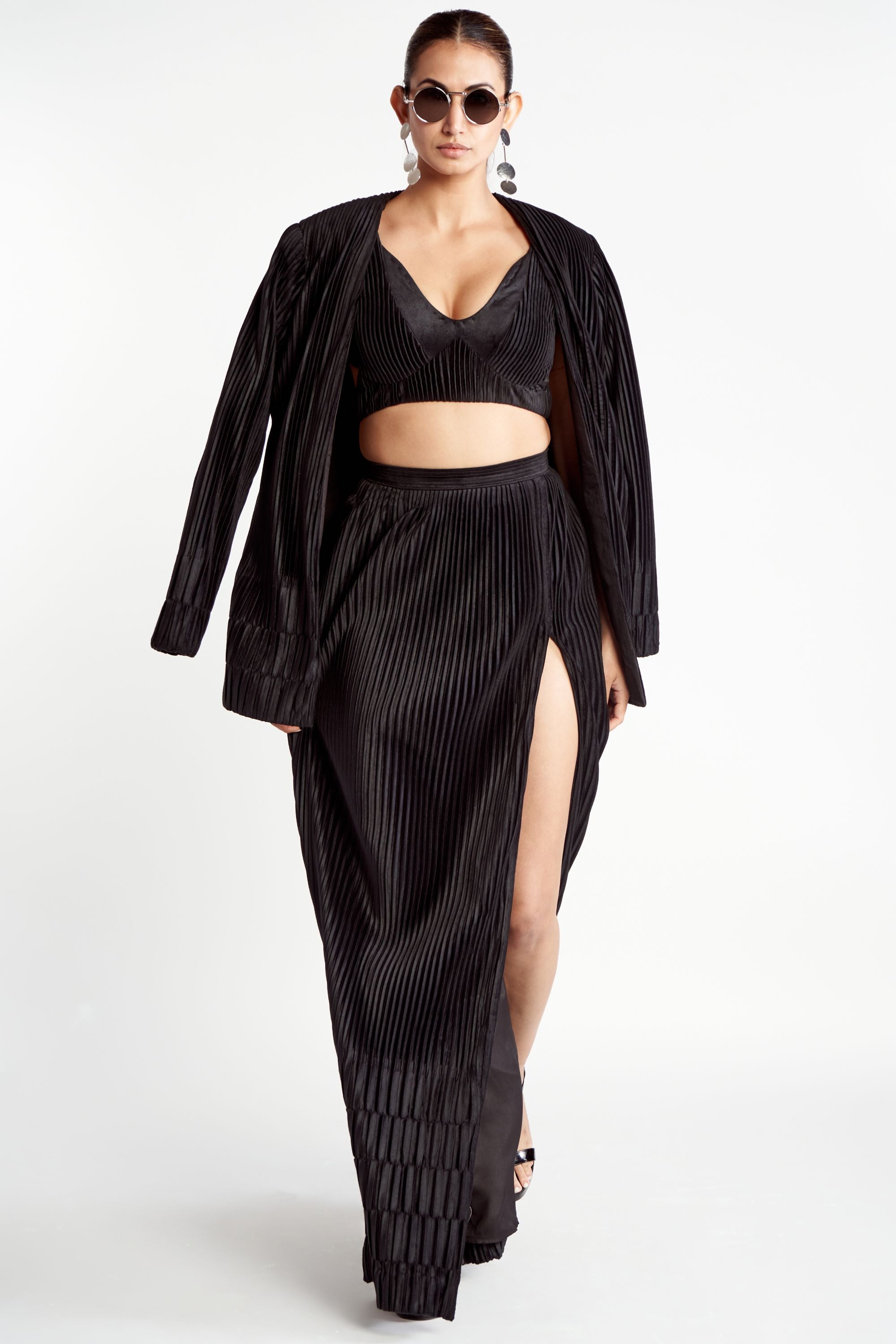 This set features a blouse and skirt, both crafted from premium pre-pleated velvet, offering a unique texture and a sophisticated finish. The meticulously designed pleating adds depth and movement, enhancing the overall look. Completing the ensemble is a matching pre-pleated velvet jacket, creating a cohesive and refined outfit.