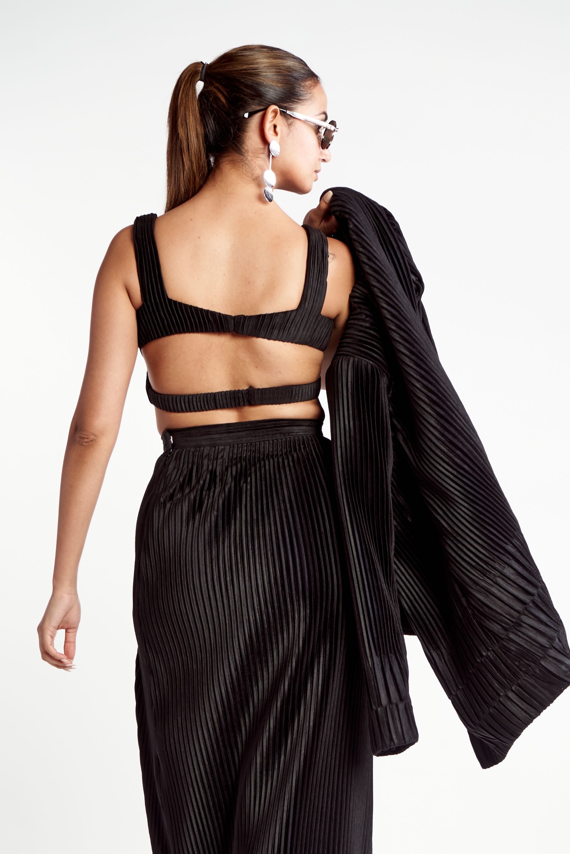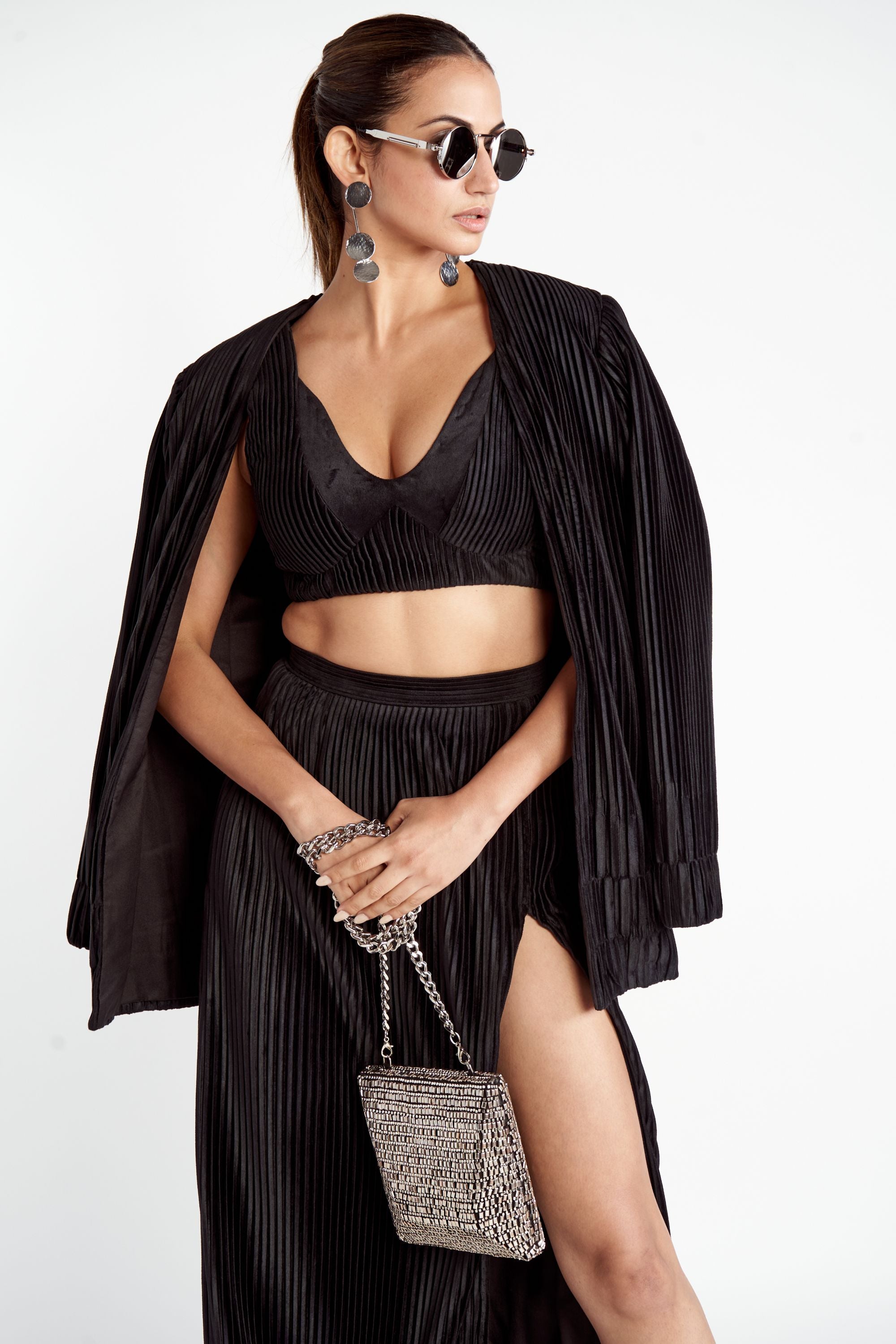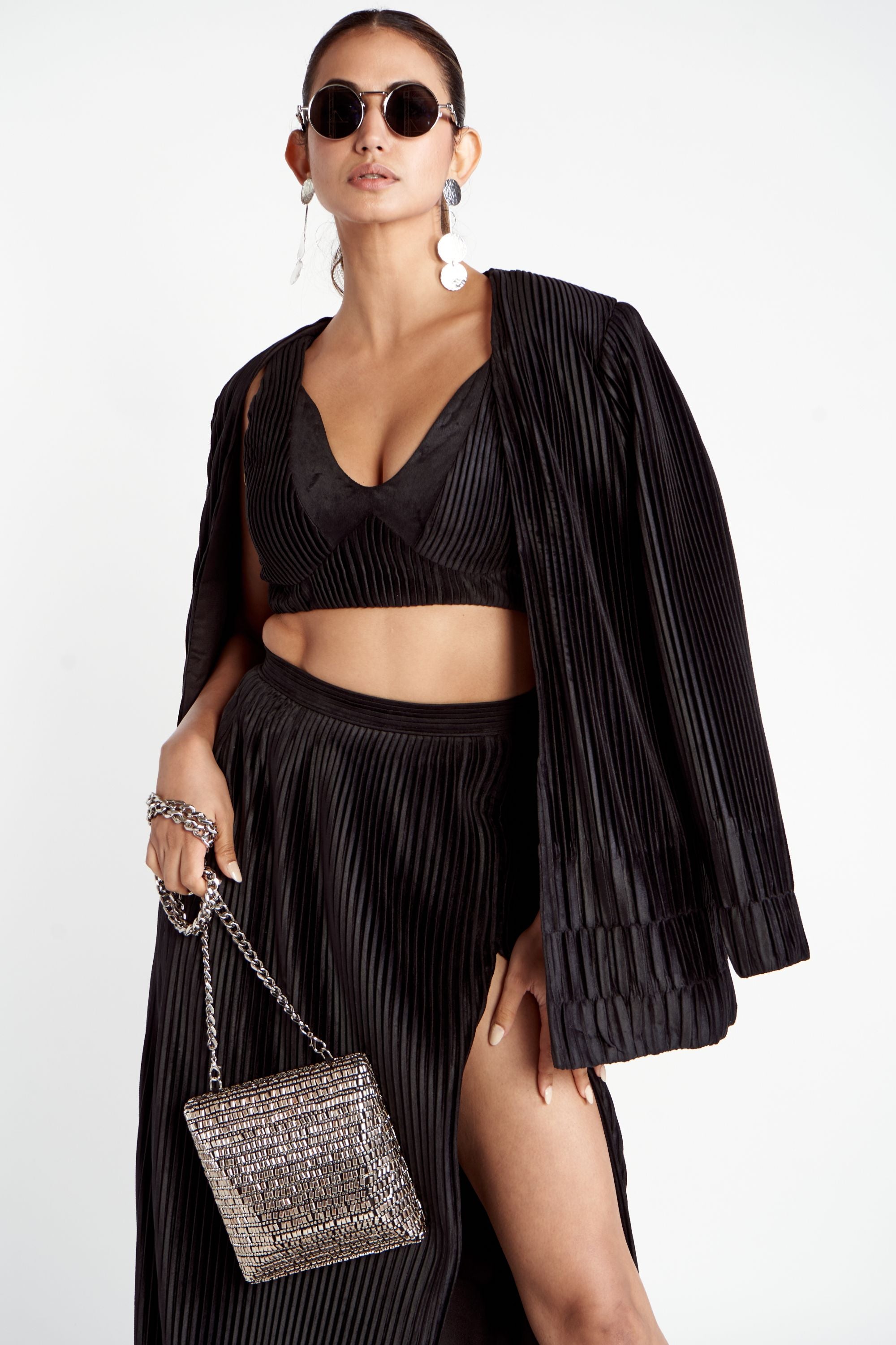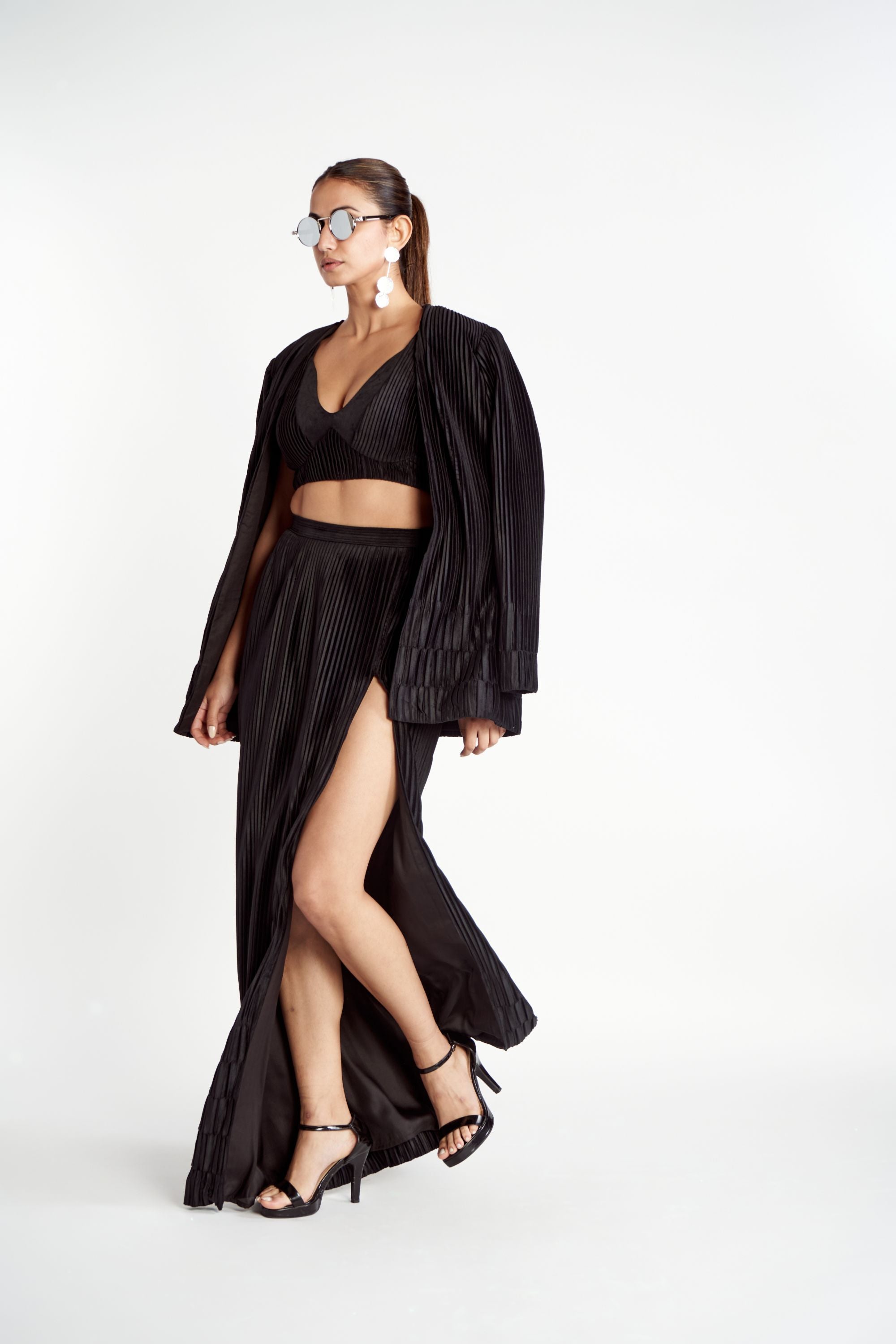 This set features a blouse and skirt, both crafted from premium pre-pleated velvet, offering a unique texture and a sophisticated finish. The meticulously designed pleating adds depth and movement, enhancing the overall look. Completing the ensemble is a matching pre-pleated velvet jacket, creating a cohesive and refined outfit.