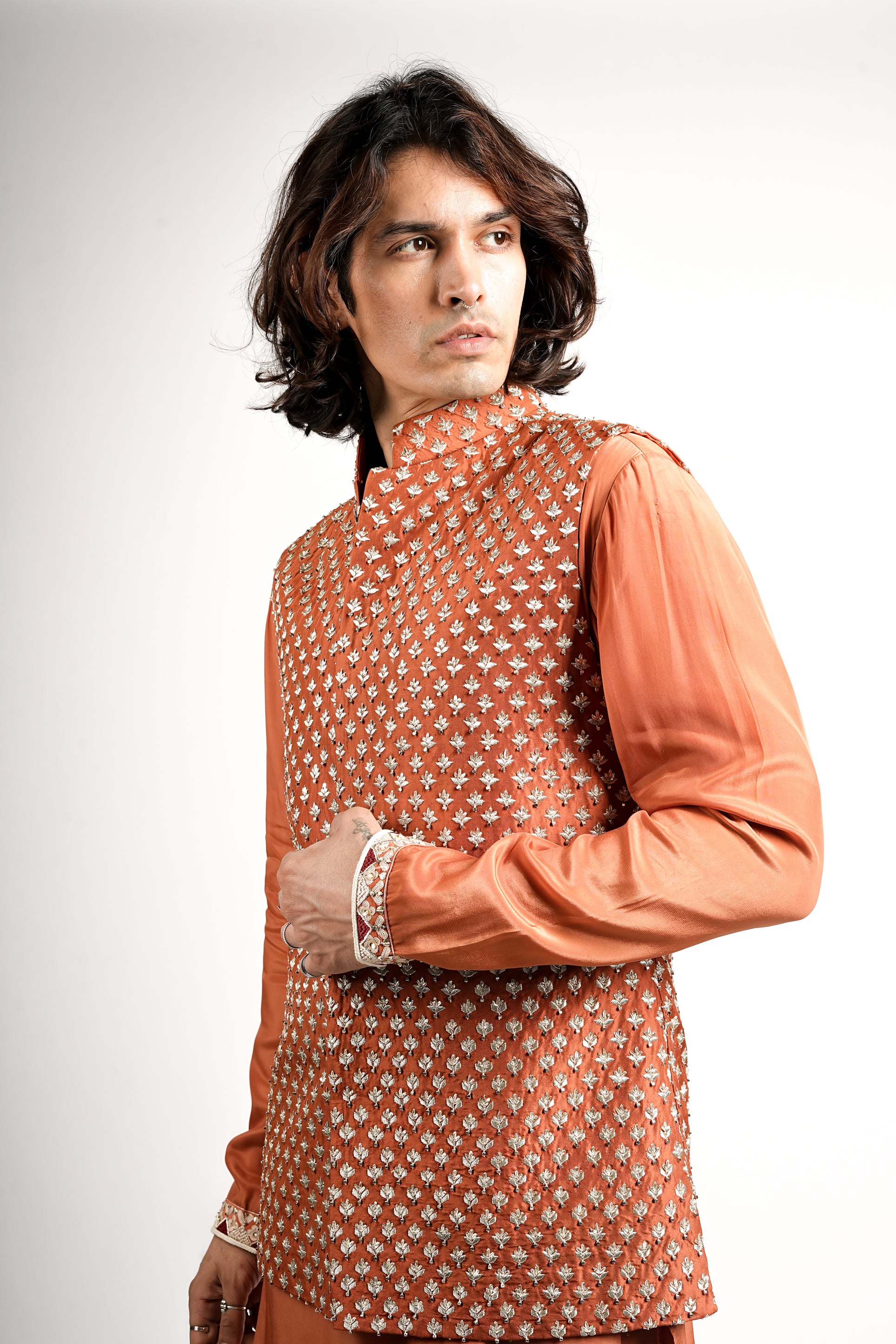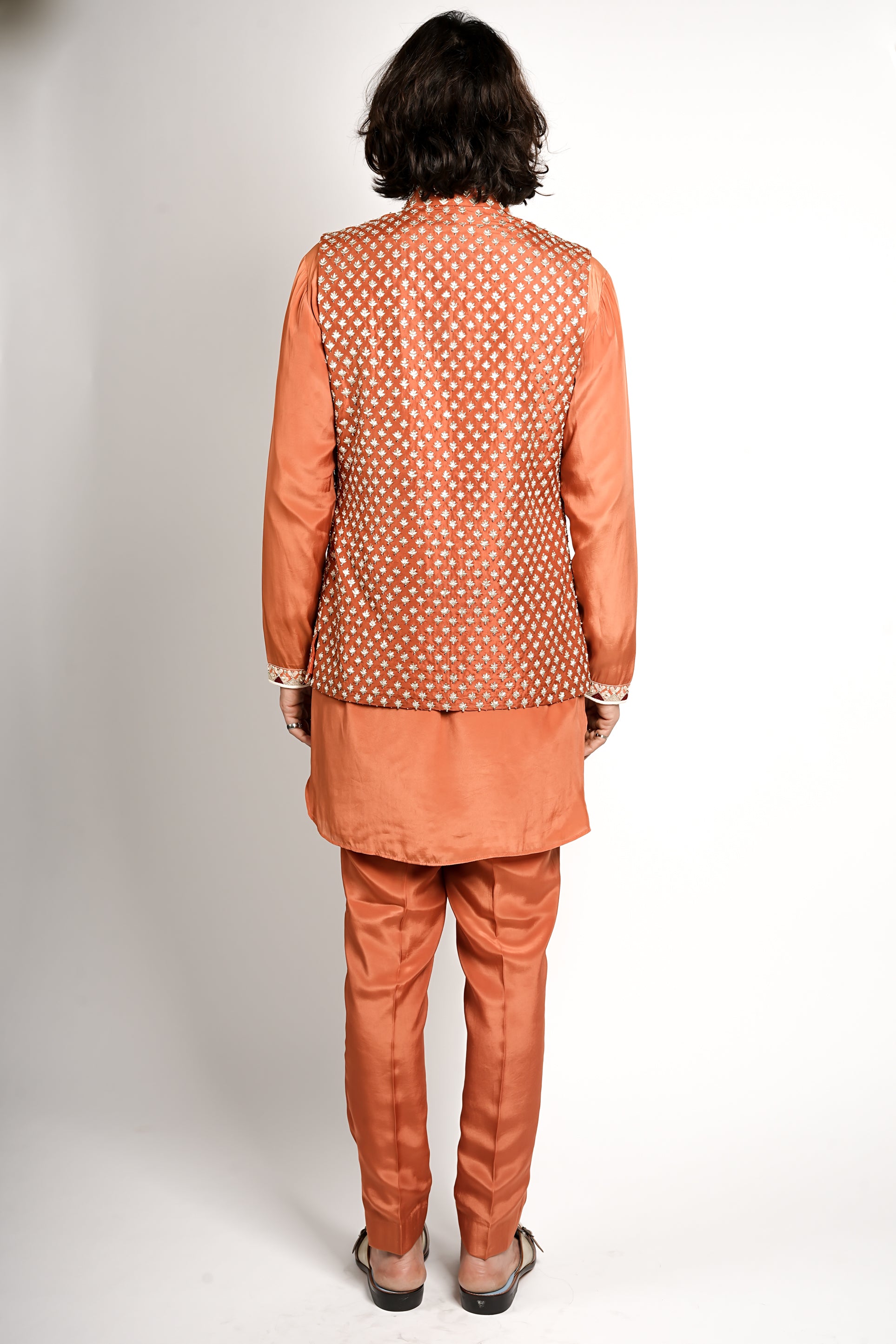 This layered ensemble features a monochromatic rust shade, a long-sleeved kurta with embroidered cuffs and collar and matching tailored trousers. This is topped with a matching bundi, covered in a detailed floral embroidered motif, creating a rich, festive, and layered look.