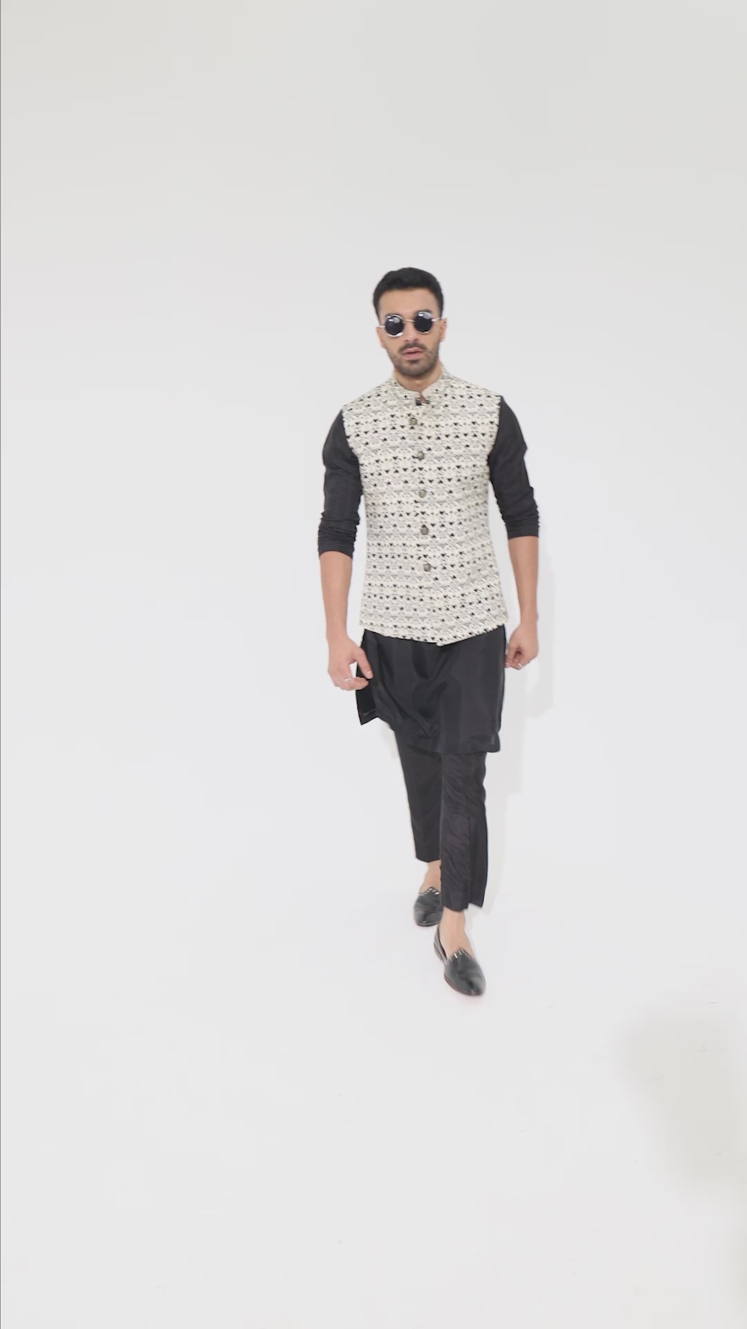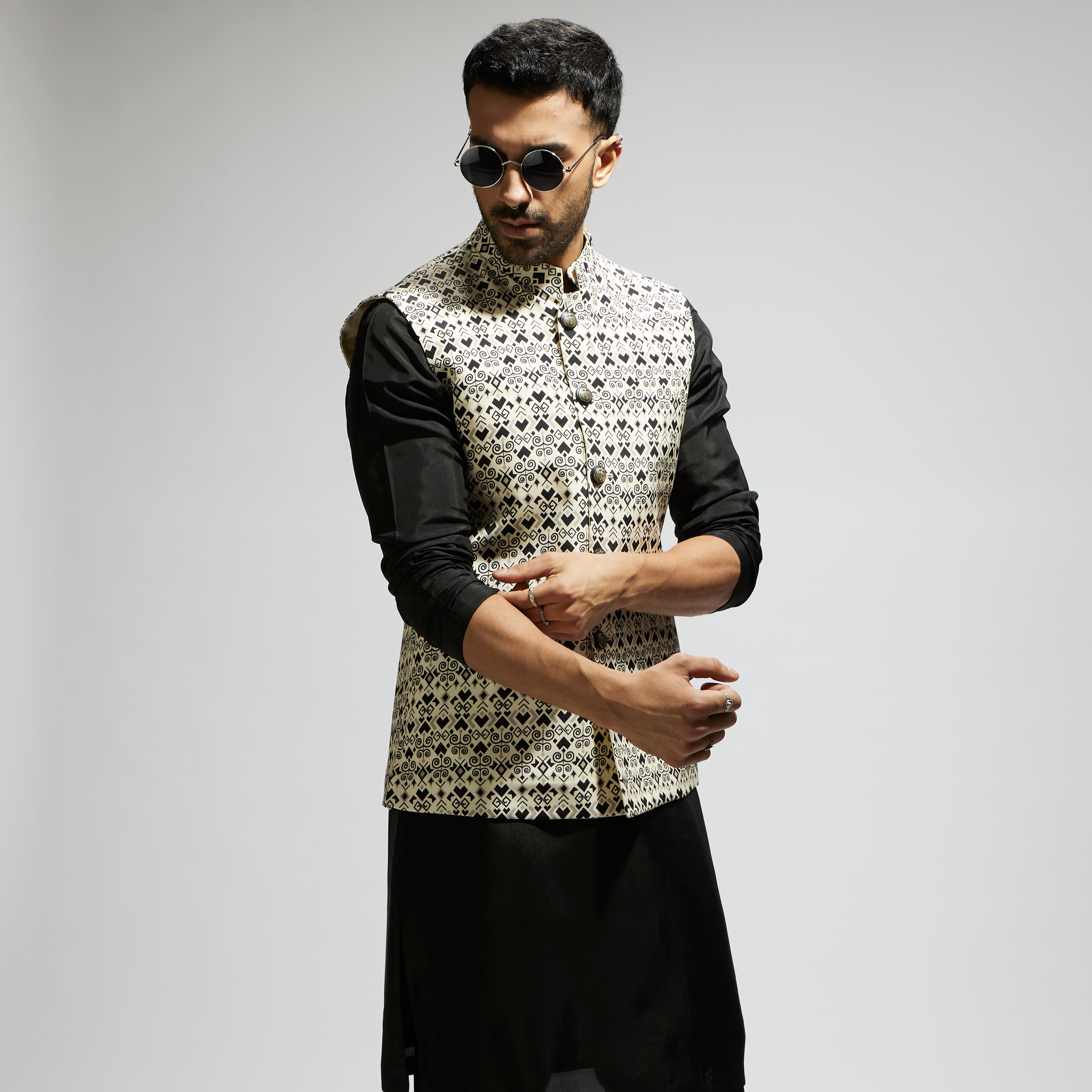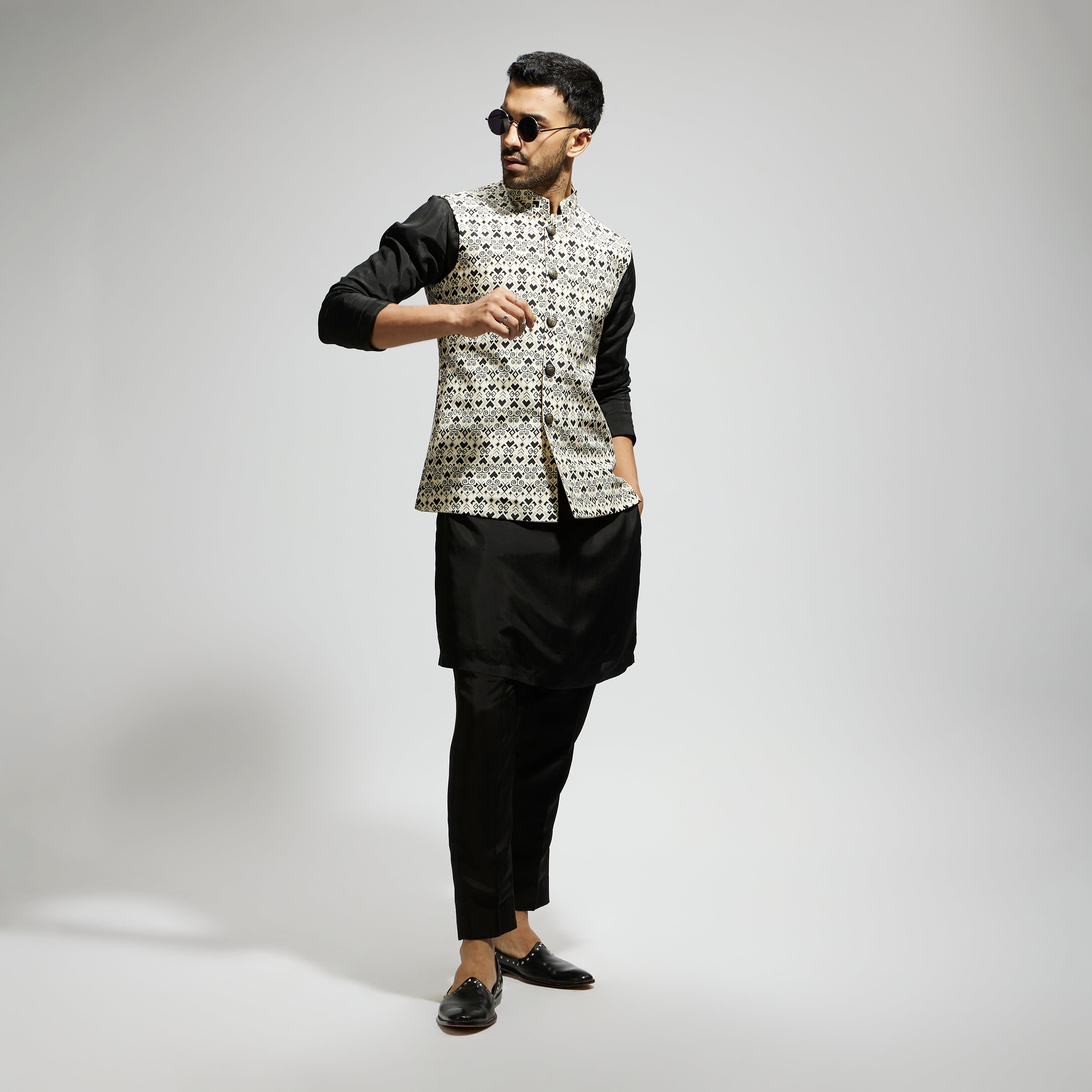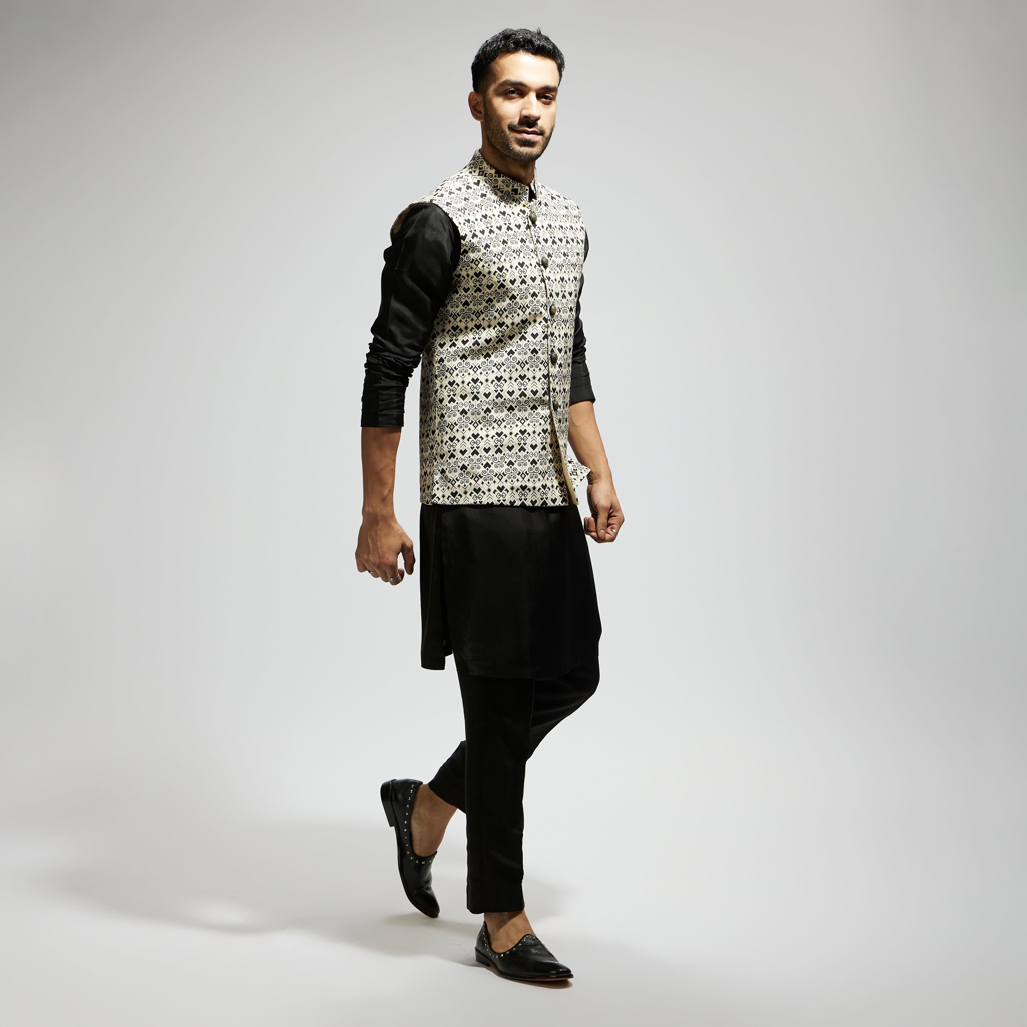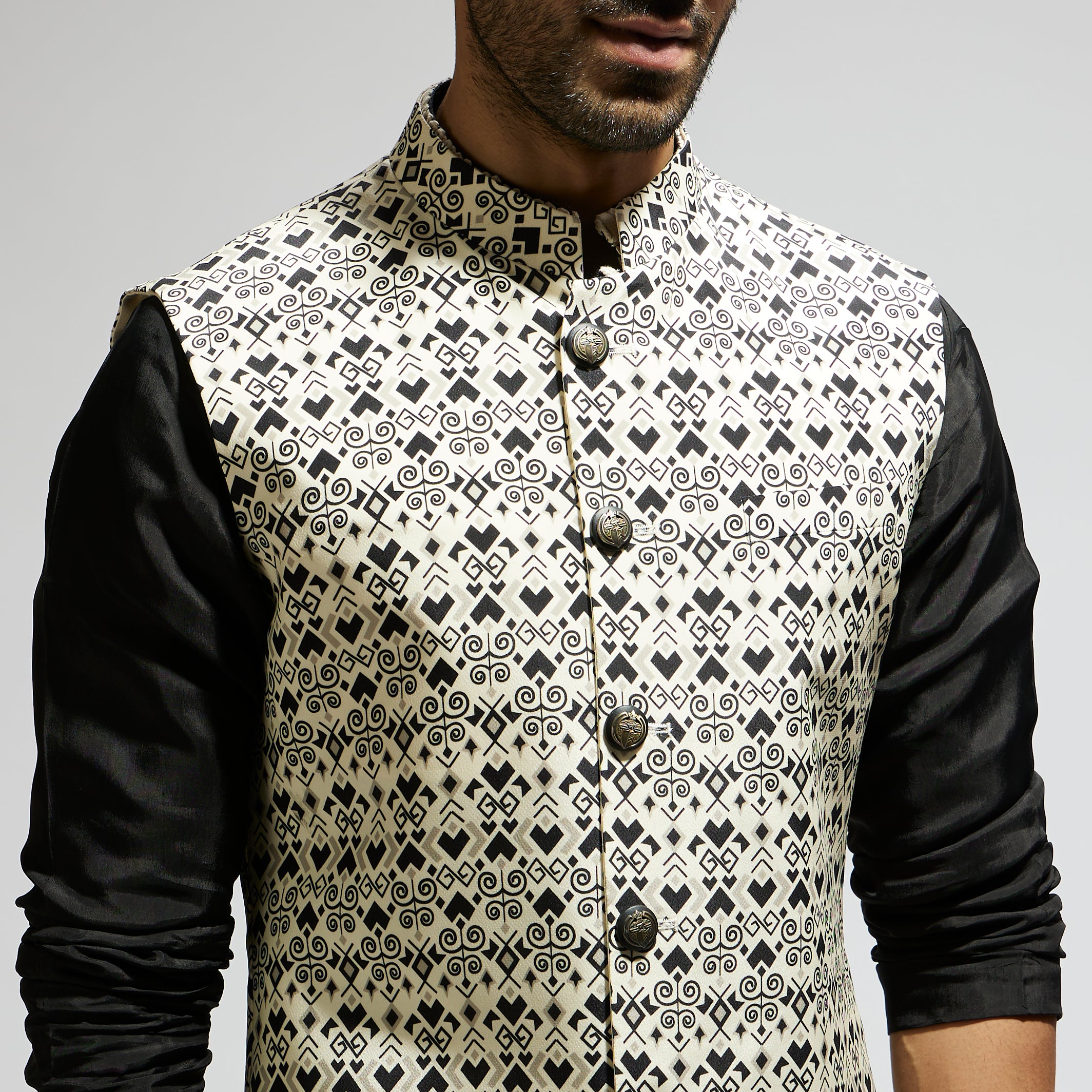 Featuring an white geo printed bundi black kurta and pants, fabric crepe, component 2.