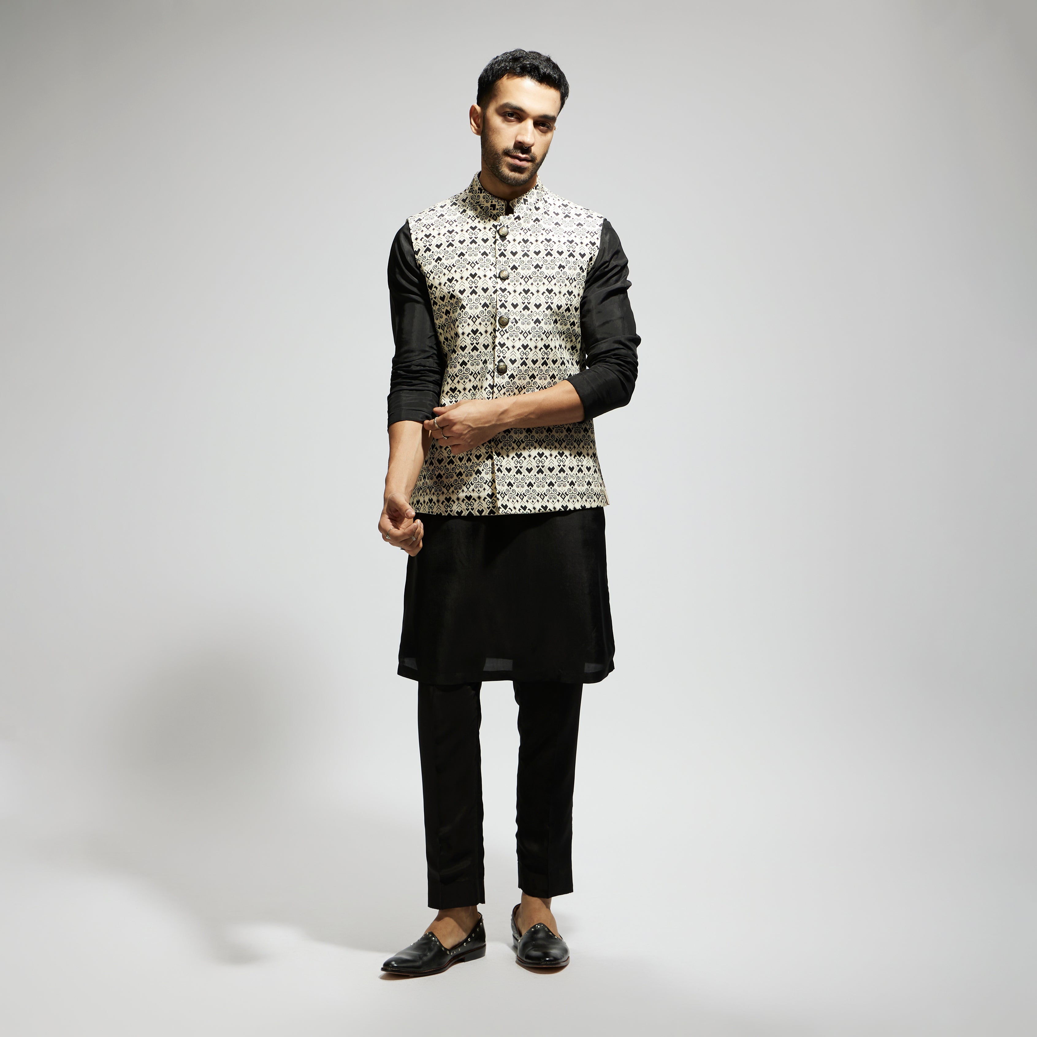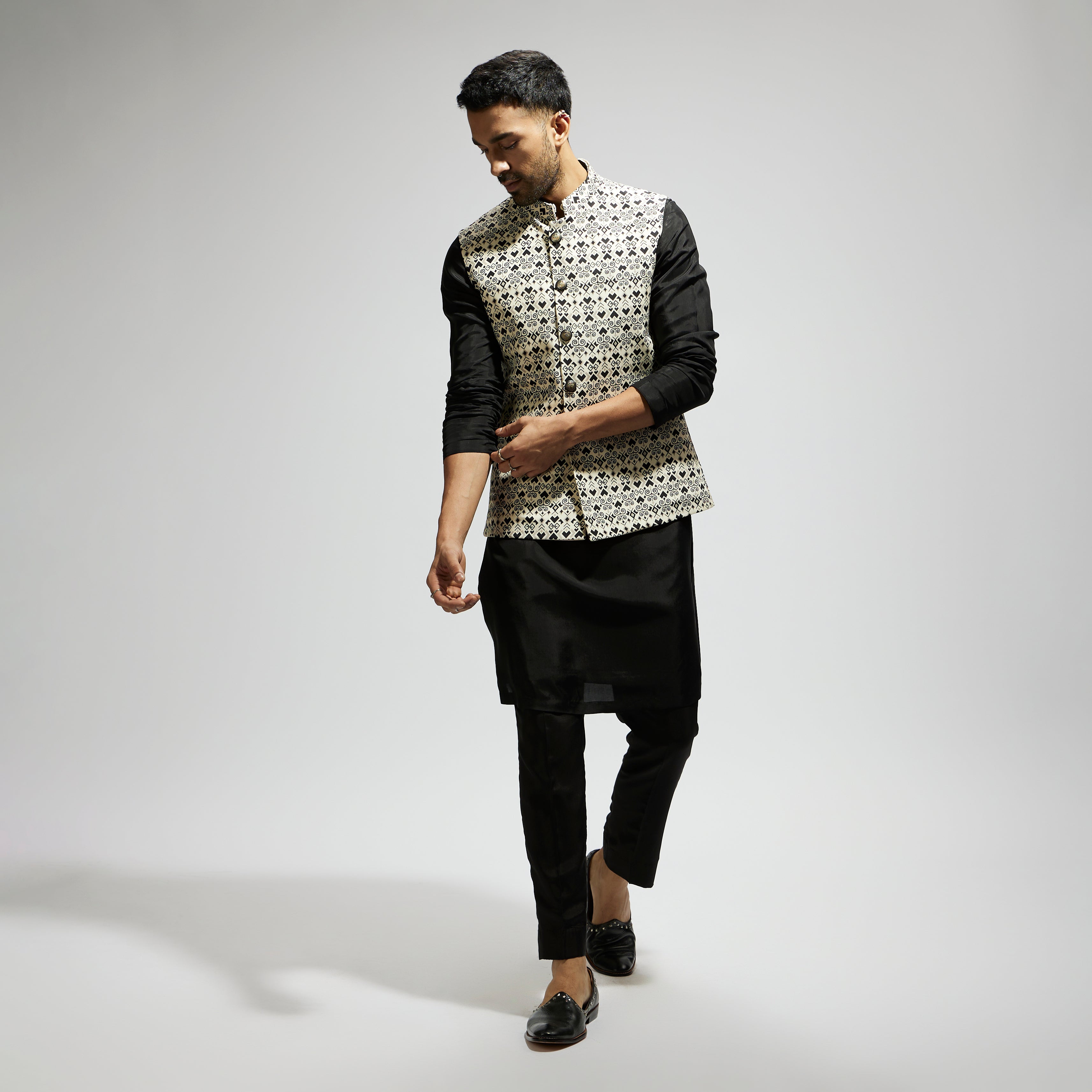 Featuring an white geo printed bundi, fabric crepe, component 1.