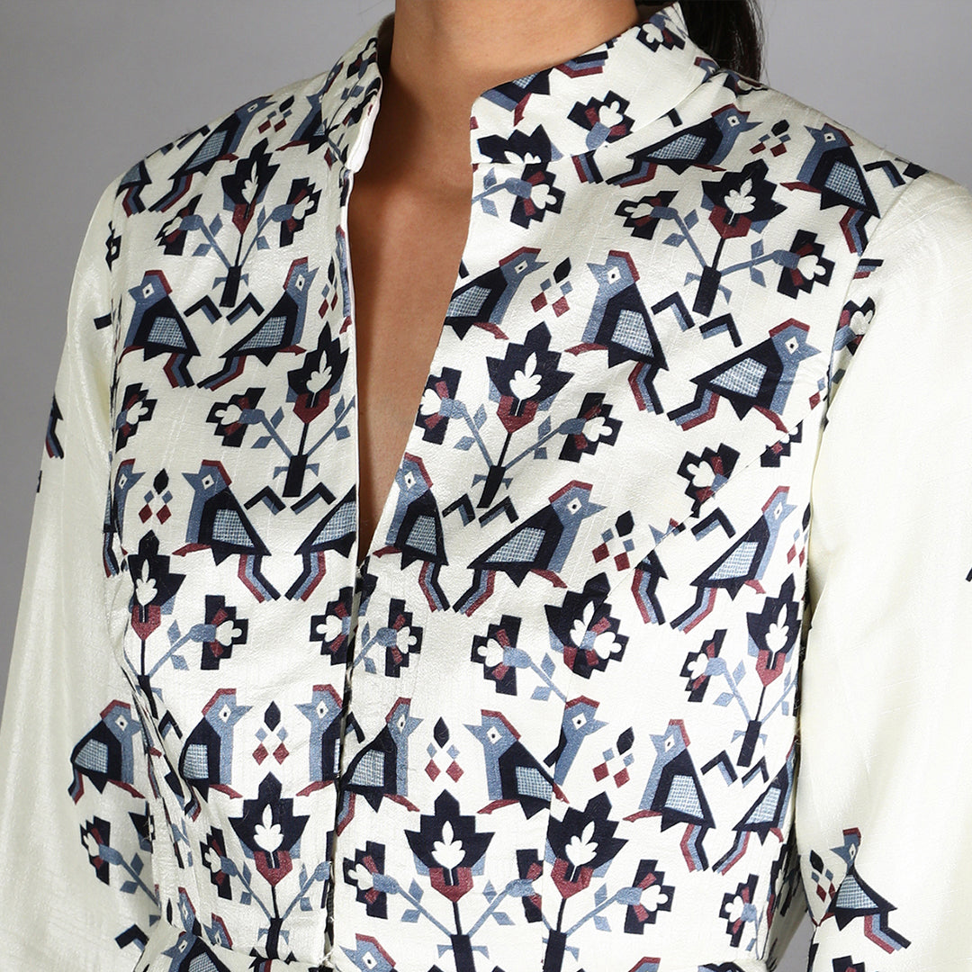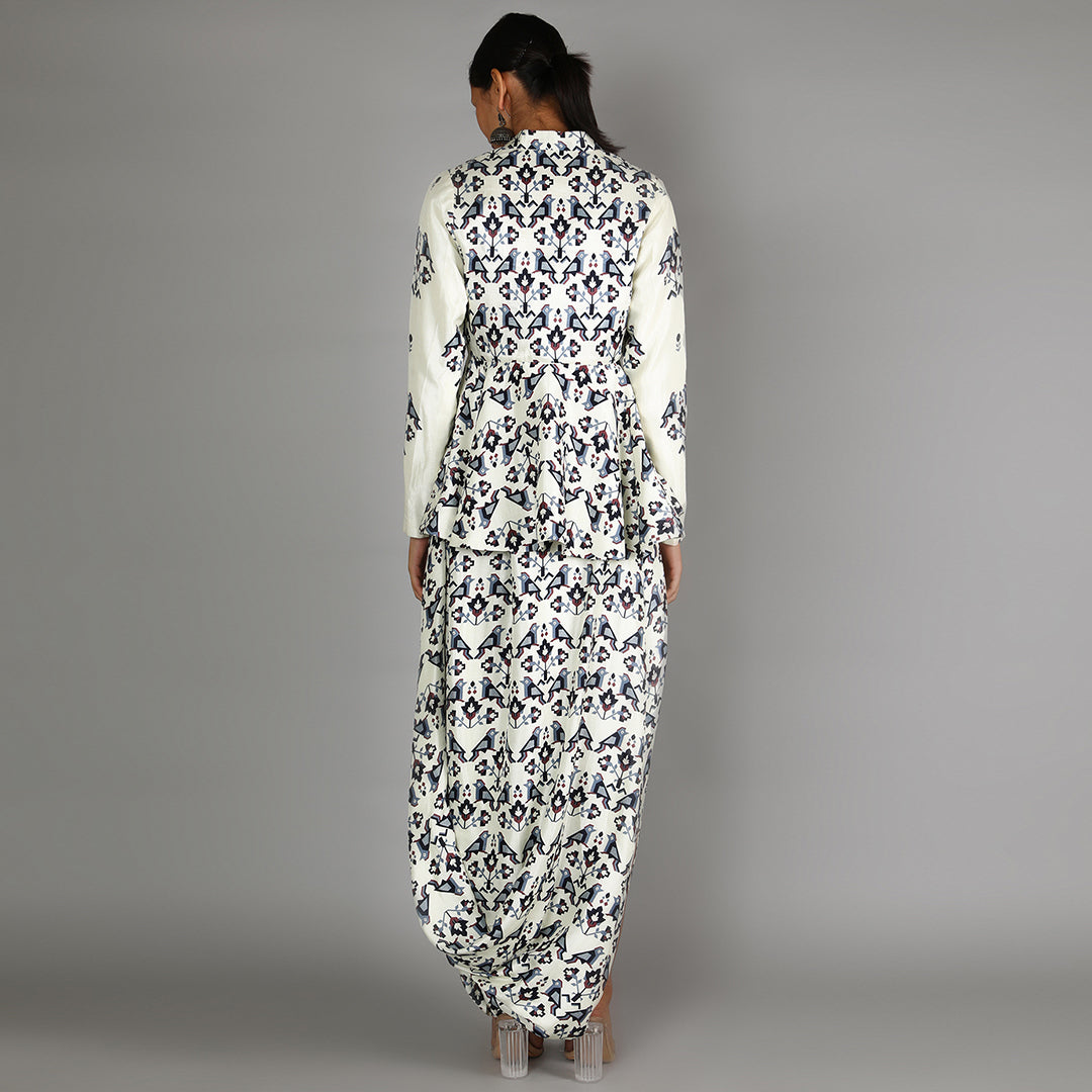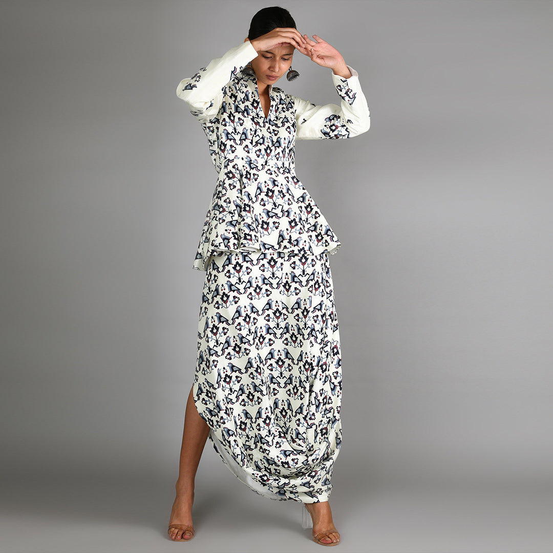 White Geometric Damask Print Peplum Paired With Printed Skirt